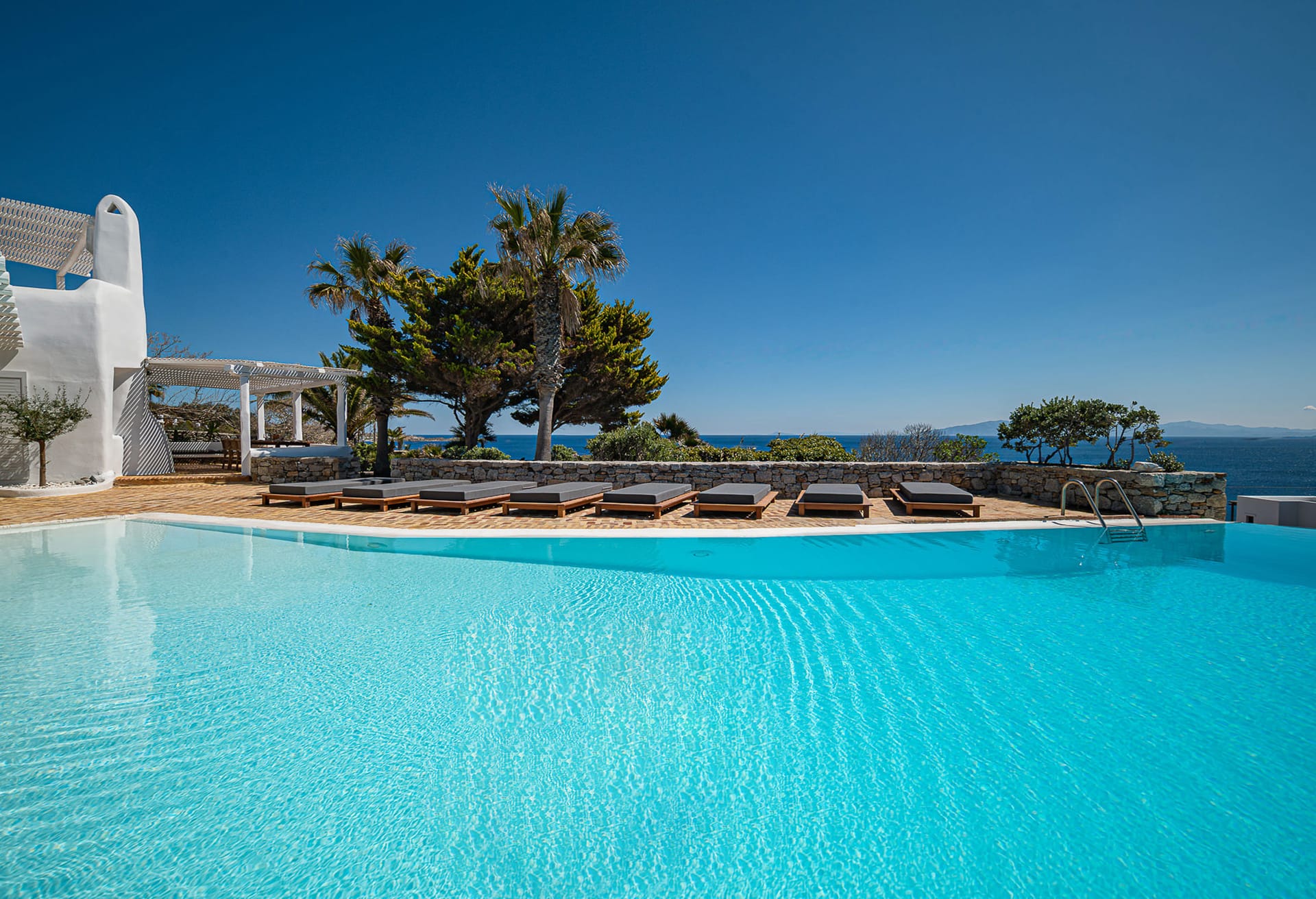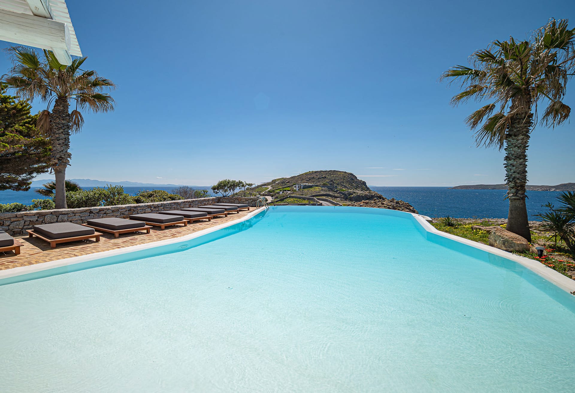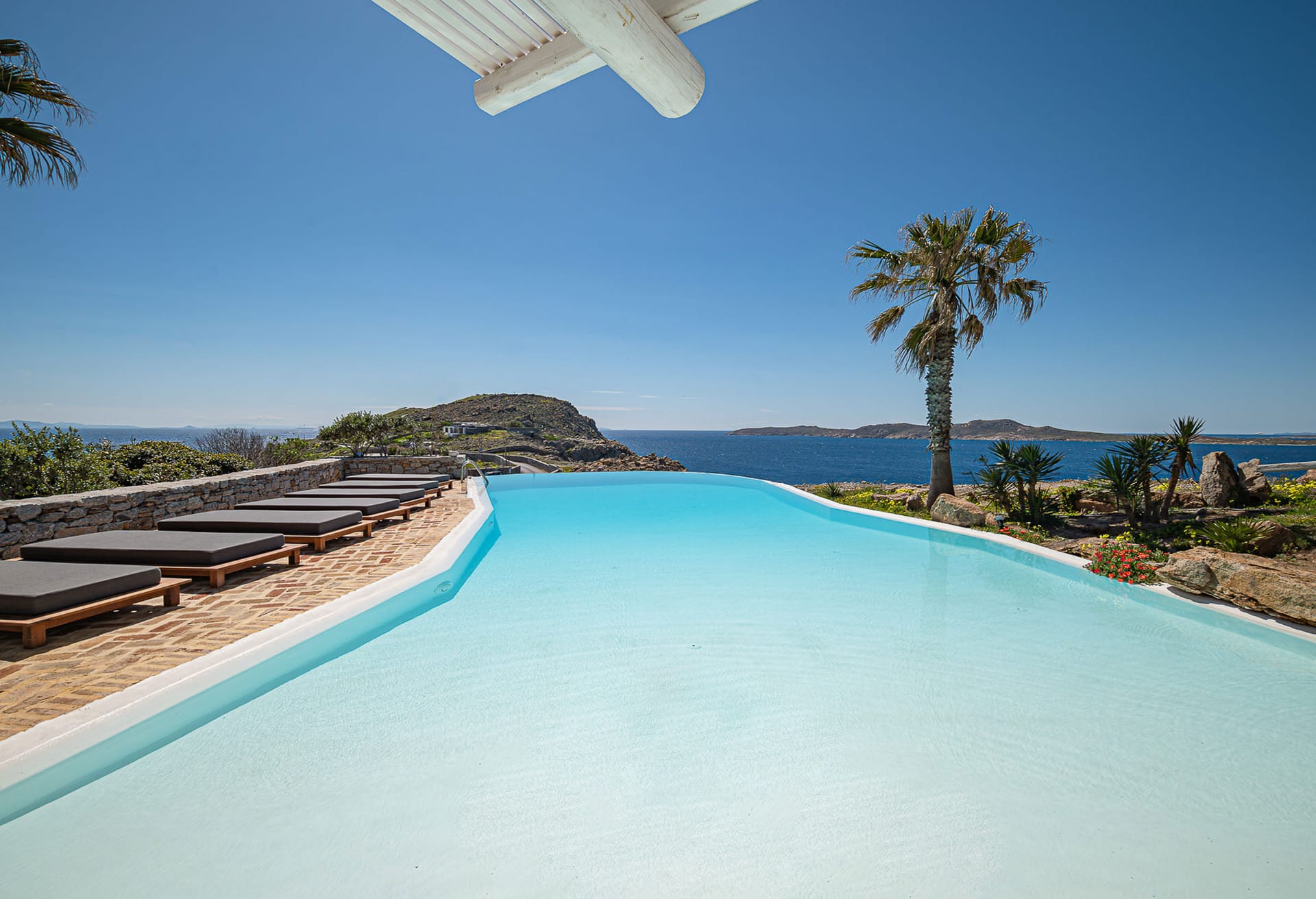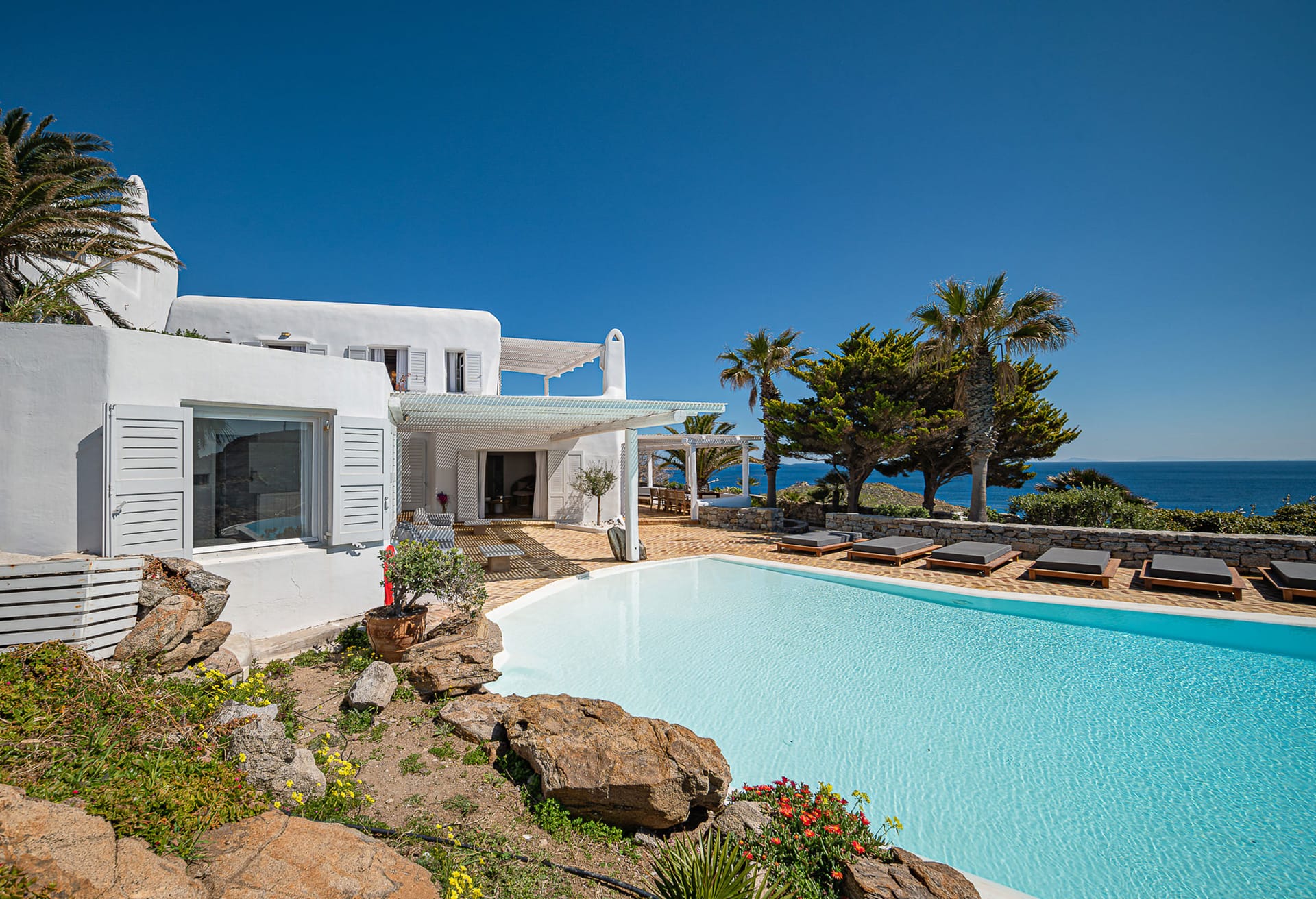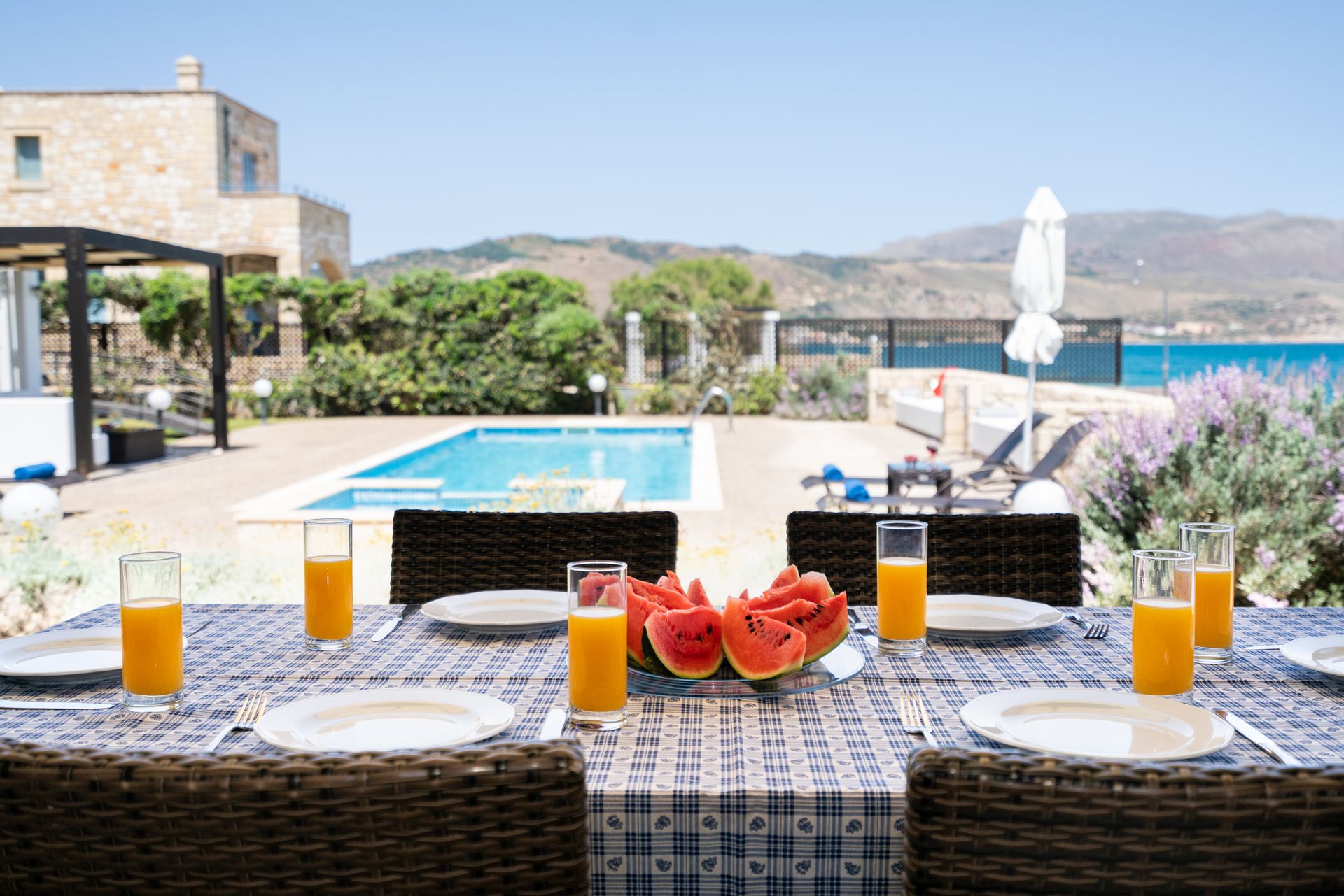 Decorated in neutral tones with modern touches, the bright living area includes a sofa, armchairs, and flat-screen TV, with patio doors opening to the pool. The dining area seats six and leads to a veranda, while the kitchen features granite worktops and modern appliances.