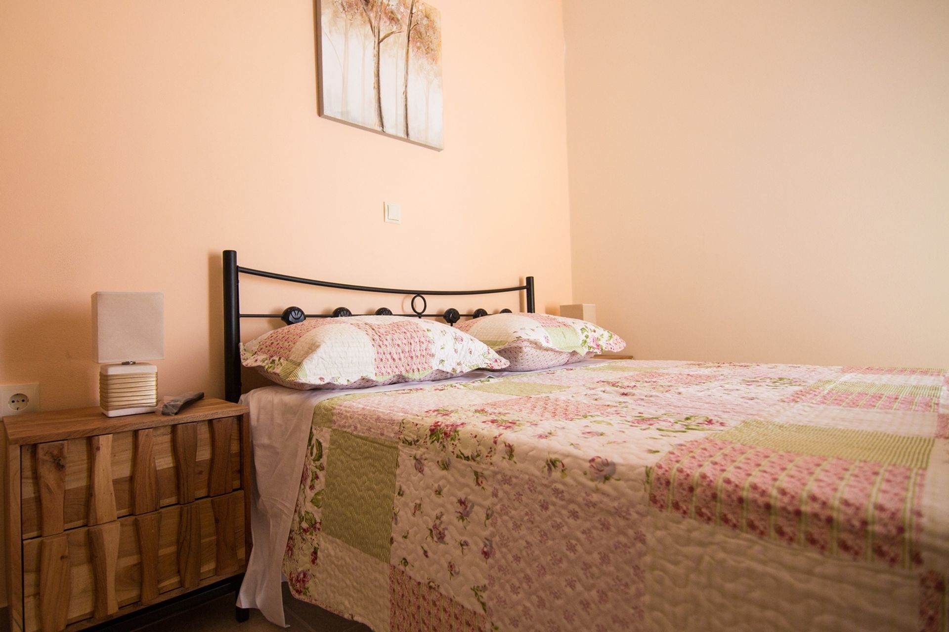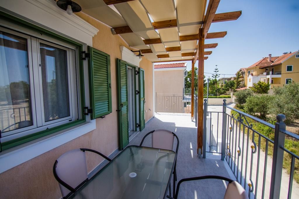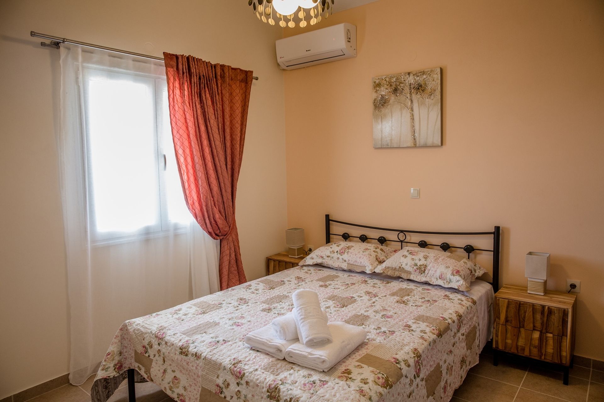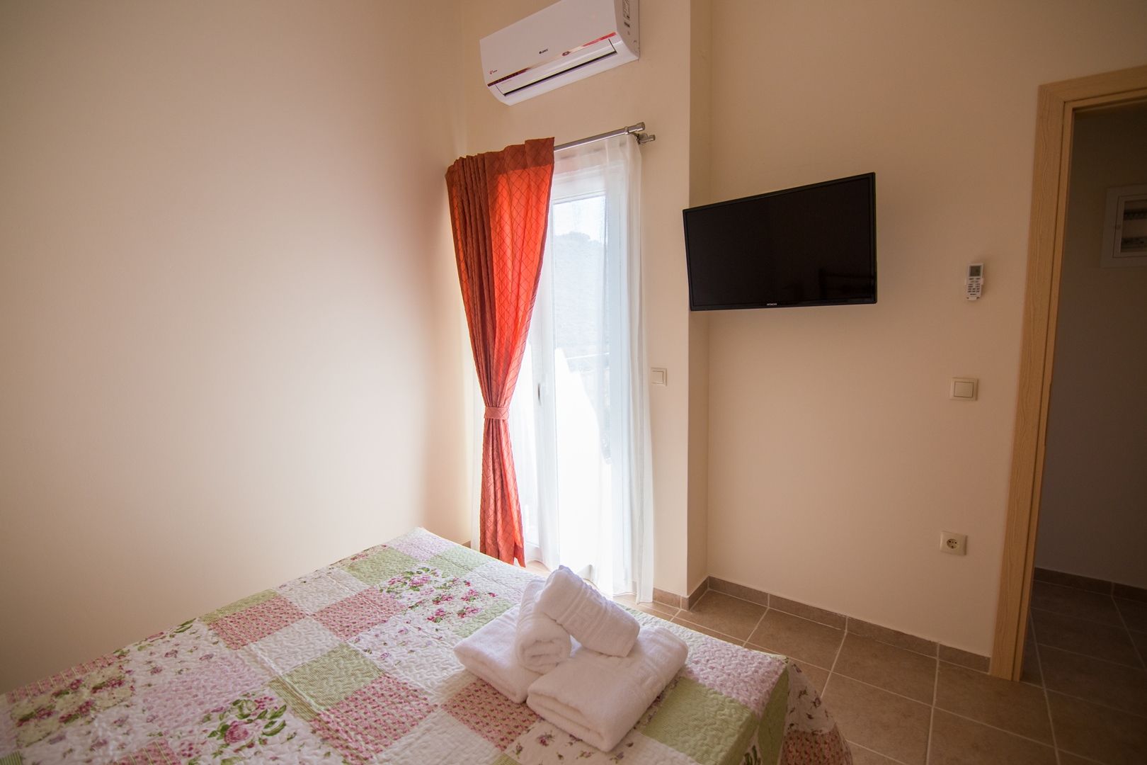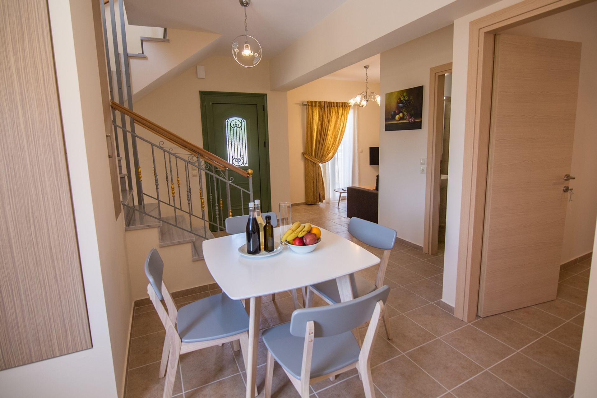 Upstairs, the master bedroom has a double bed, fitted wardrobes, and balcony access, with a shared bathroom nearby. A twin bedroom with balcony access is also on this level. The third bedroom is on the ground floor, with a double bed and adjacent shower room.