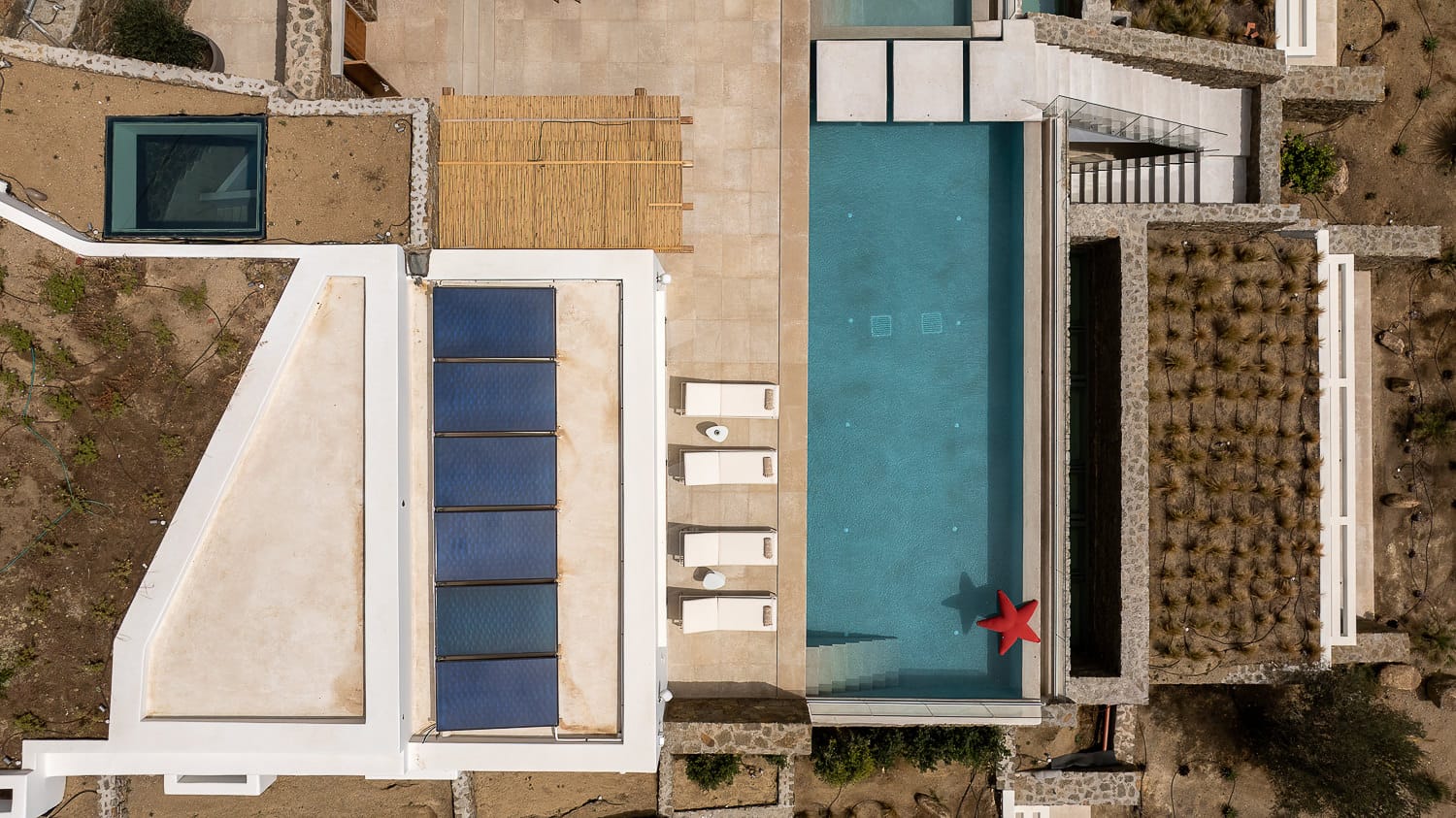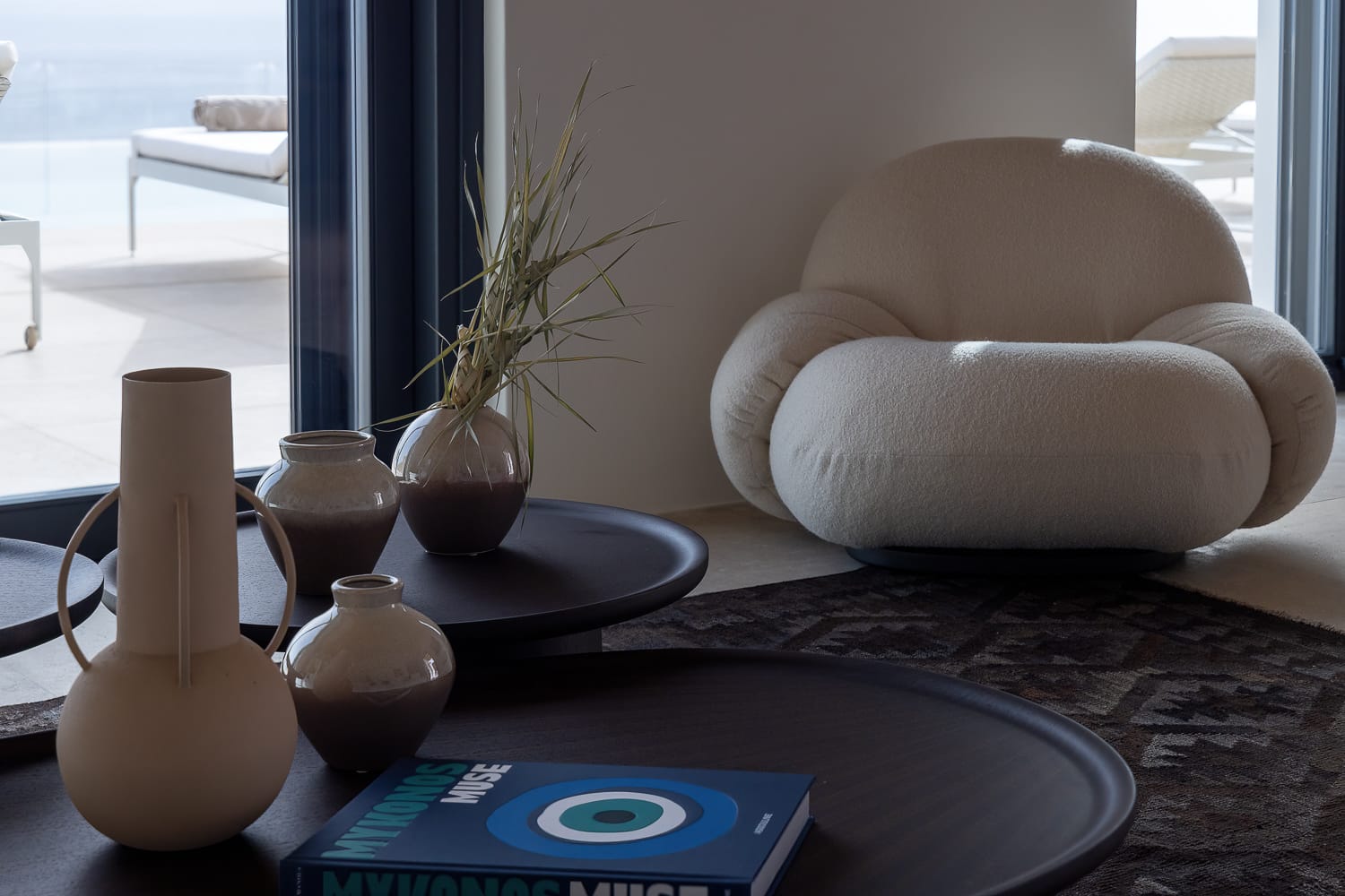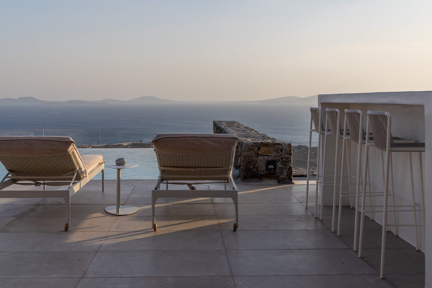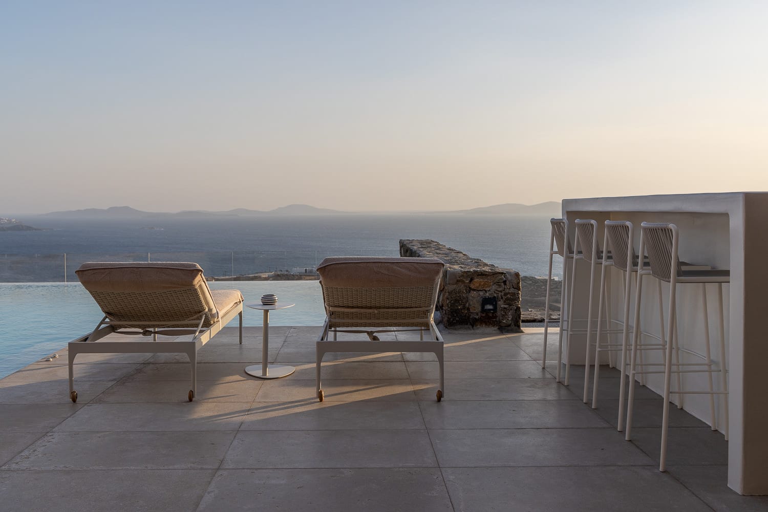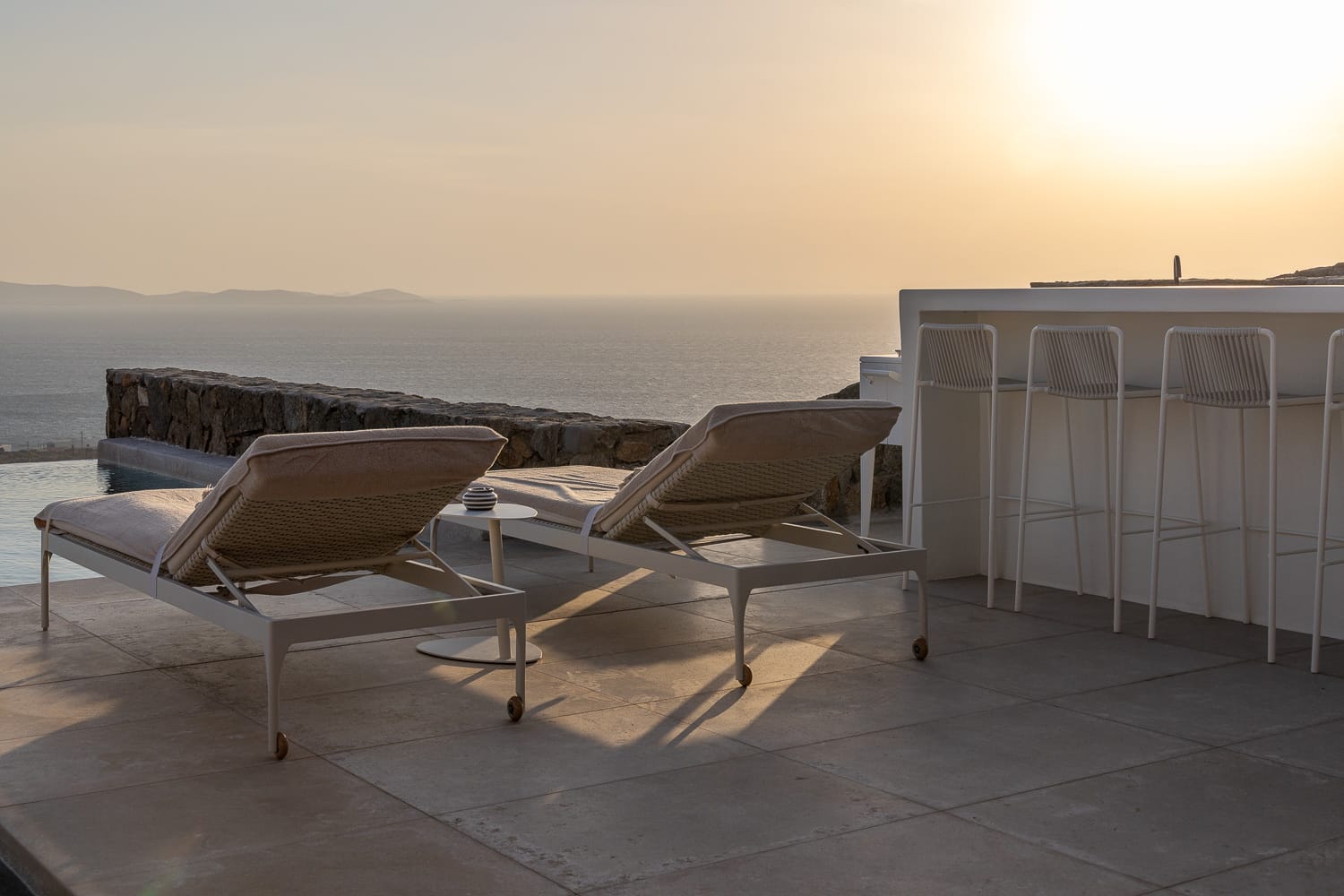 The villa’s expansive terrace is an outdoor sanctuary. Centered around a heated infinity pool, the space also includes stylish sun loungers, a shaded alfresco dining area, and cozy lounge spots for entertaining or unwinding. The panoramic views of the Aegean Sea and spectacular sunsets create a magical atmosphere for any time of day.