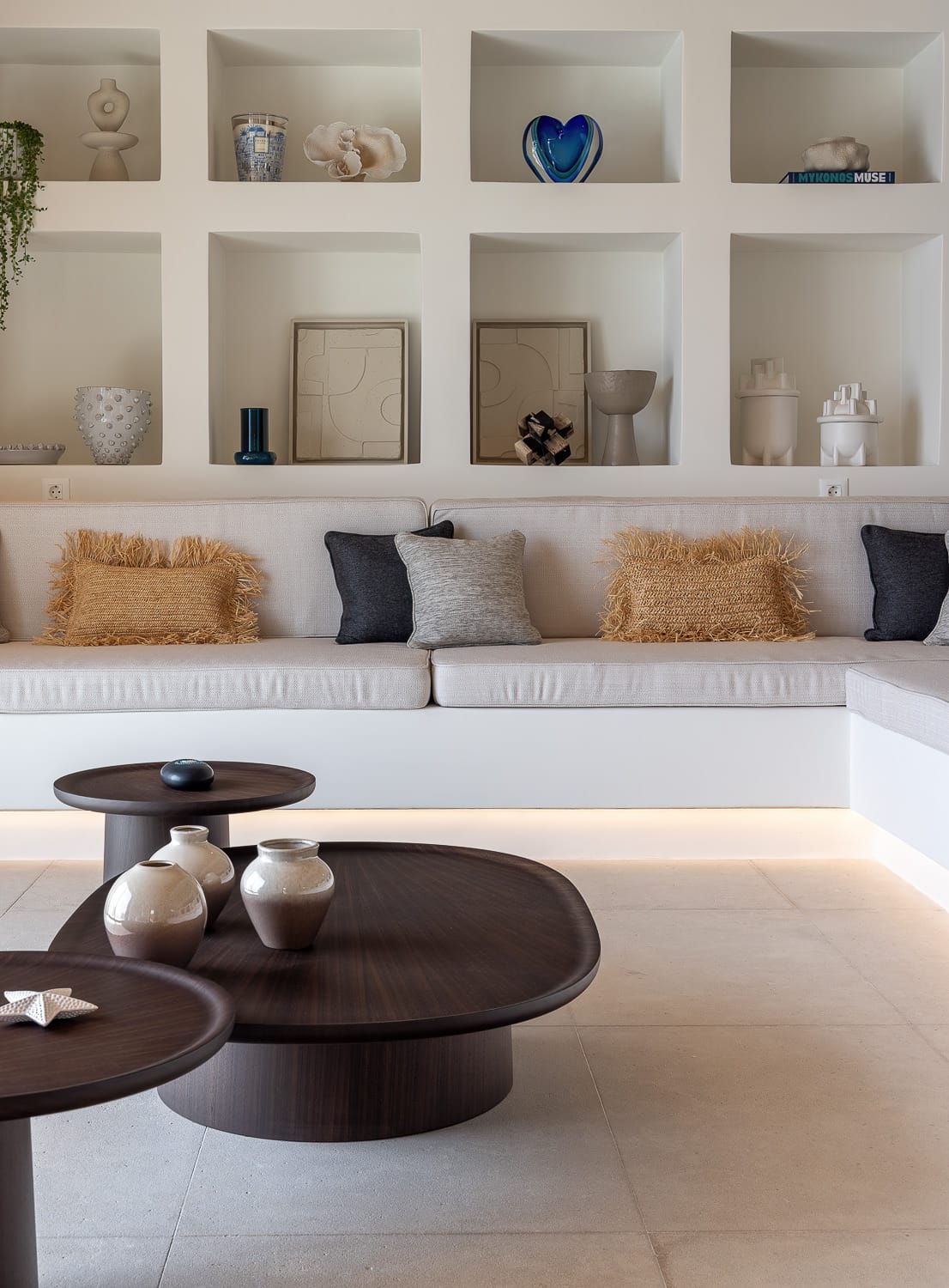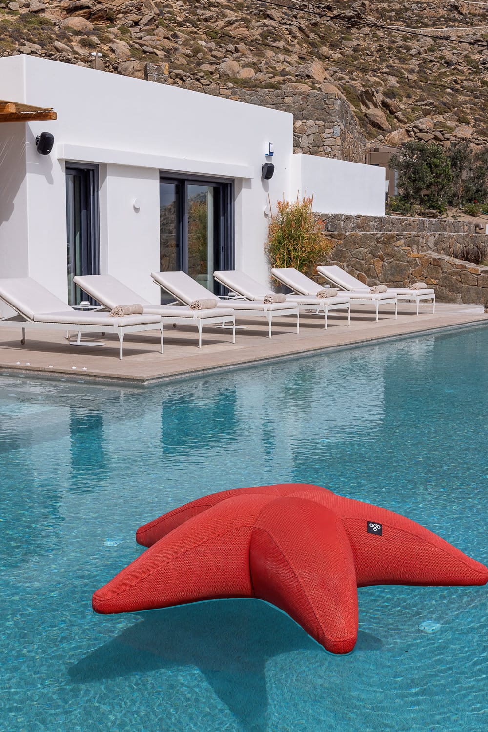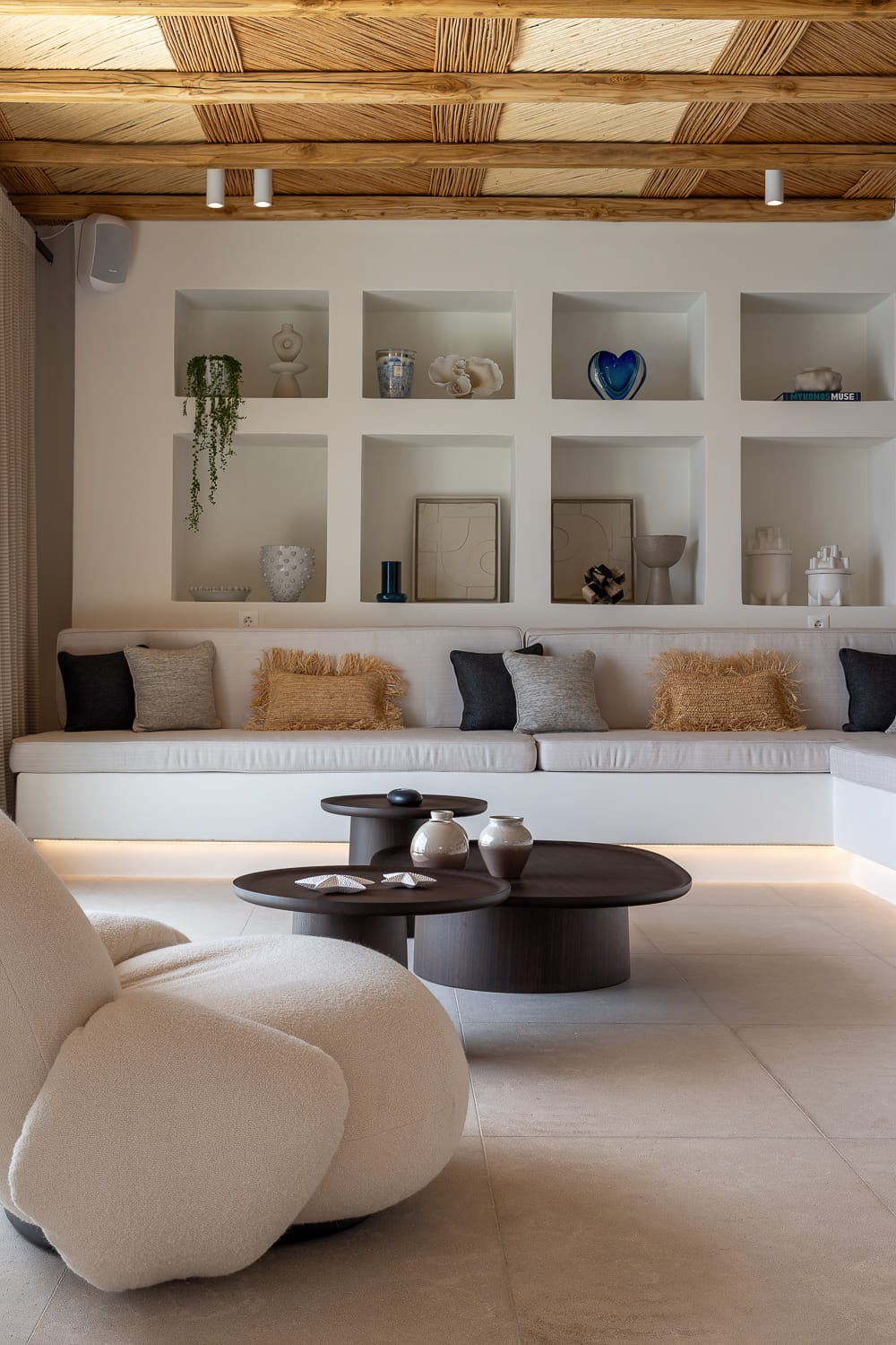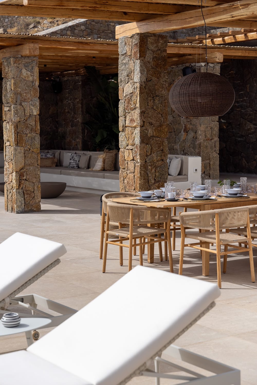 The villa’s expansive terrace is an outdoor sanctuary. Centered around a heated infinity pool, the space also includes stylish sun loungers, a shaded alfresco dining area, and cozy lounge spots for entertaining or unwinding. The panoramic views of the Aegean Sea and spectacular sunsets create a magical atmosphere for any time of day.