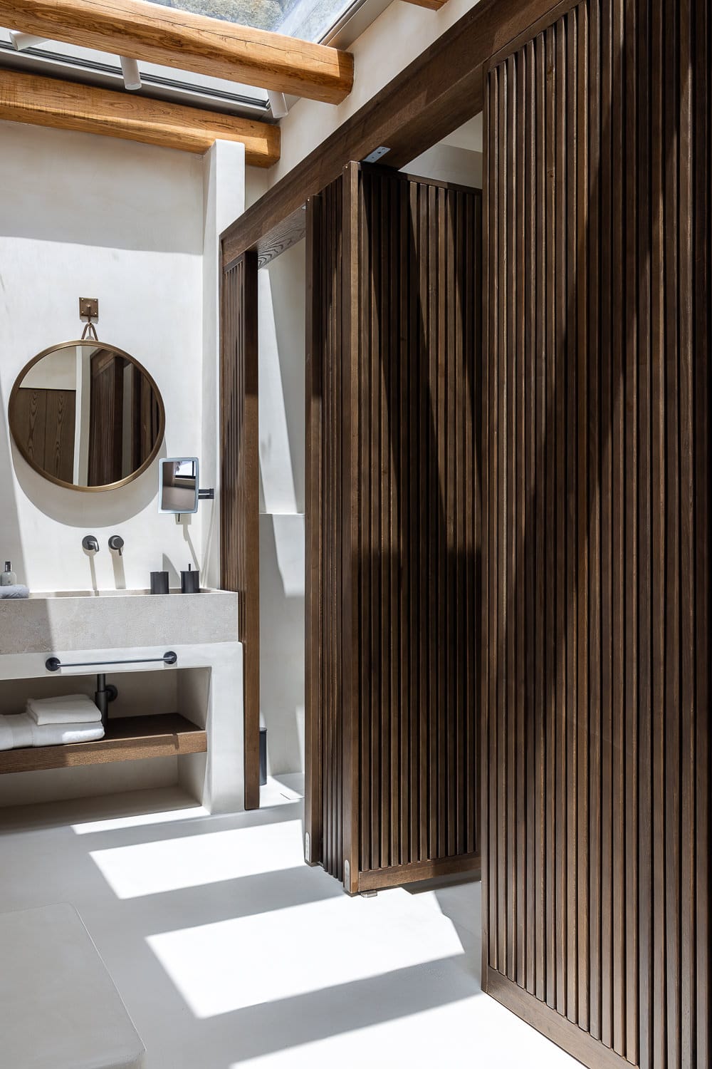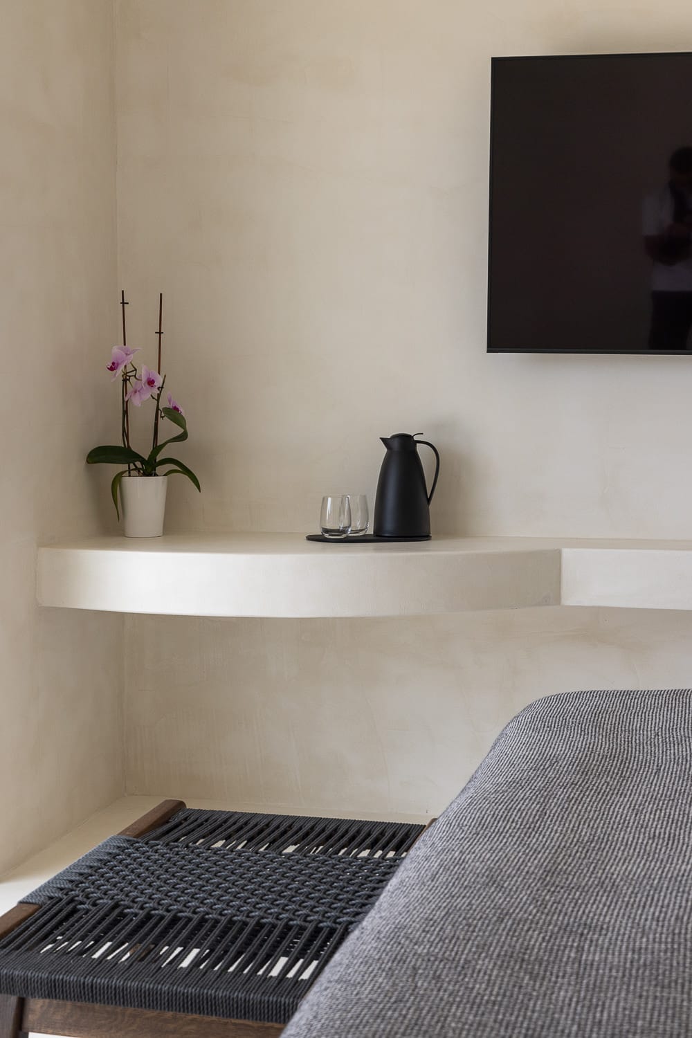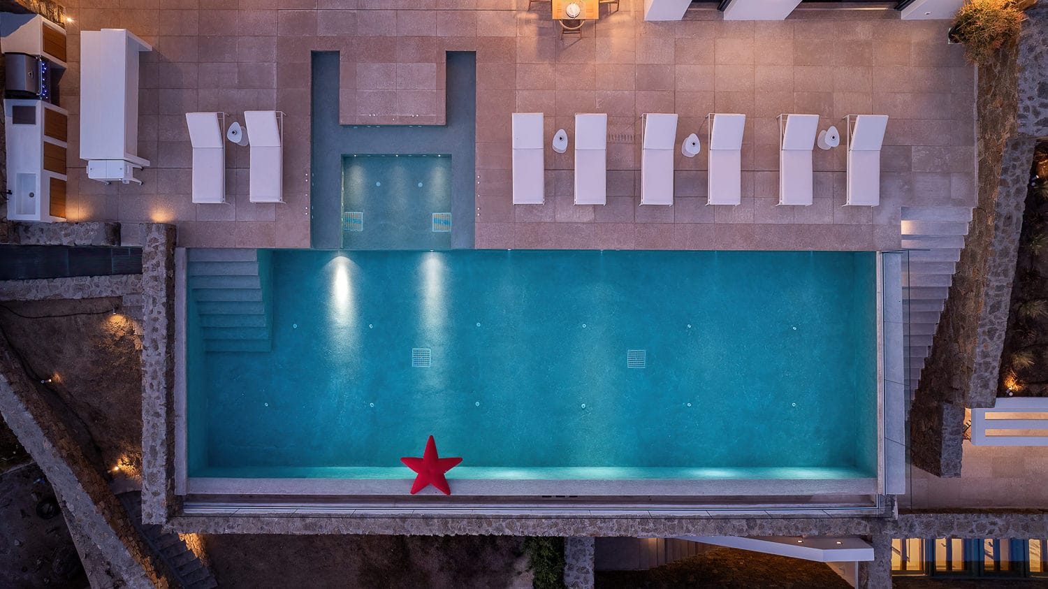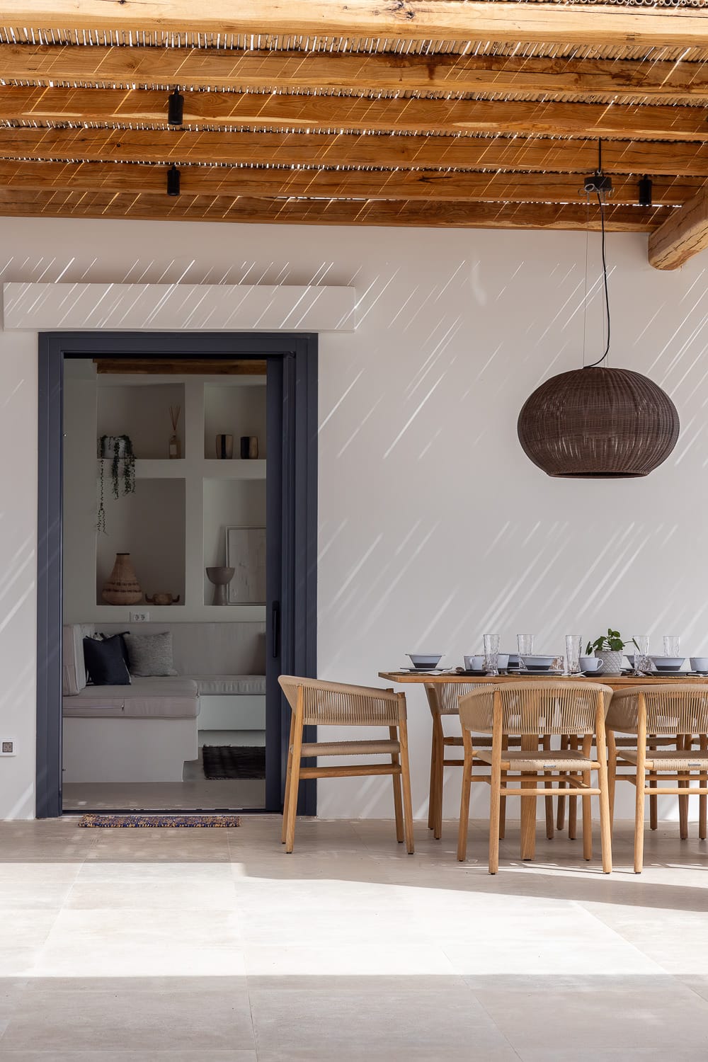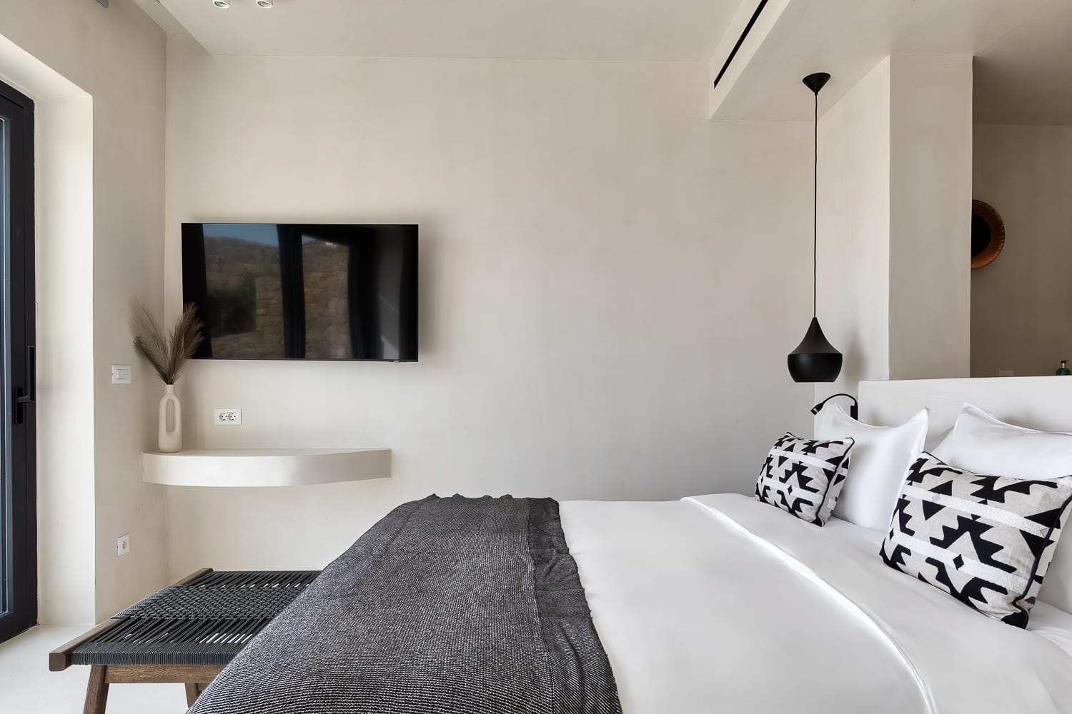 The villa’s expansive terrace is an outdoor sanctuary. Centered around a heated infinity pool, the space also includes stylish sun loungers, a shaded alfresco dining area, and cozy lounge spots for entertaining or unwinding. The panoramic views of the Aegean Sea and spectacular sunsets create a magical atmosphere for any time of day.