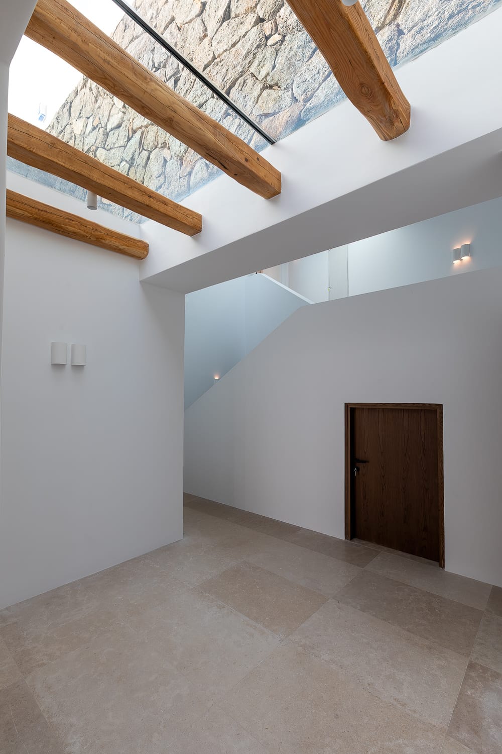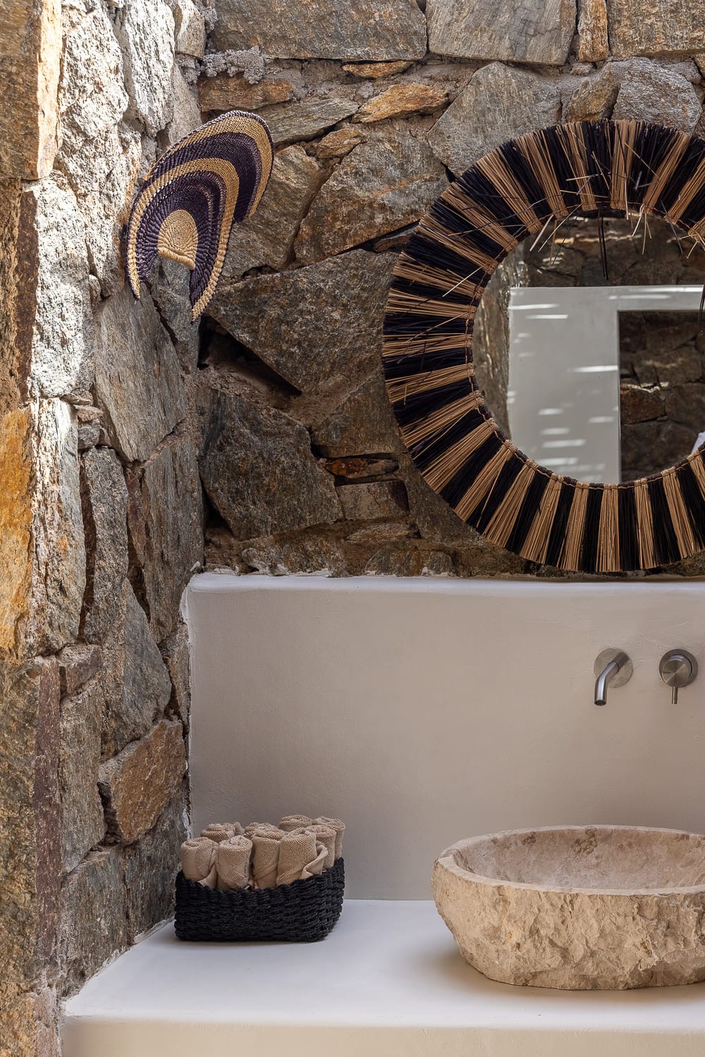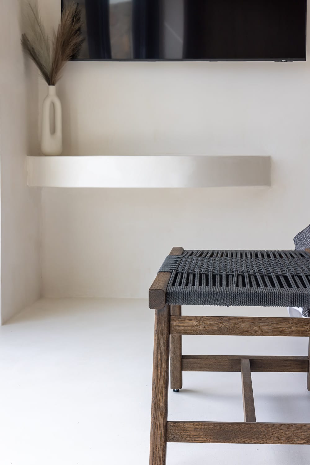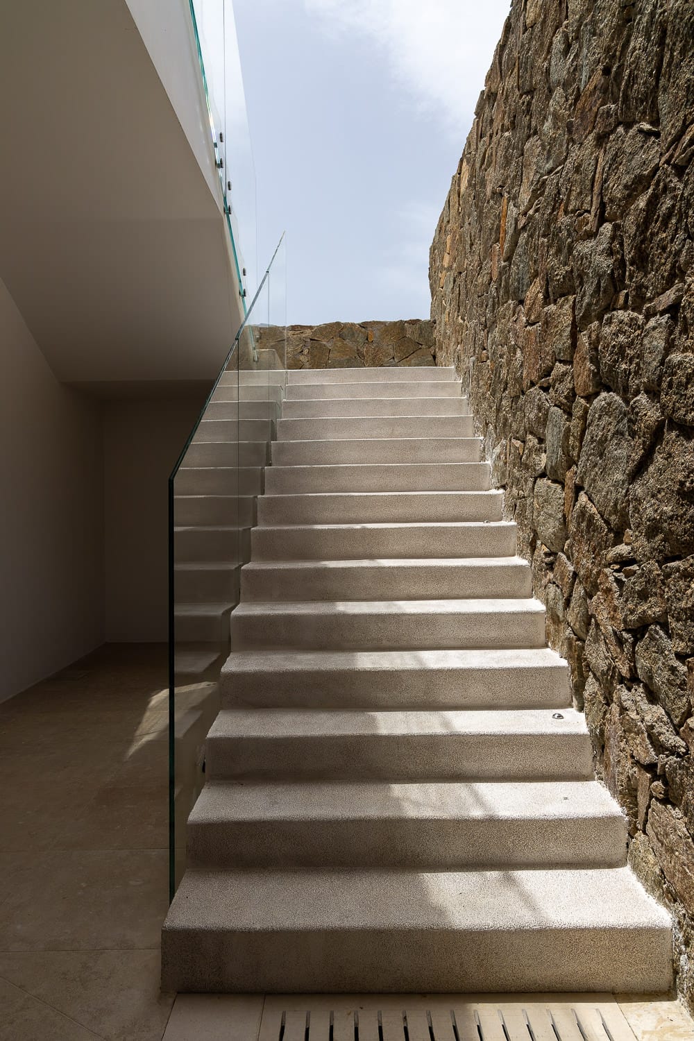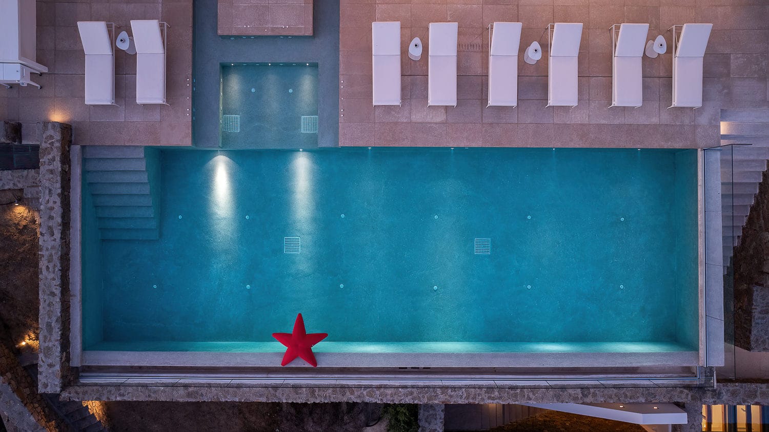 The villa’s expansive terrace is an outdoor sanctuary. Centered around a heated infinity pool, the space also includes stylish sun loungers, a shaded alfresco dining area, and cozy lounge spots for entertaining or unwinding. The panoramic views of the Aegean Sea and spectacular sunsets create a magical atmosphere for any time of day.