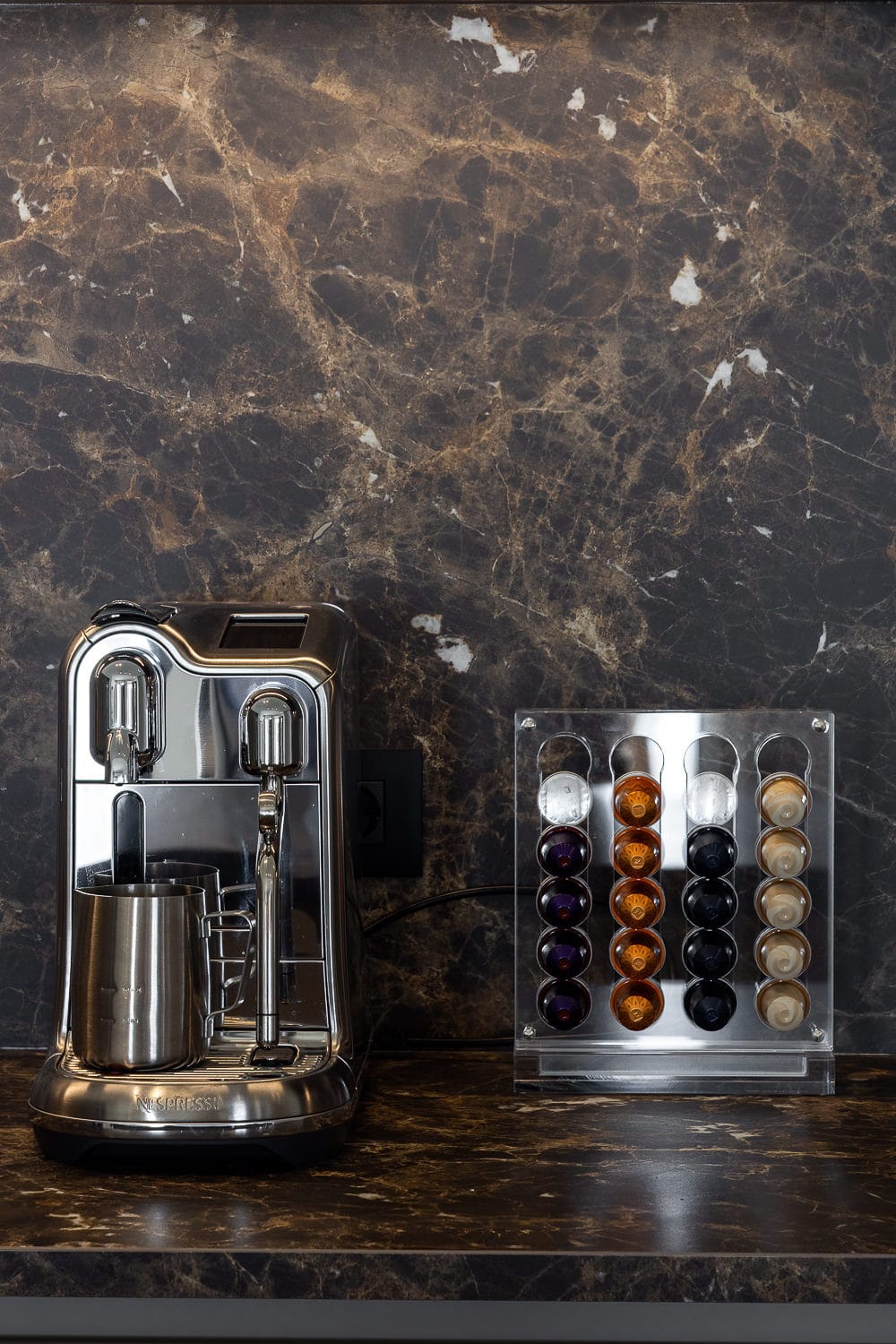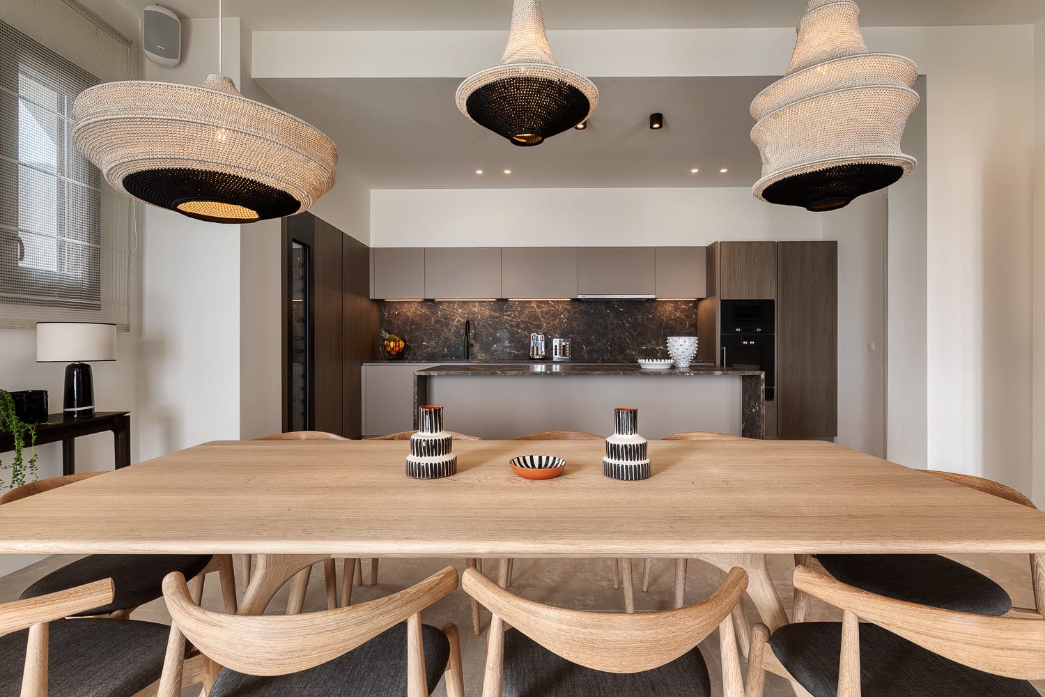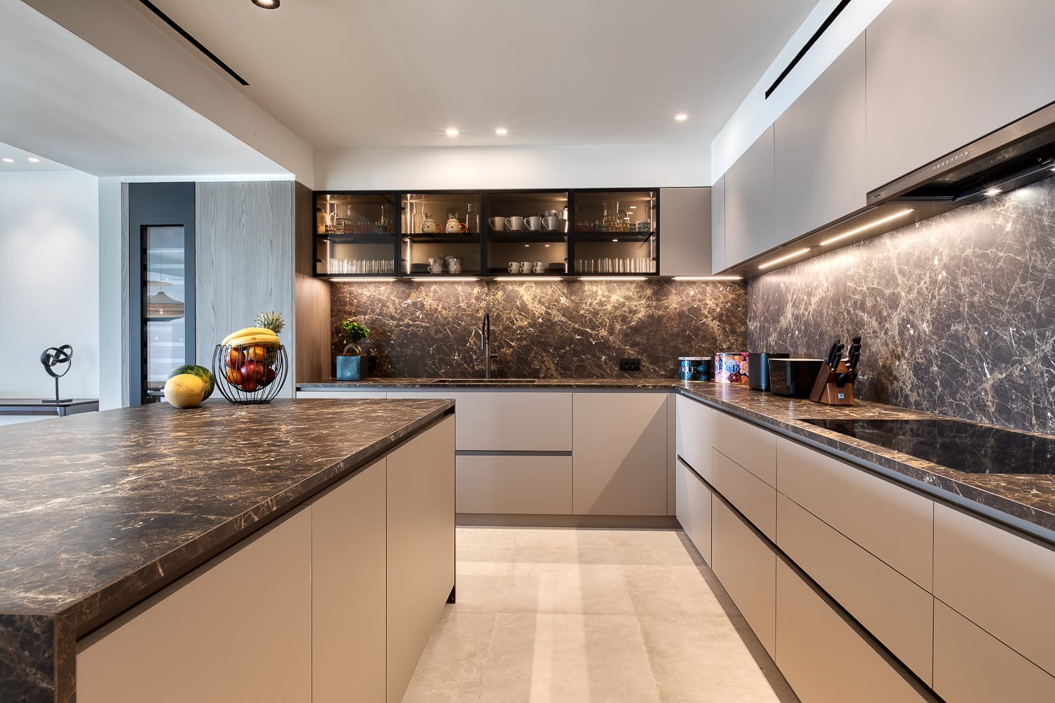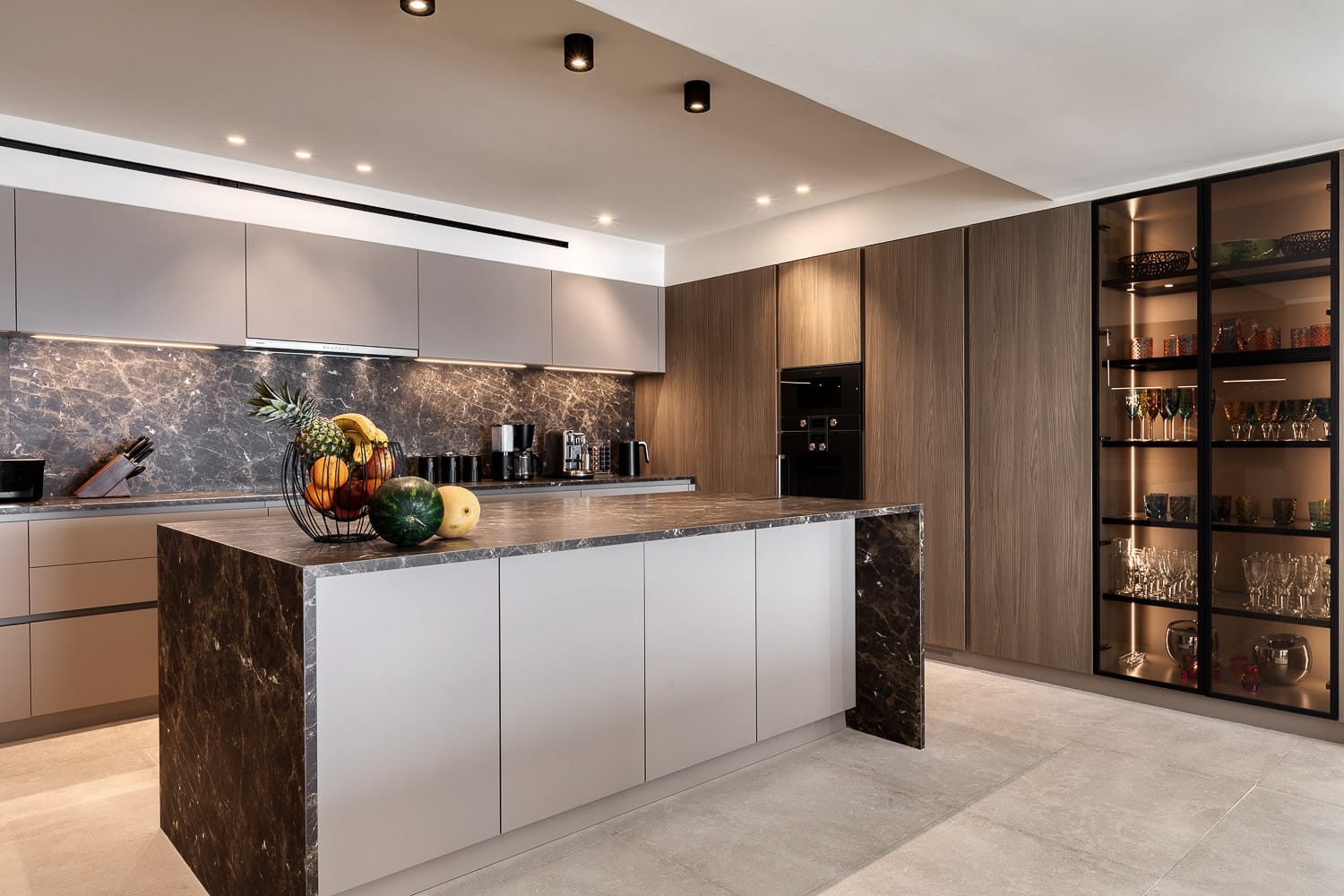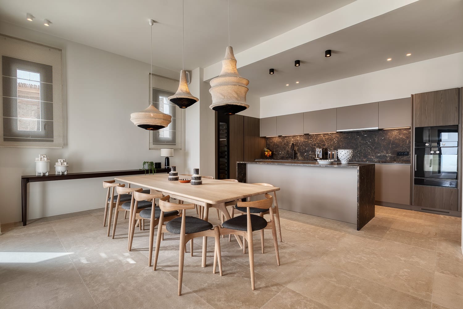 The bespoke kitchen, equipped with high-end Gaggenau appliances, is a culinary haven. It’s ideal for both casual meals and formal dining experiences, with ample space and top-tier amenities to satisfy any gourmet enthusiast.