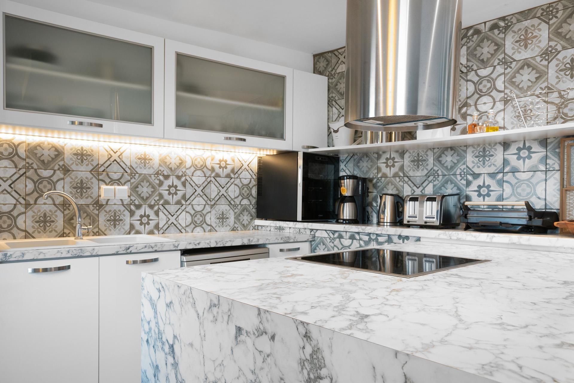 Fully equipped kitchen with SMEG fridge, high-quality appliances, and breakfast bar