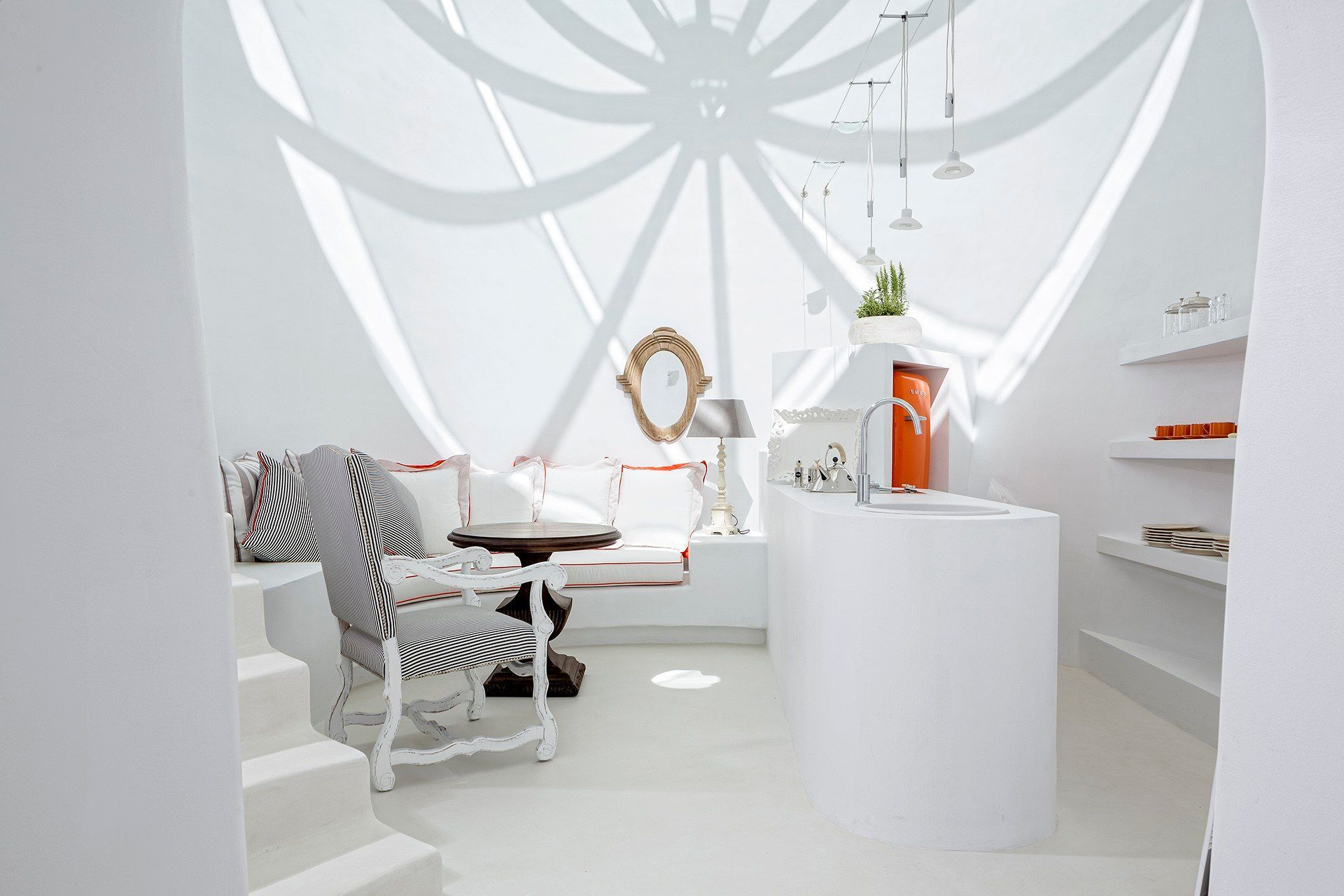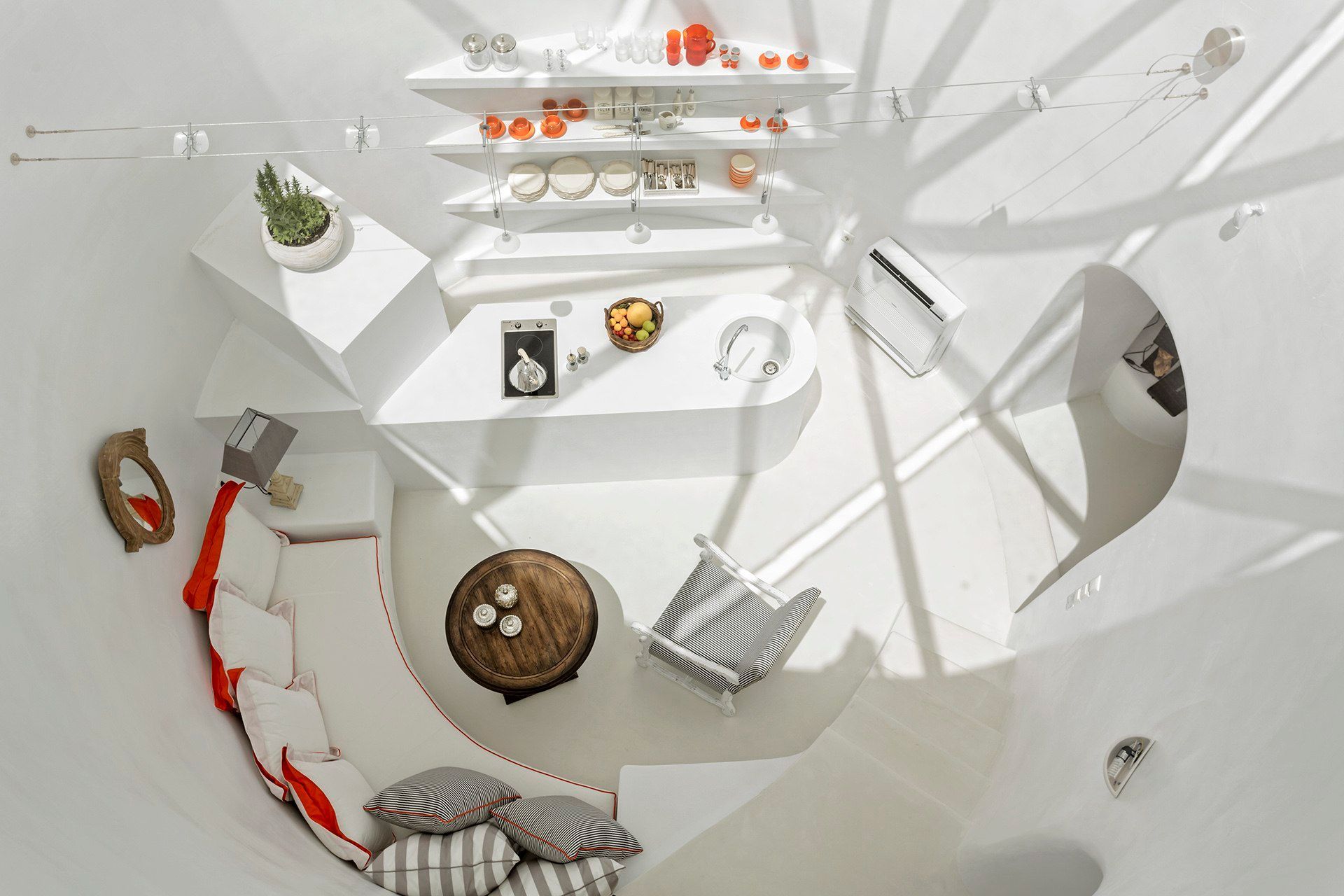 Celadon follows Cycladic traditional architecture and uses eco-friendly materials throughout. The former cylindrical lime kiln has been ingeniously converted into the living and kitchen area, crowned by a shaded skylight that floods the space with natural light. The layout is oriented so most rooms enjoy the same exceptional view. Sleeping arrangements include a master suite, a standalone guest suite, and an upper three-bedroom suite—each ensuite and ready to host up to 10 guests.