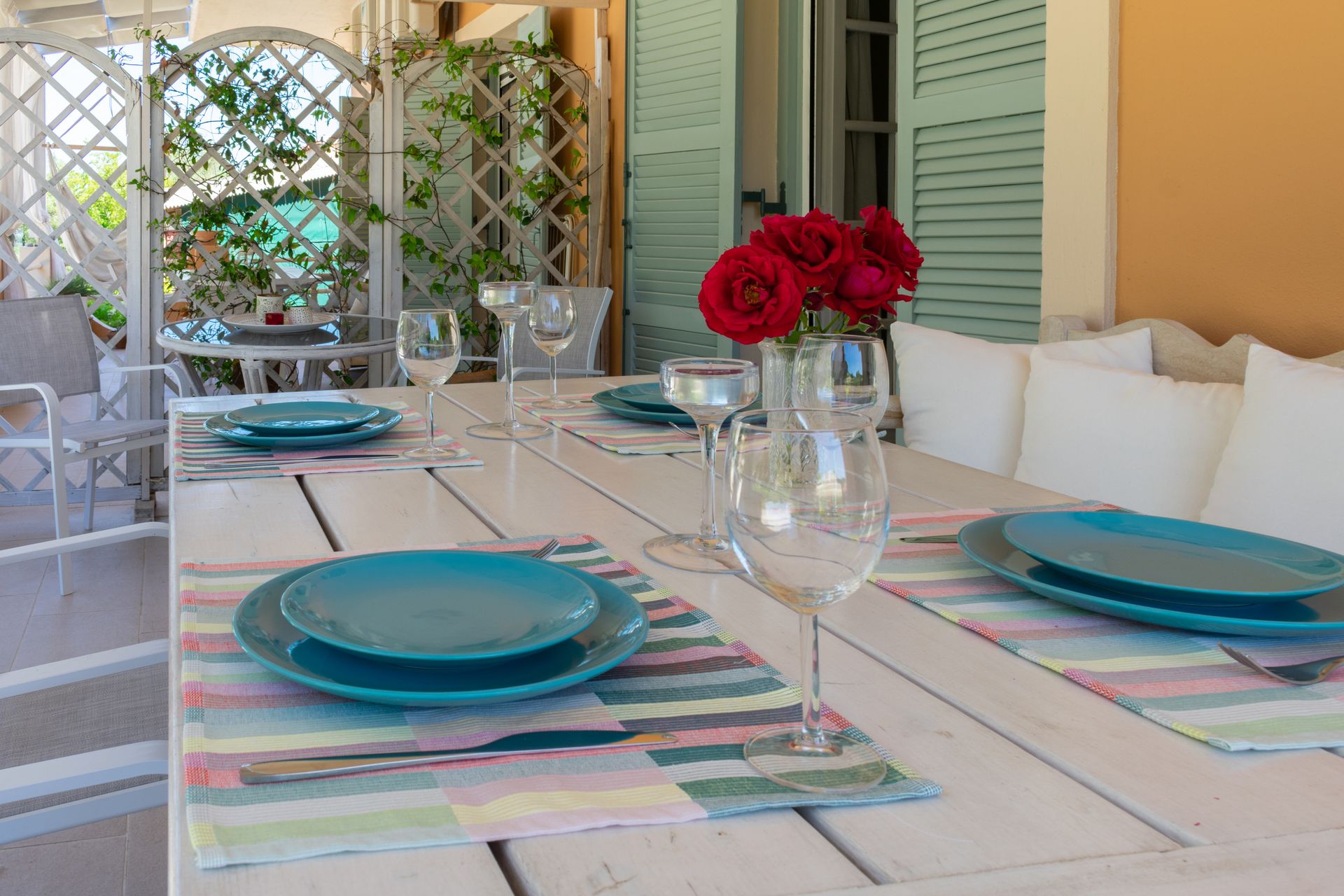 - Kitchen with view to the barbecue and garden area (includes: four cooking rings, oven, fridge (two doors), coffee machine, kettle, toaster and cooking utensils)