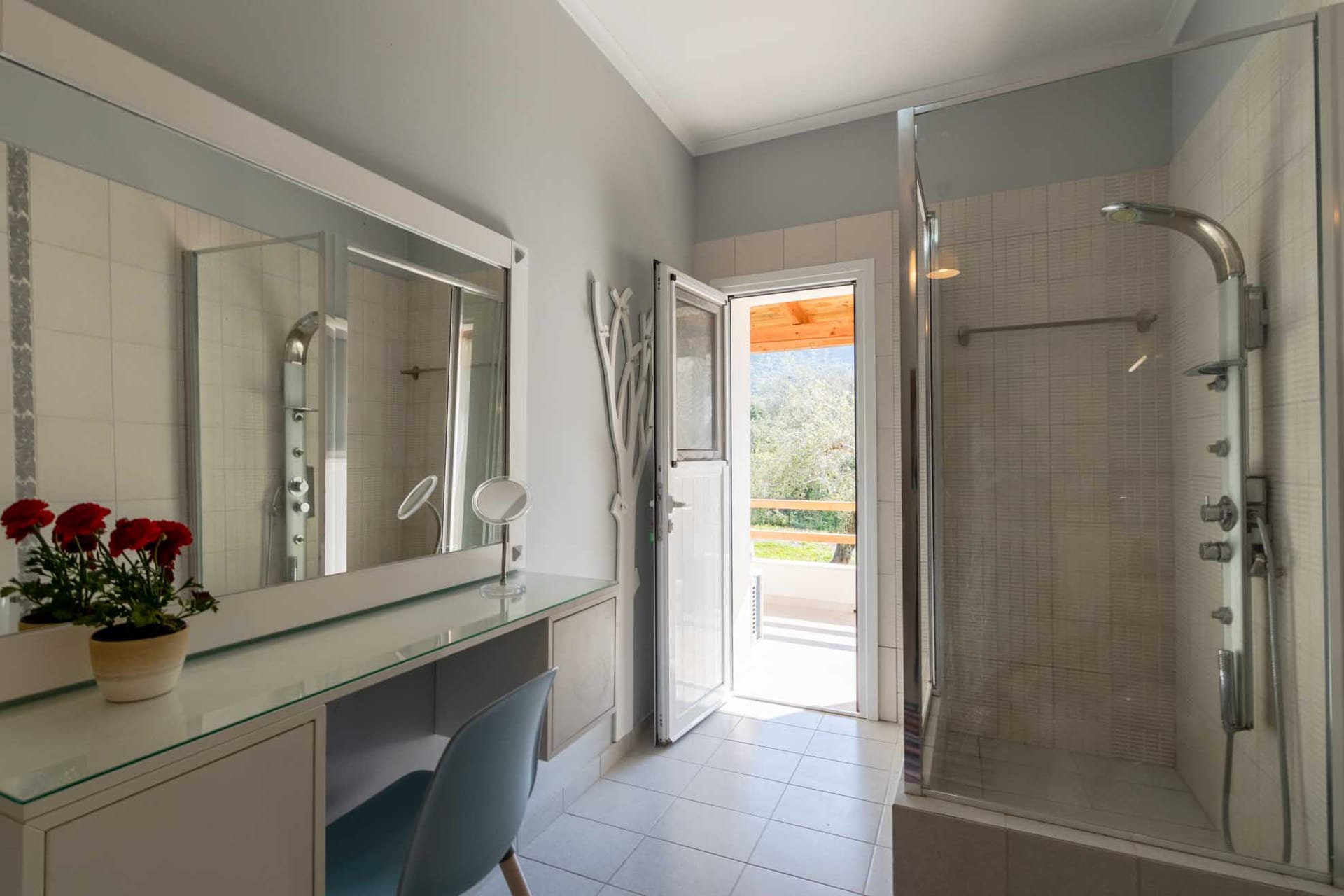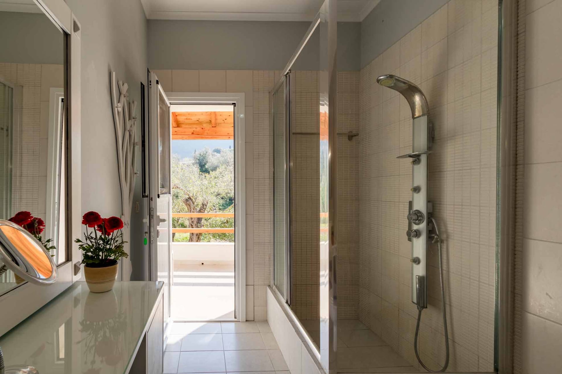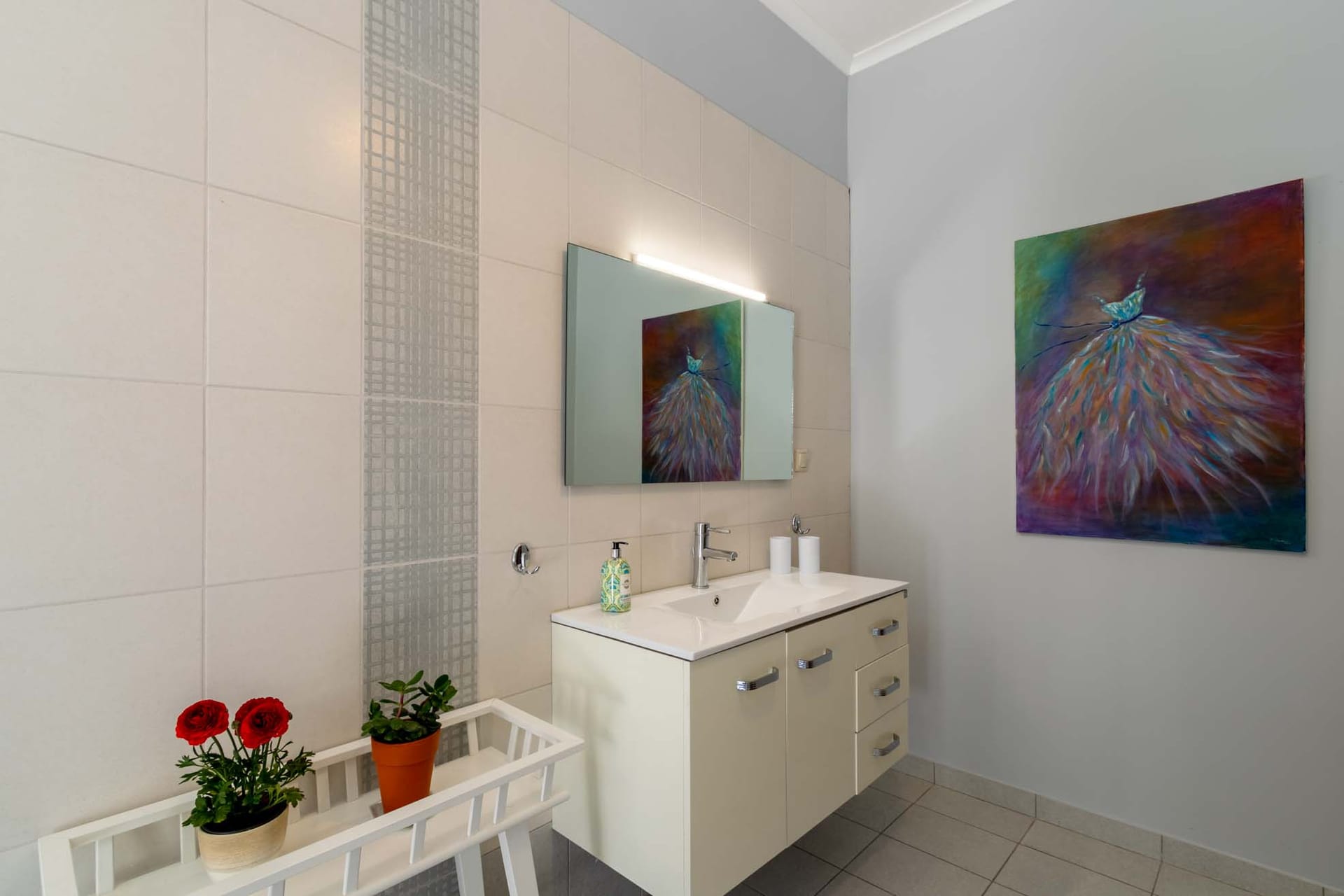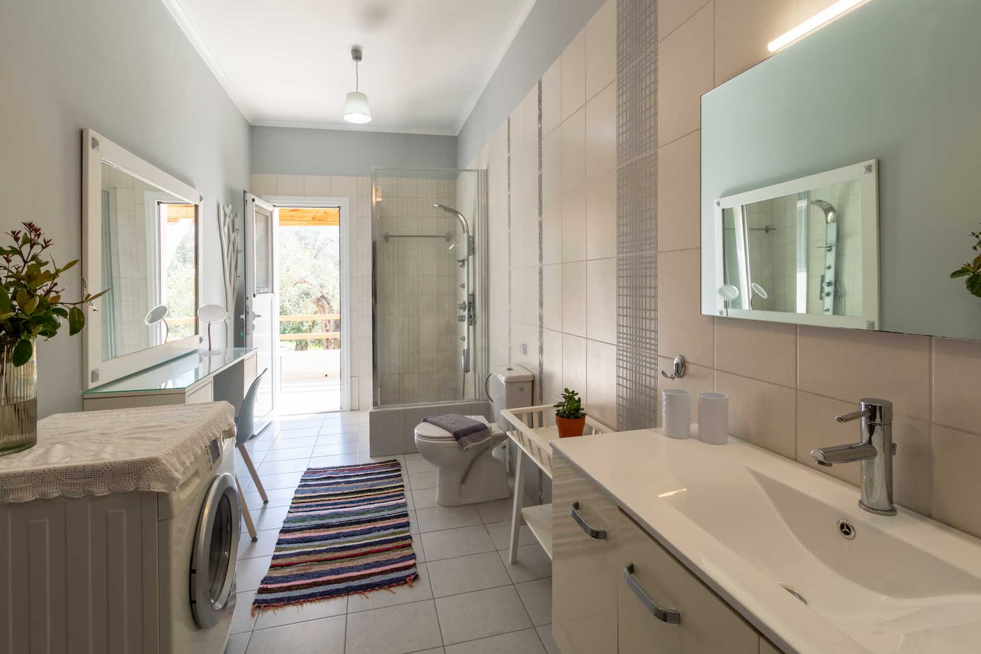 Private spacious bathroom with shower, hairdryer, washing machine and access to the balcony