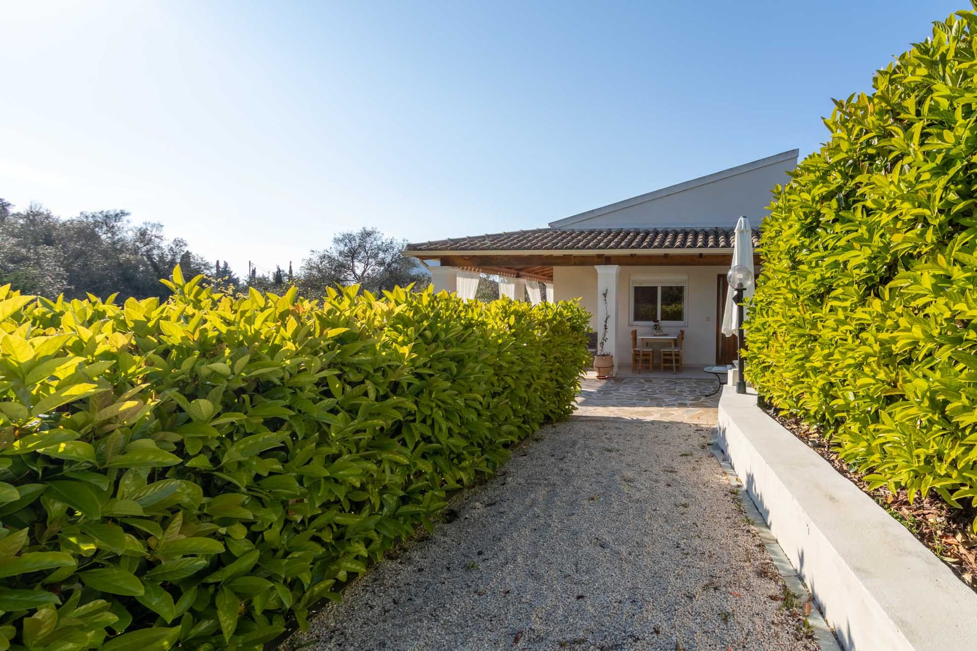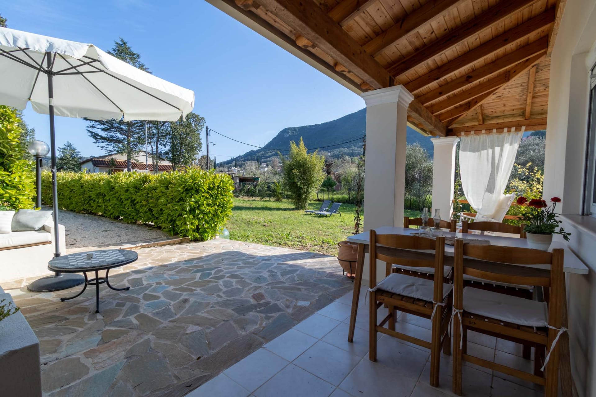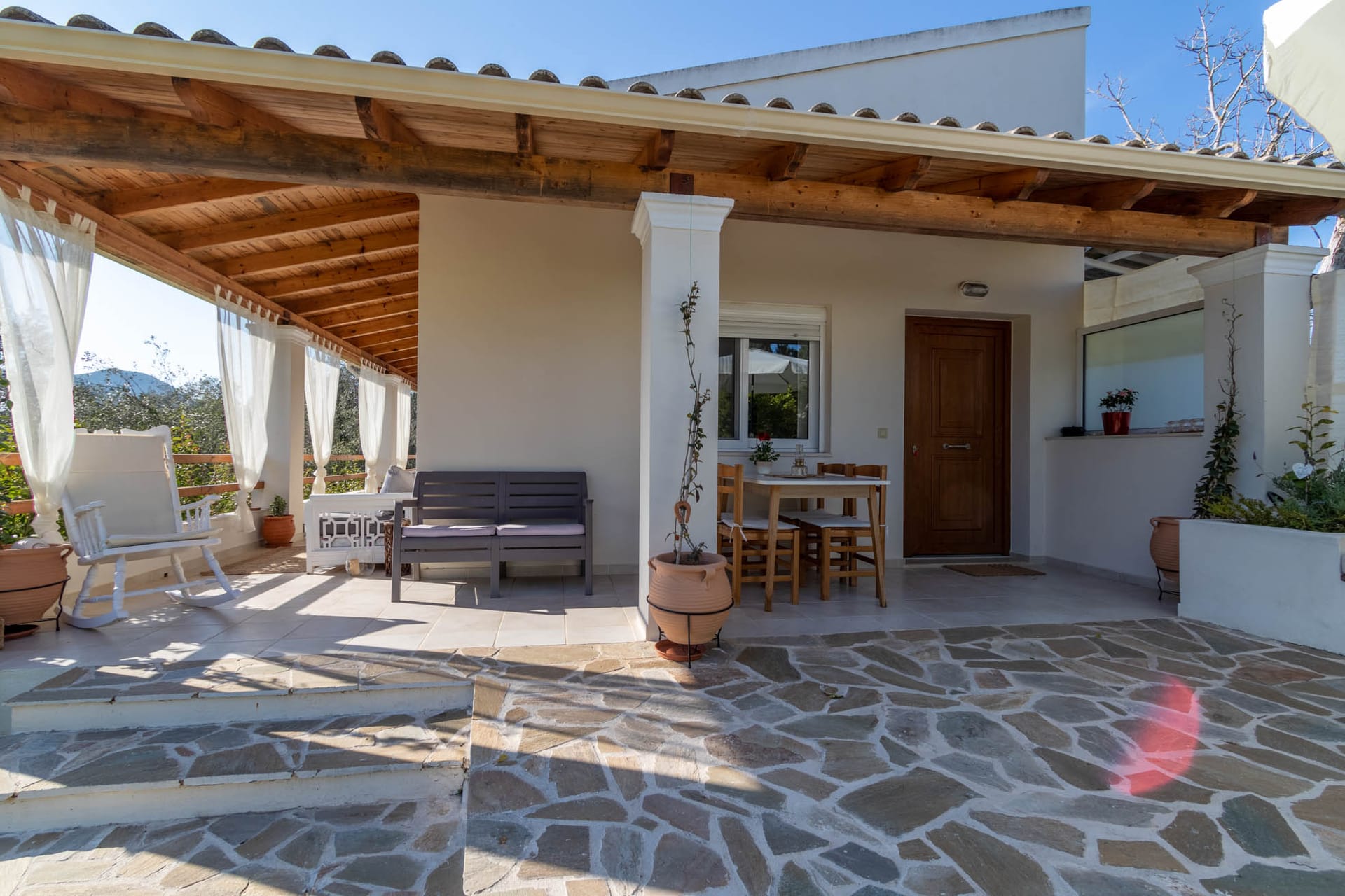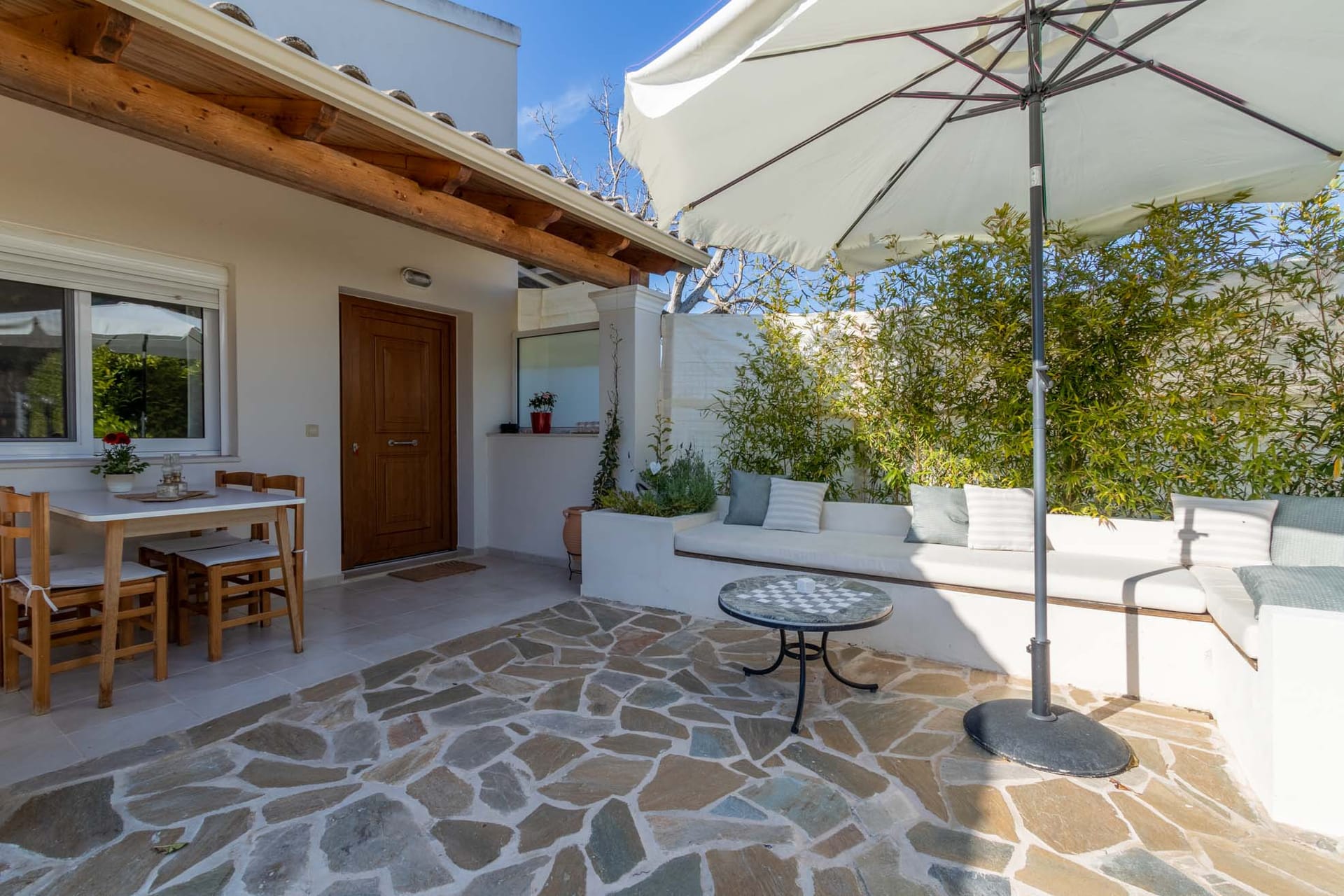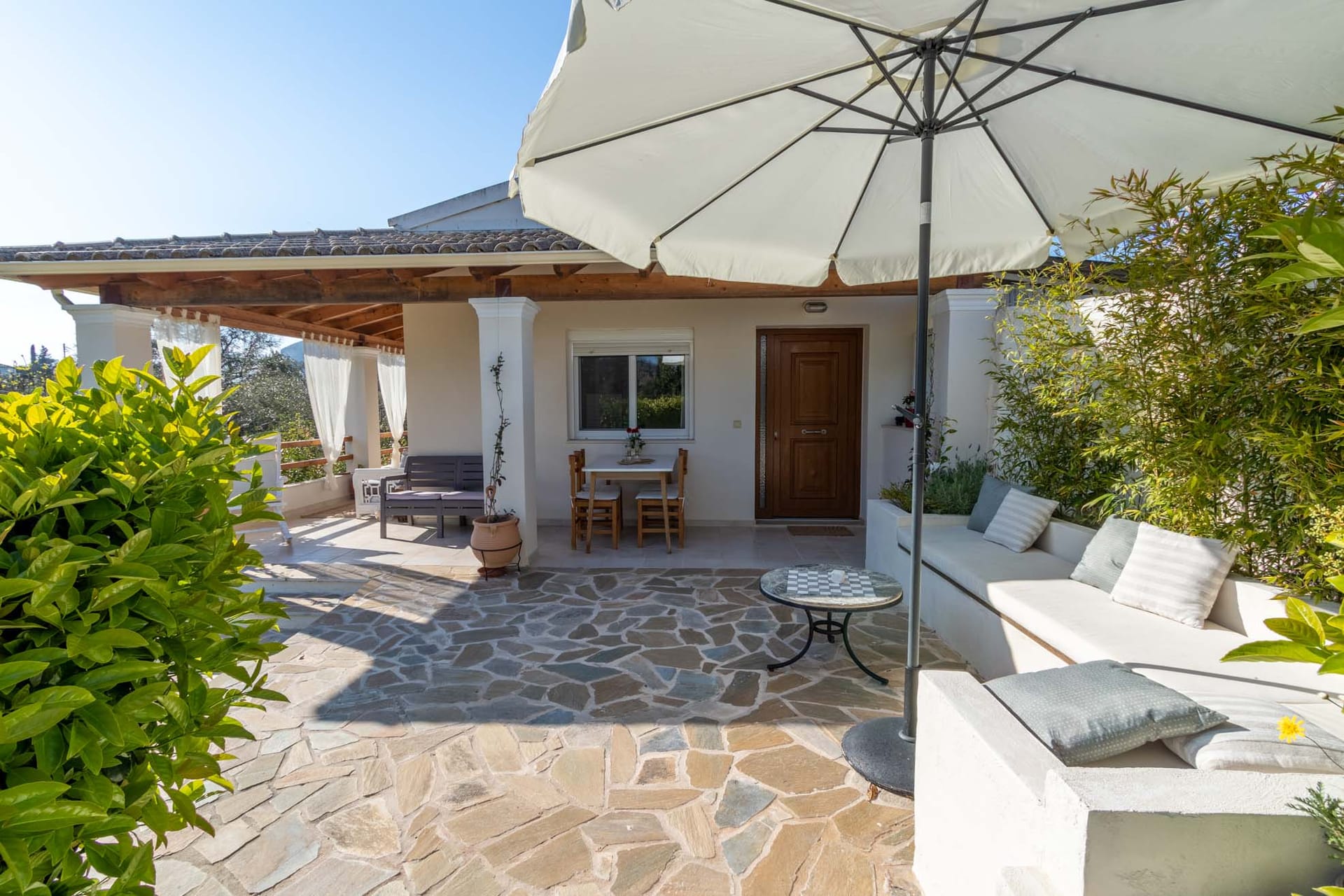 Spacious terrace with dining and barbecue facilities & direct access to the naturally lawned garden area with olive trees etc. where you can enjoy the sun loungers and umbrellas.