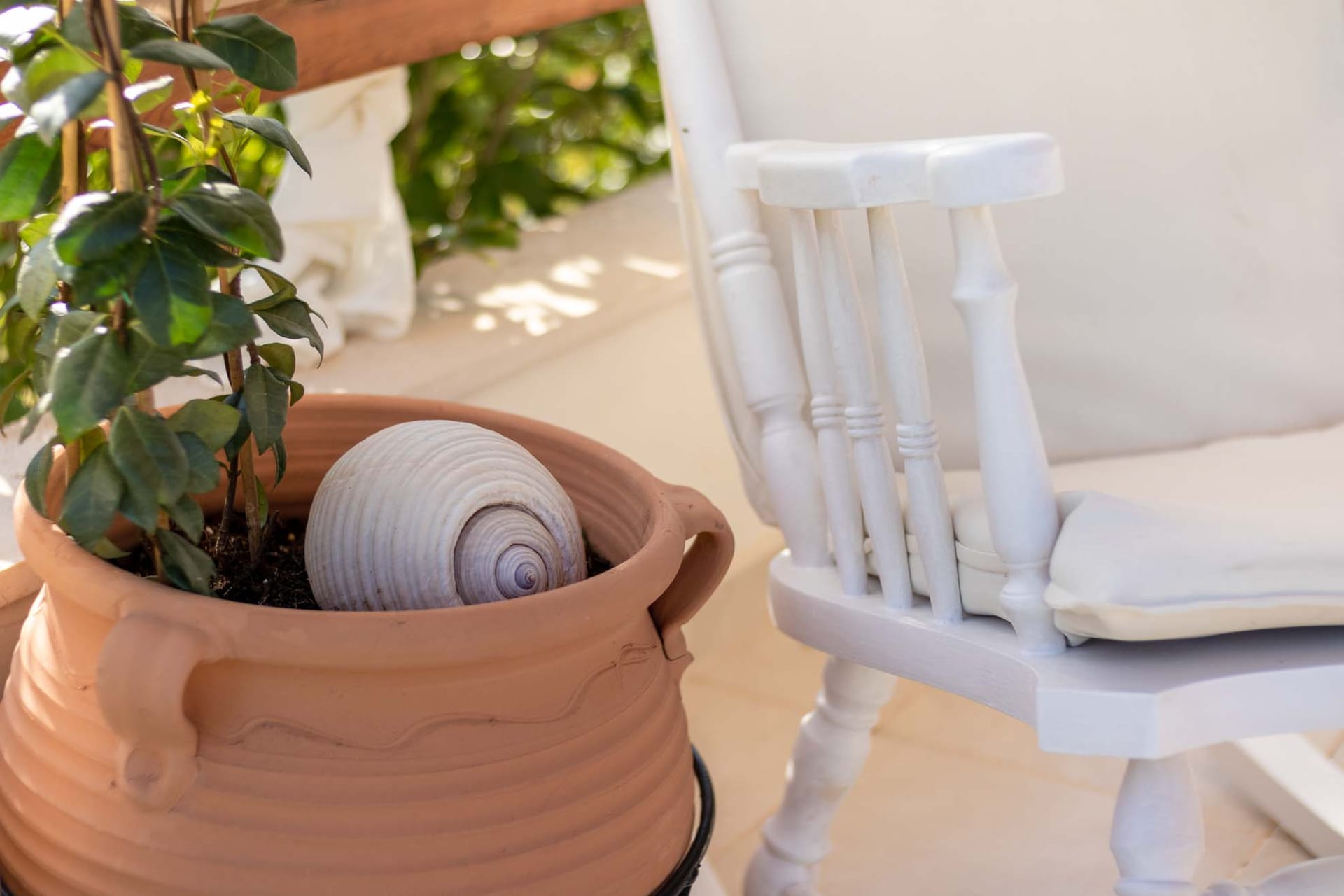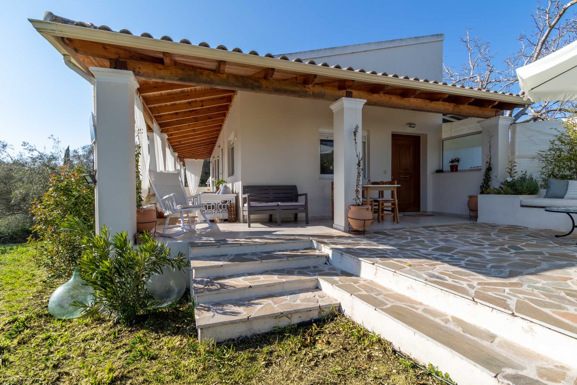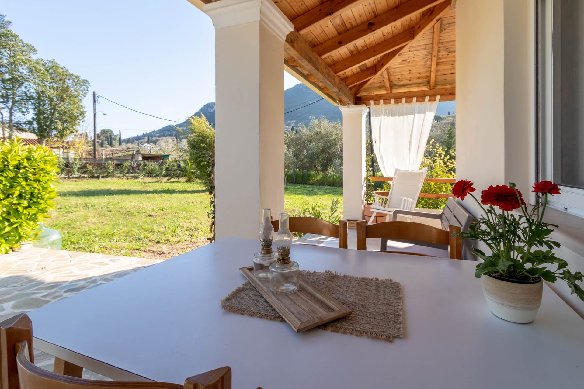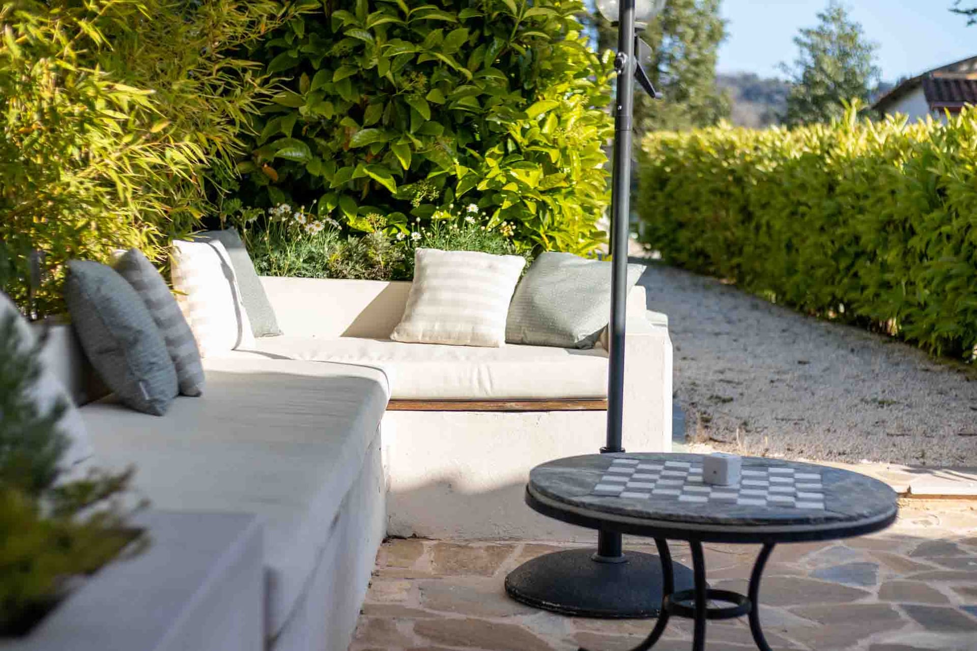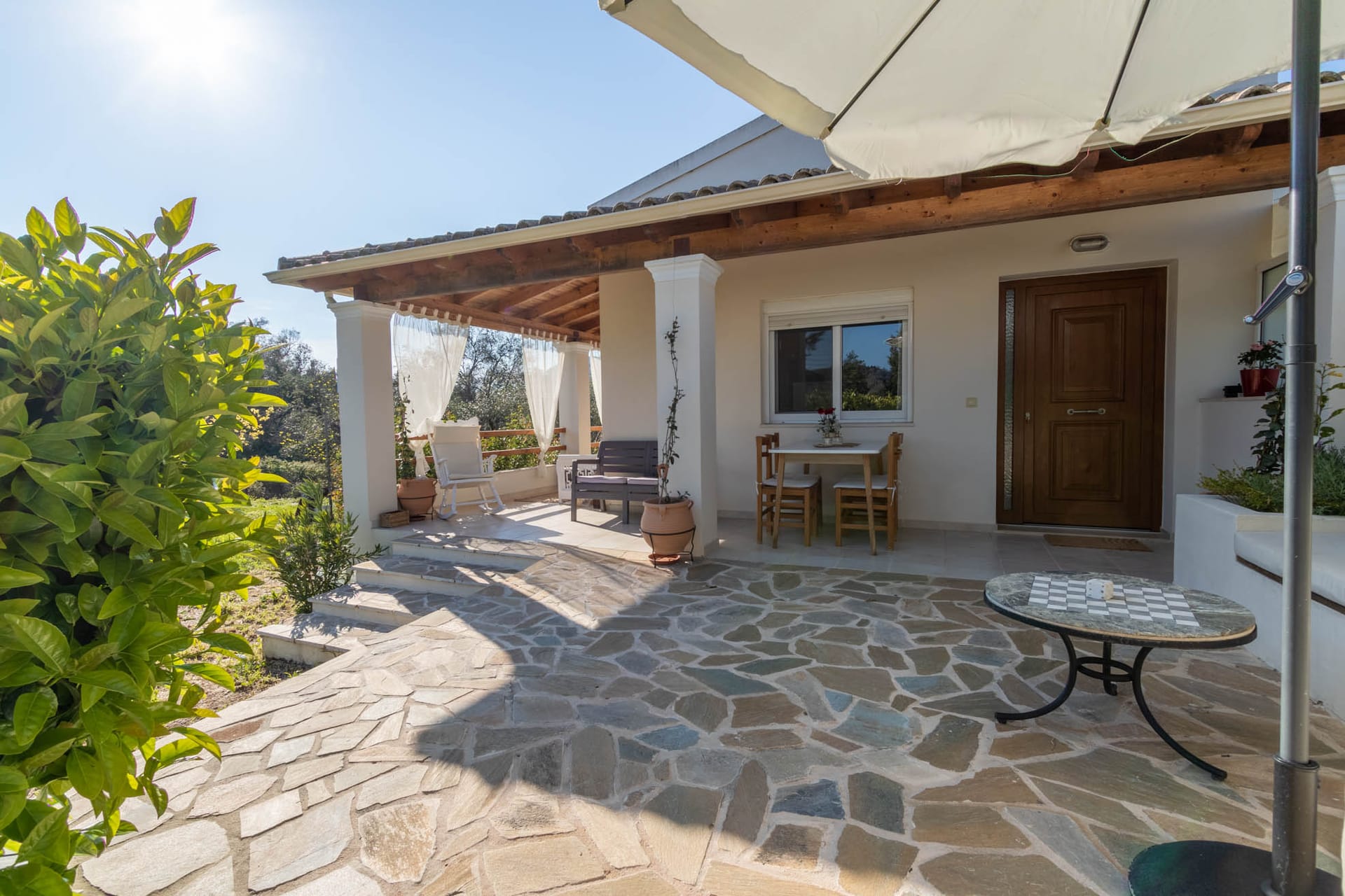 Spacious terrace with dining and barbecue facilities & direct access to the naturally lawned garden area with olive trees etc. where you can enjoy the sun loungers and umbrellas.
