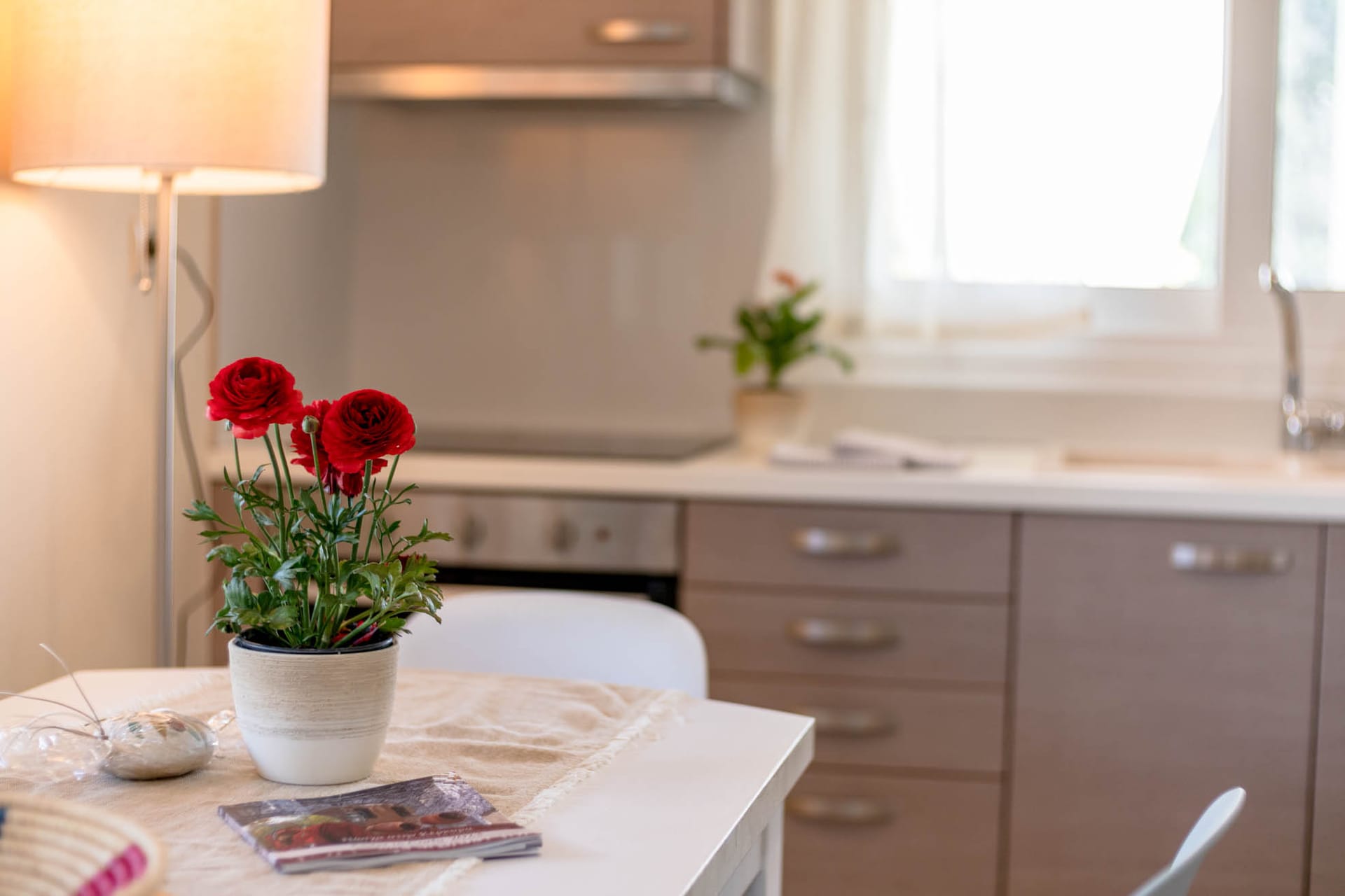 Open plan kitchen with windows and view to the garden and terrace area. It has access to the outdoor terrace and dining area through the main entrance door. The kitchen is full equipped and includes: oven, ceramic stove top, spacious sink, kettle, toaster, dining table etc. plus sofa bed for an extra person.