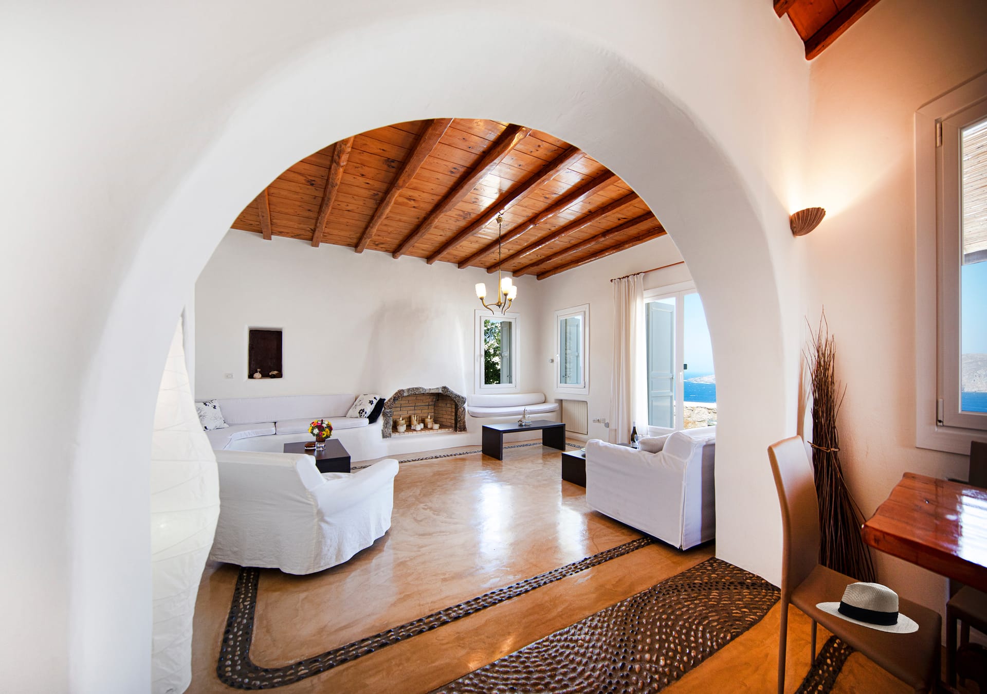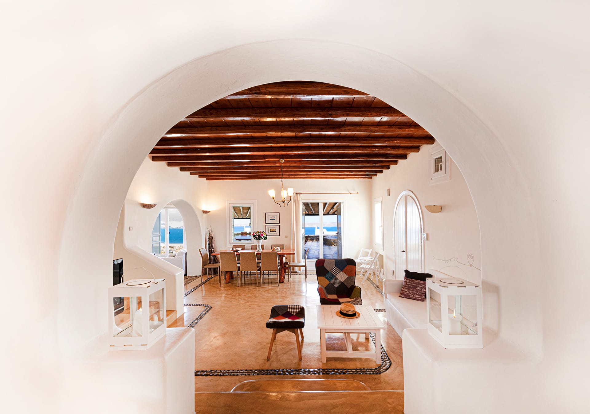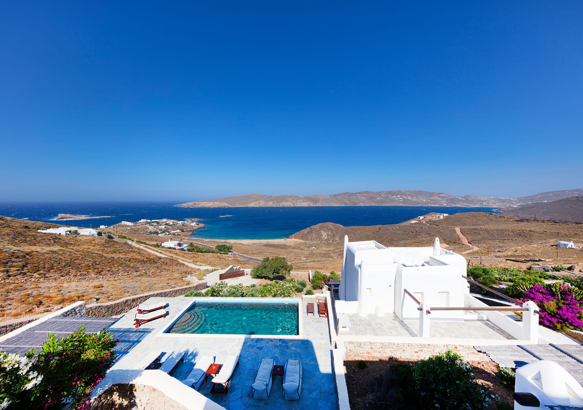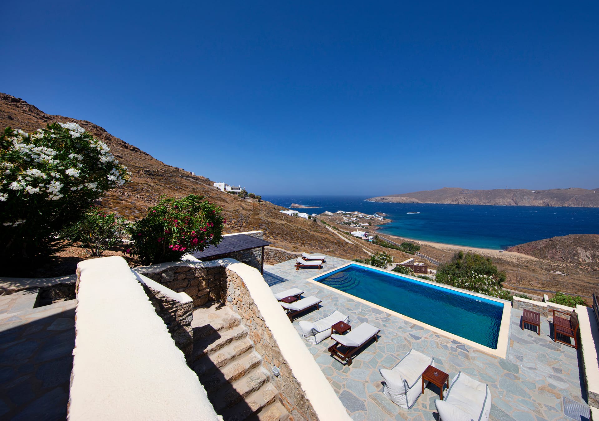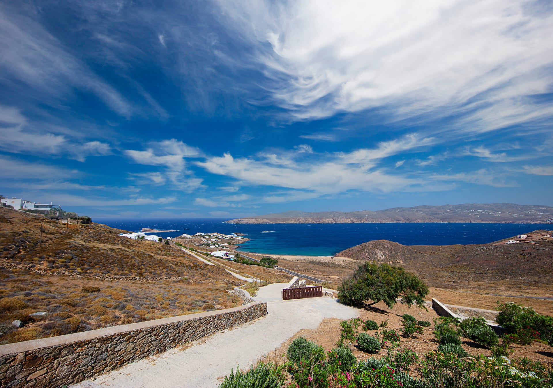 The villa enjoys a privileged position with extensive sea view over the Aegean Sea and the northern coast of the island, which unveils the true beauty of Mykonos Greece original landscapes. It is eight minutes away from Mykonos town and near to island's cosmopolitan attractions.