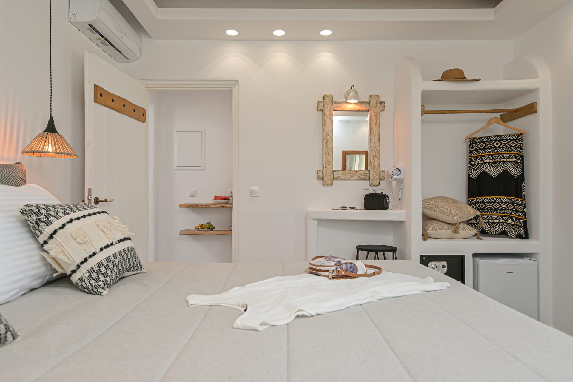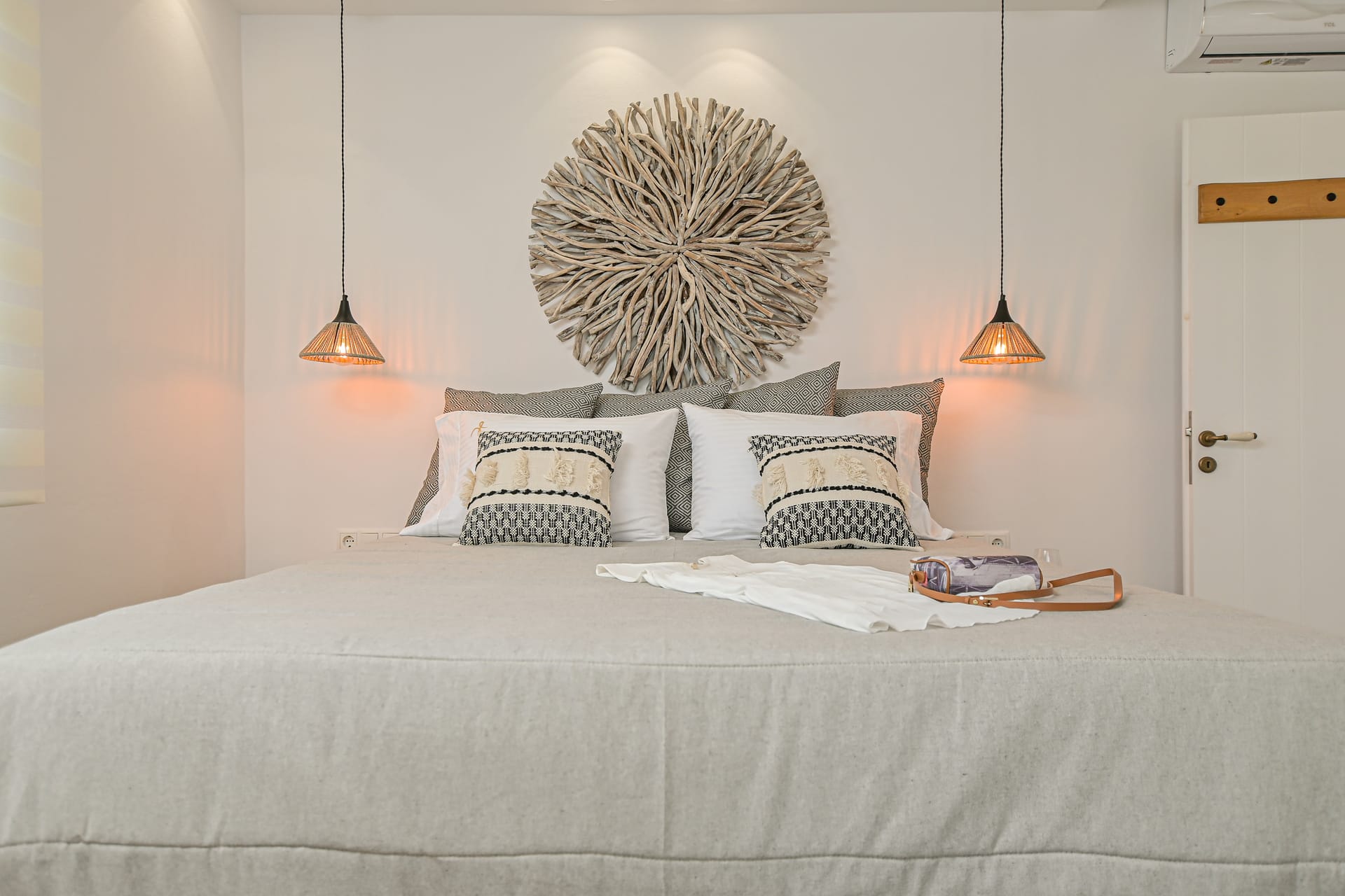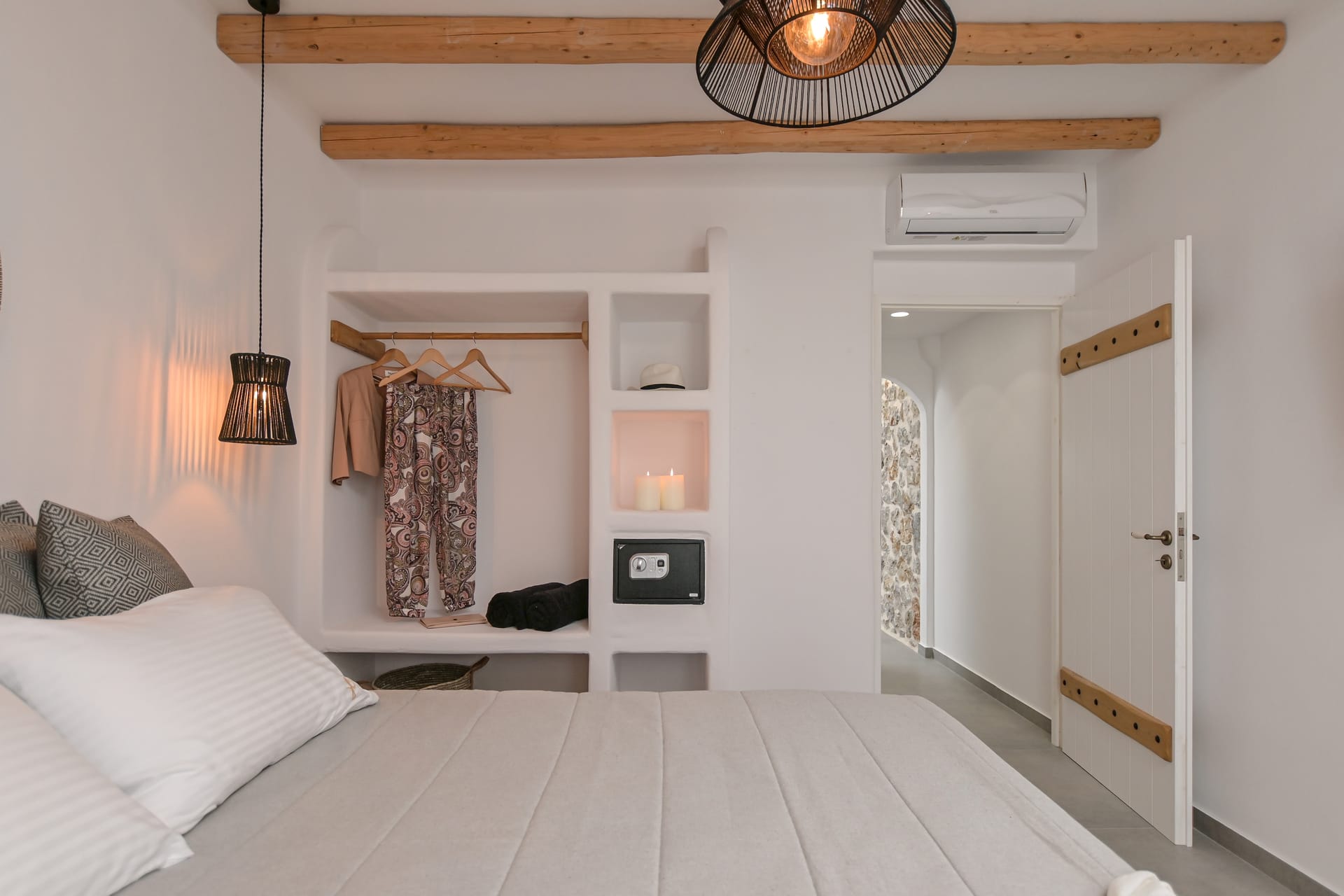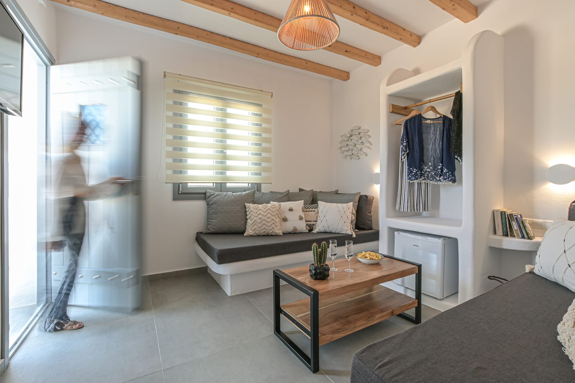 They have minimal geometric lines both in their furniture and decoration. Light earthy colors dominate all fabrics and surfaces, ideally enhancing the mood for relaxation.