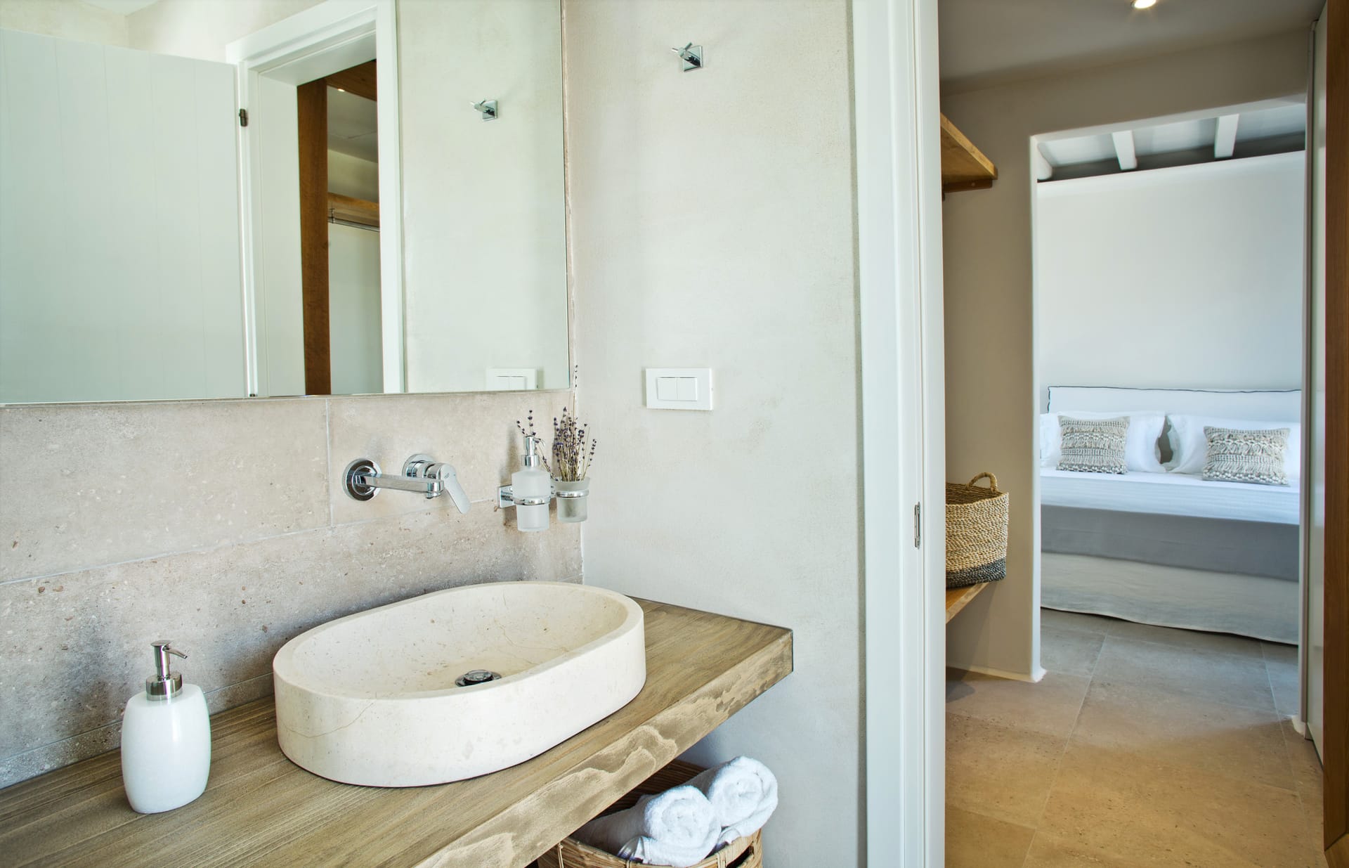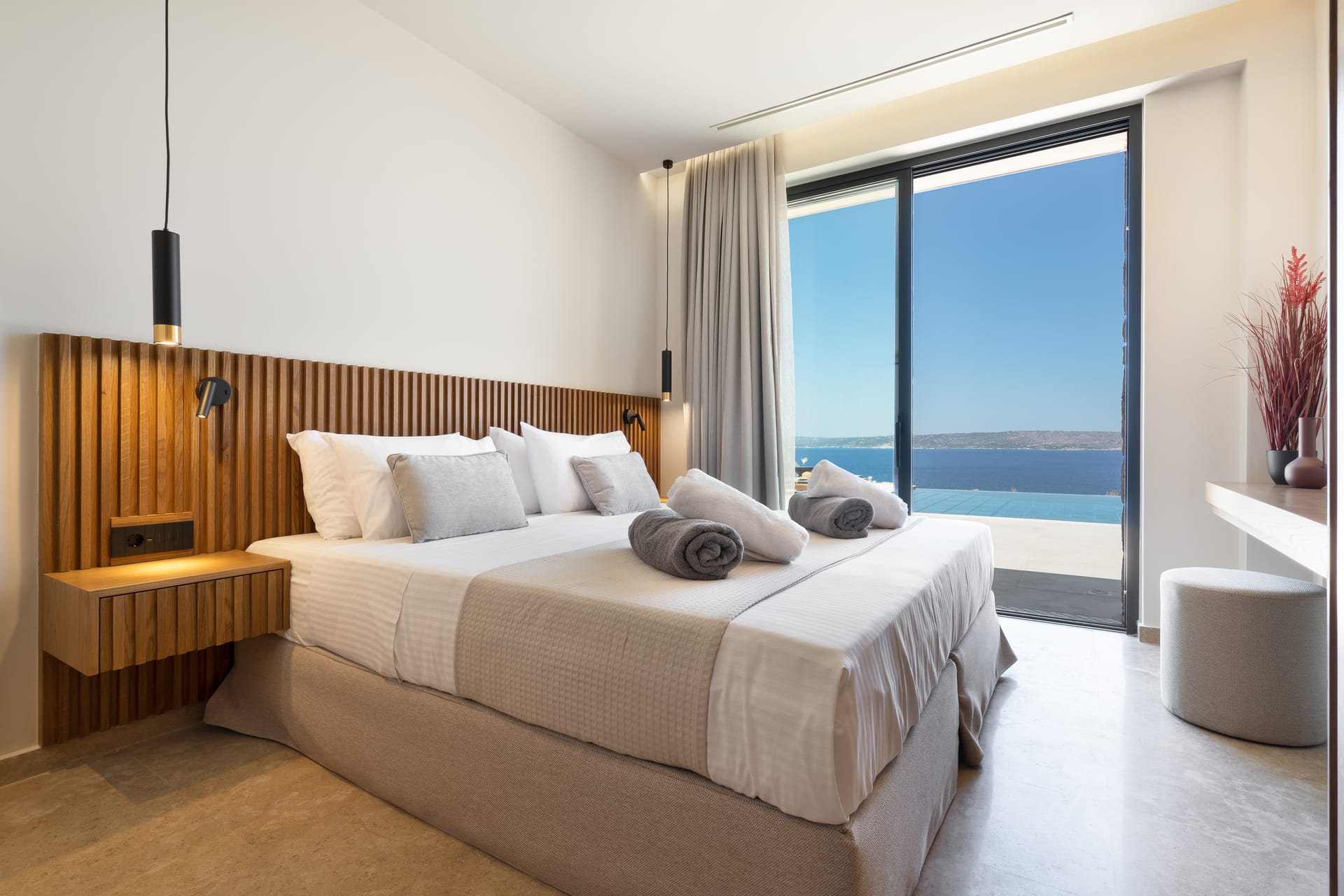The residence is a fusion of traditional whitewashed Cycladic architecture with modern minimalism; an island pallet of colors and natural, locally sourced stone adorns the interior and exterior of the home – providing a naturally cool, ‘clima effect.’ On the outside, the large private pool offers a breathtaking view of the sleepless sea and the nearby islands. True highlight of the property is the newly built and fully equipped state-of-the-art gym in of 31sq.m, that offers great views of the area.