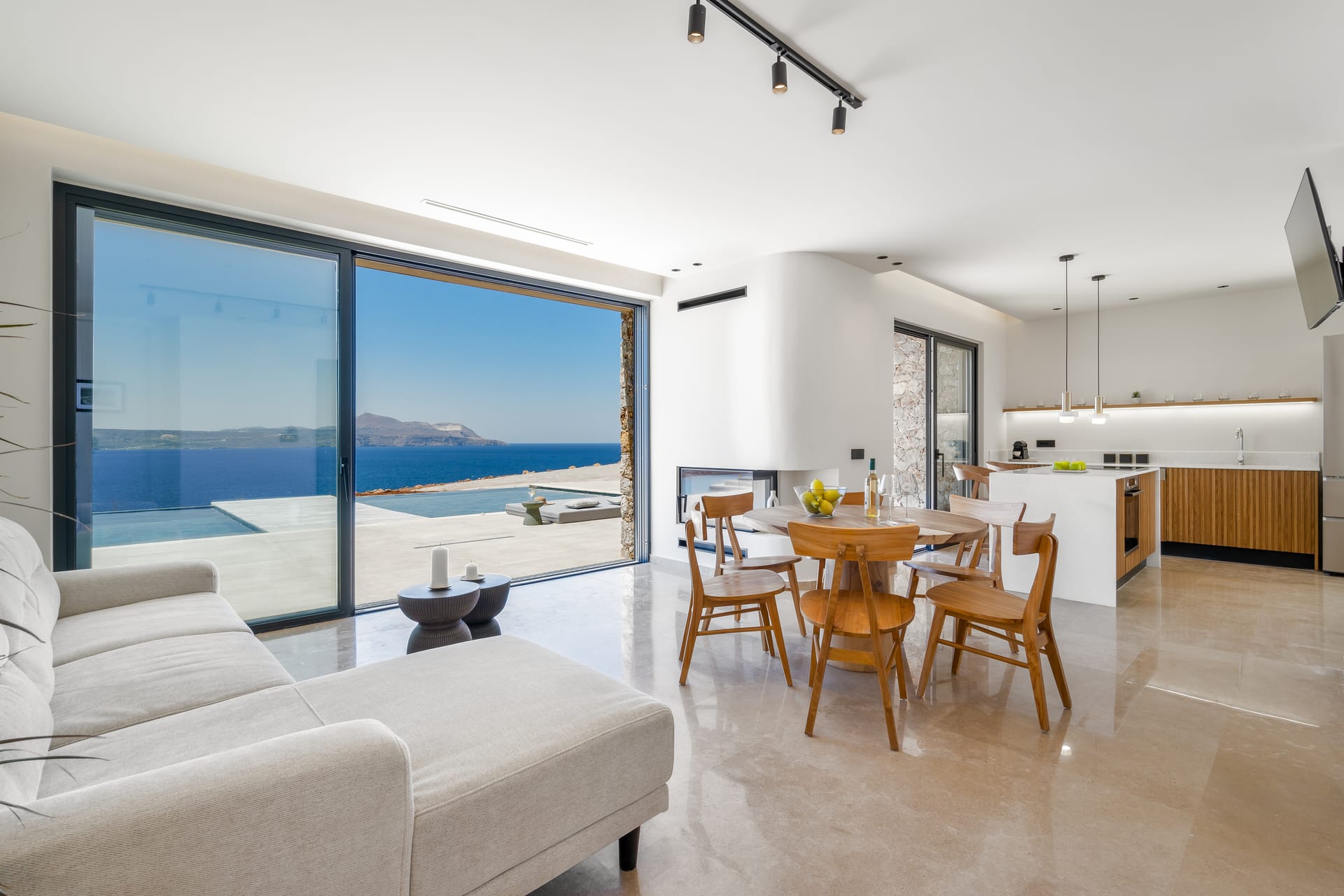1 x open-plan living area with a fireplace and a sea view