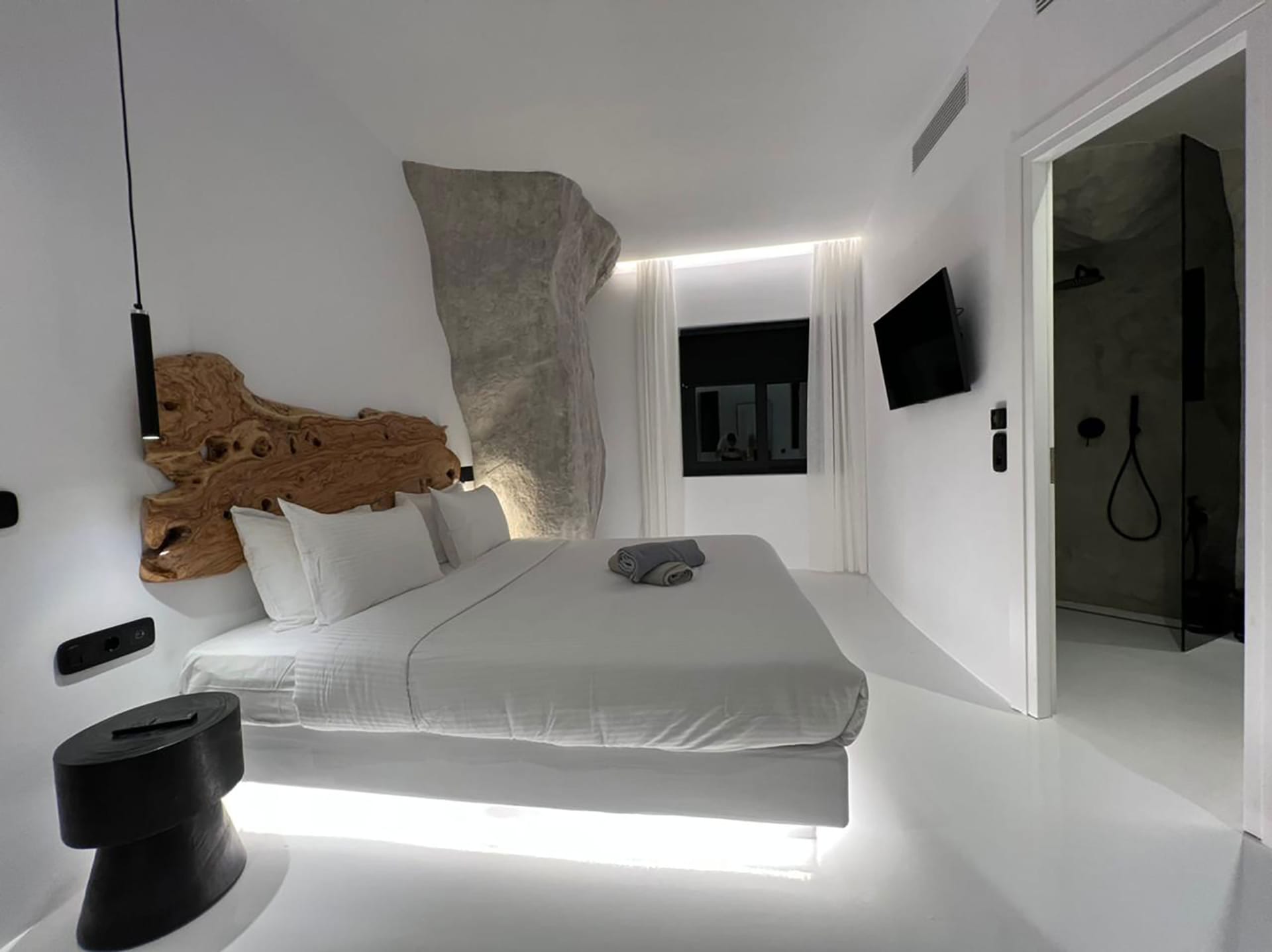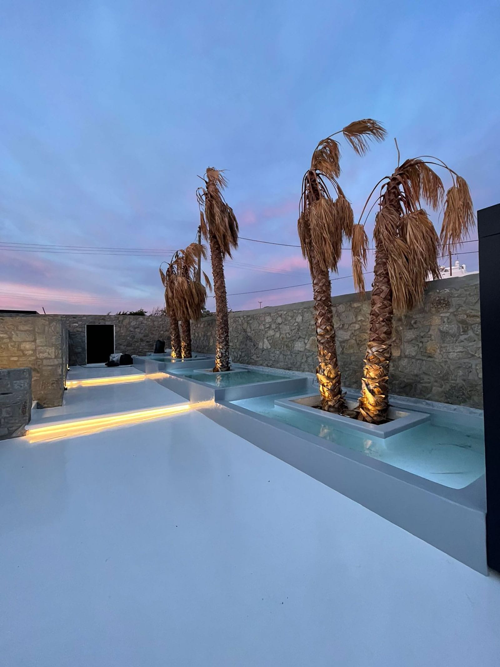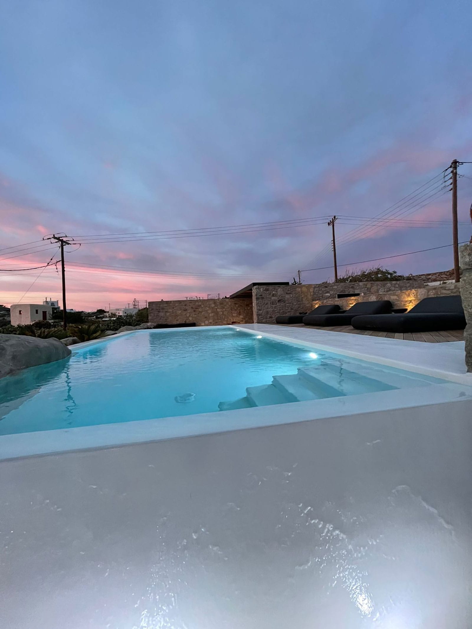 The outdoor area has an infinity private swimming pool, a cave pool, a large jacuzzi, sunbeds, very nice lounge areas, and a shaded dining table, all with unobstructed sunset and Aegean views. The perfect villa to discover and explore all the vibrant spots of the island of winds.