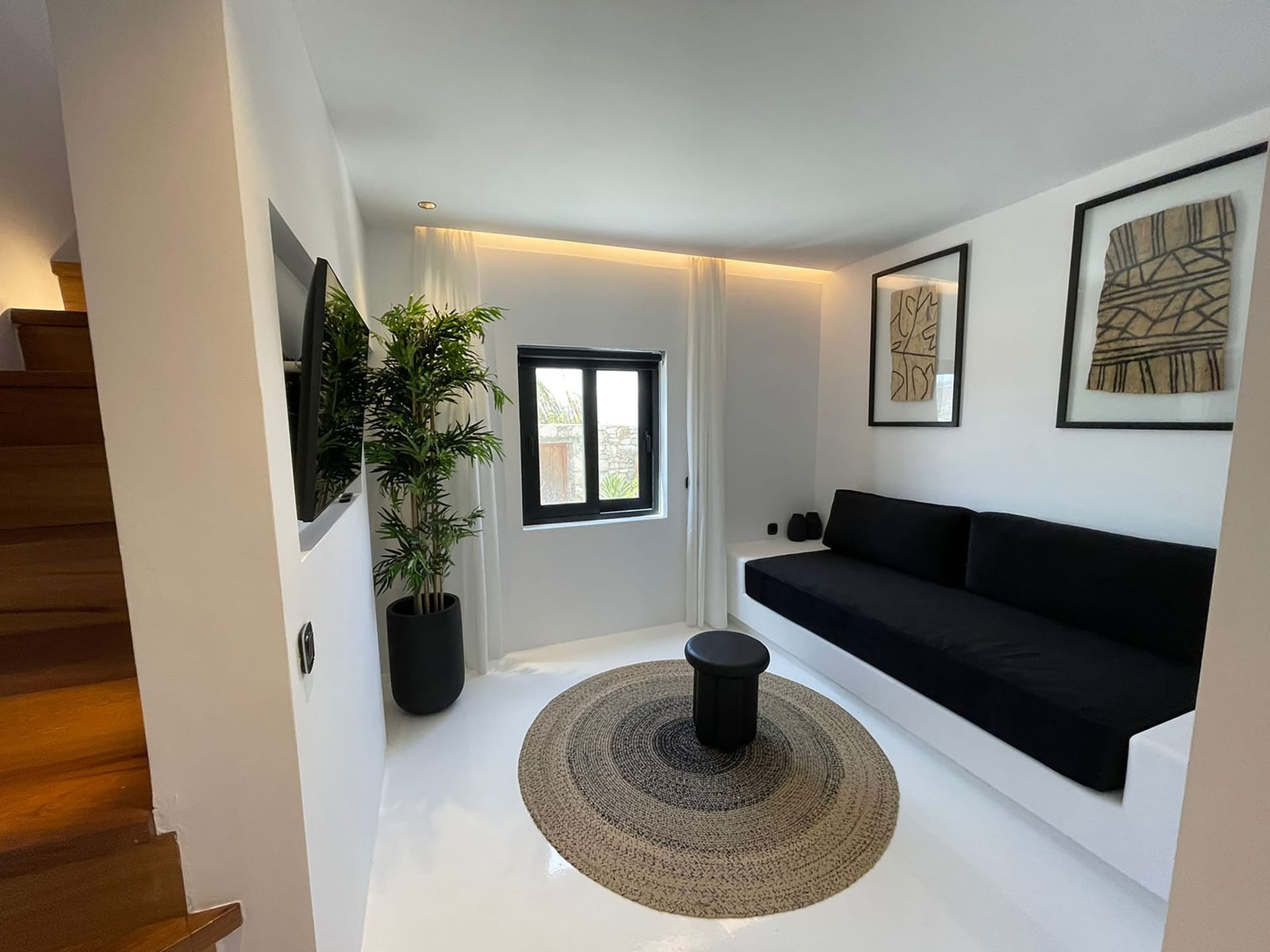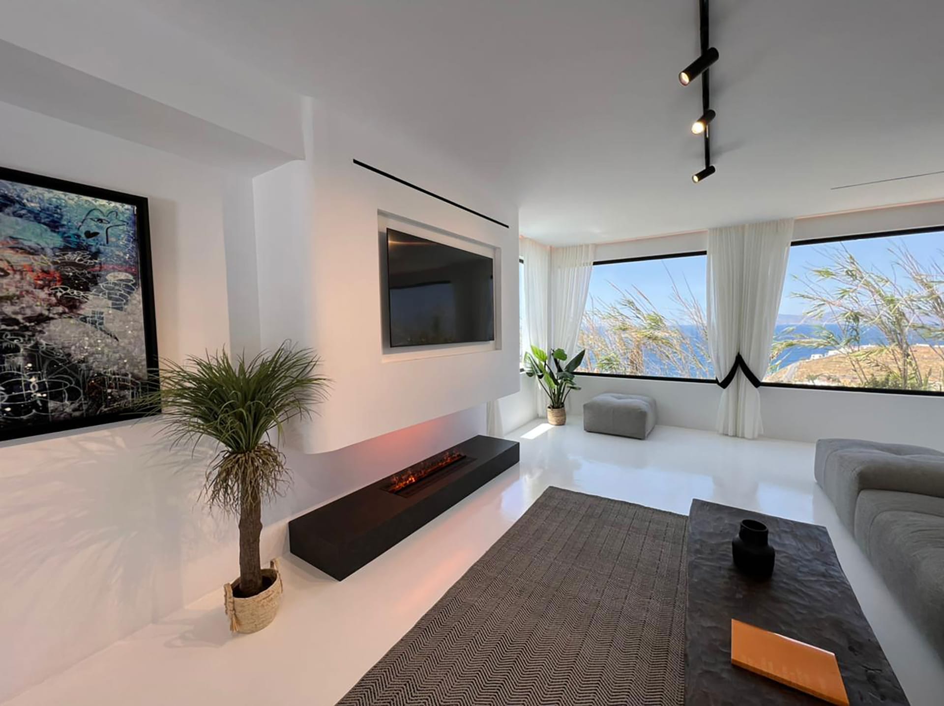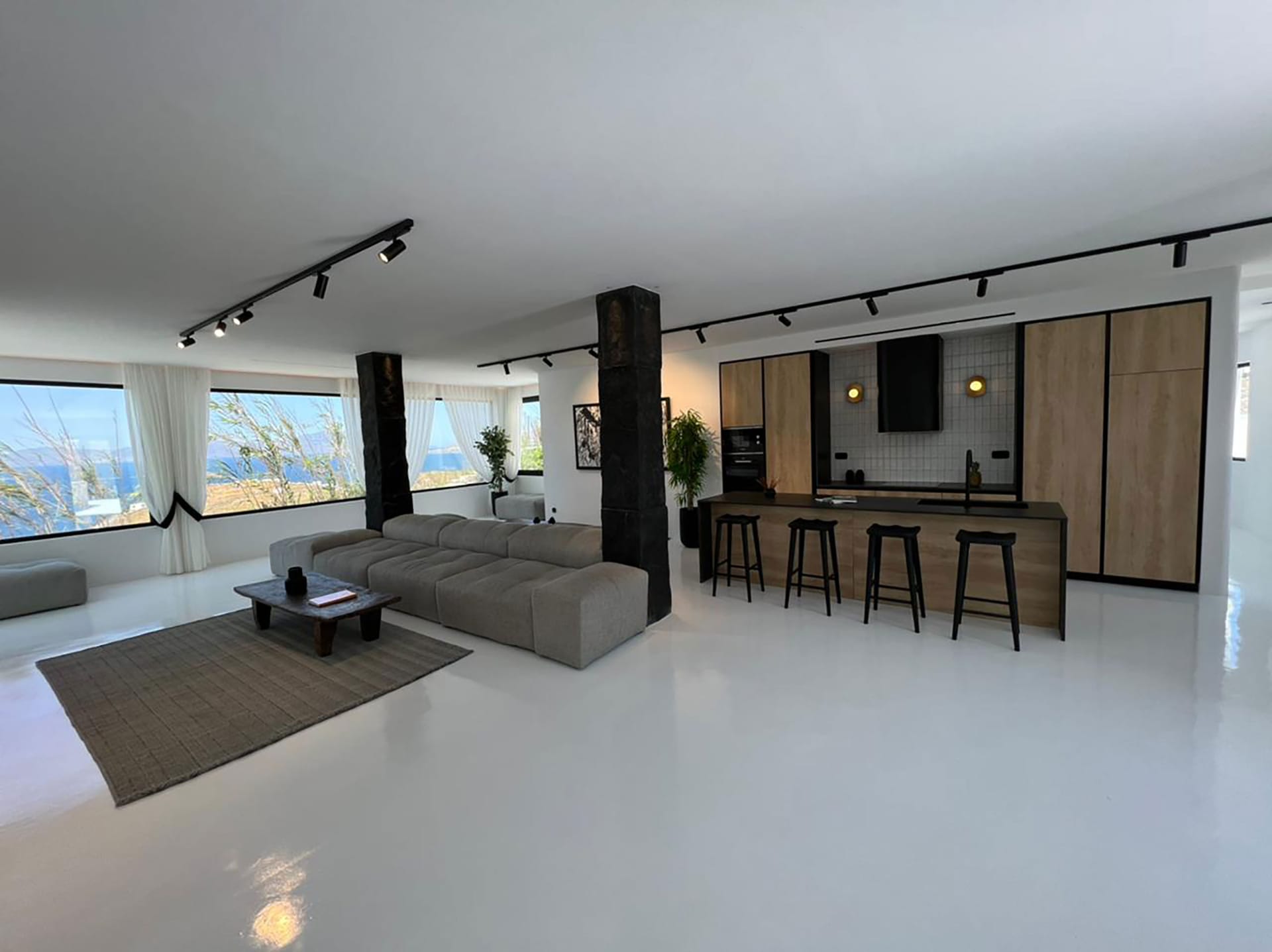 This luxury property is located very close to Mykonos town and to the most famous southern beaches. The Villa has a minimal design with whitewashed and black touches with enormous windows overlooking majestic views. Modernist in structure but with a strong Cycladic heart.