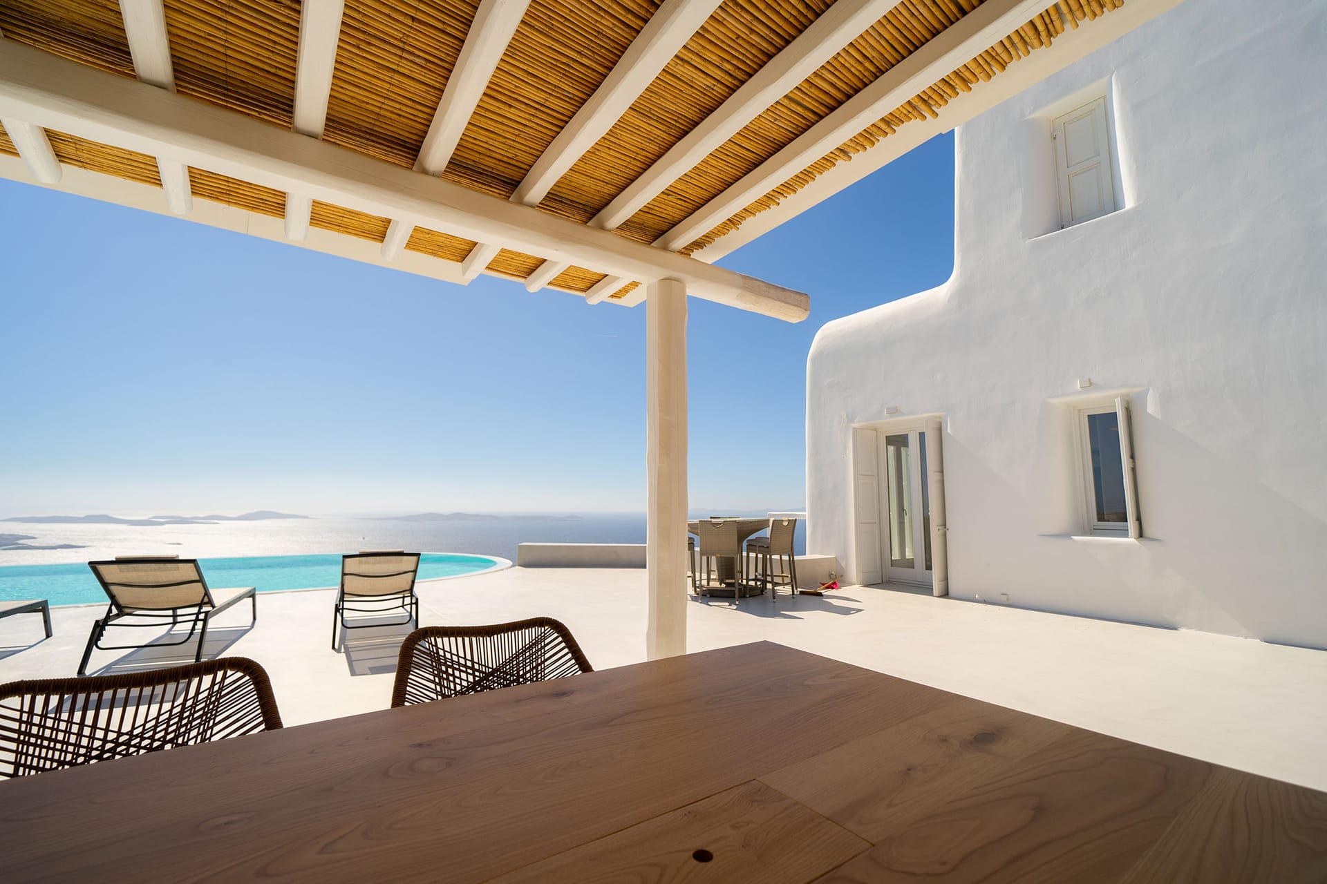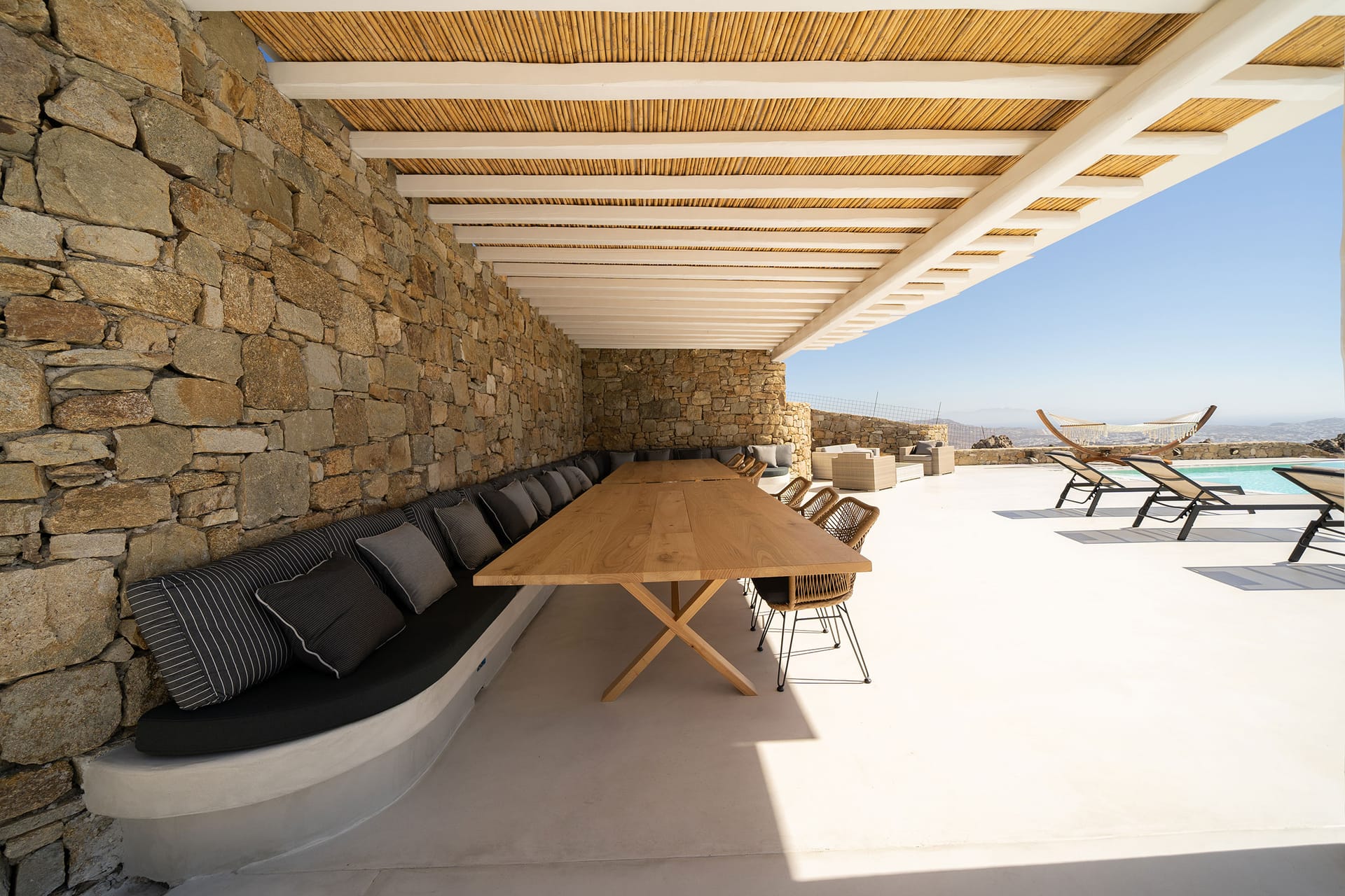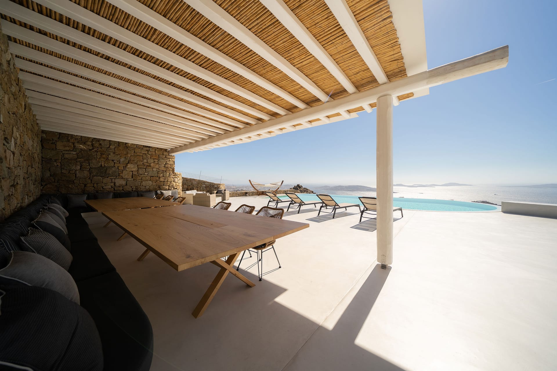 In the outdoor area, you will find a private infinity swimming pool with comfortable sunbeds, BBQ facilities, a shaded lounge, and a dining area and, a hammock, The terraces, and balconies have also lounge and dining areas, with magnificent sea views.