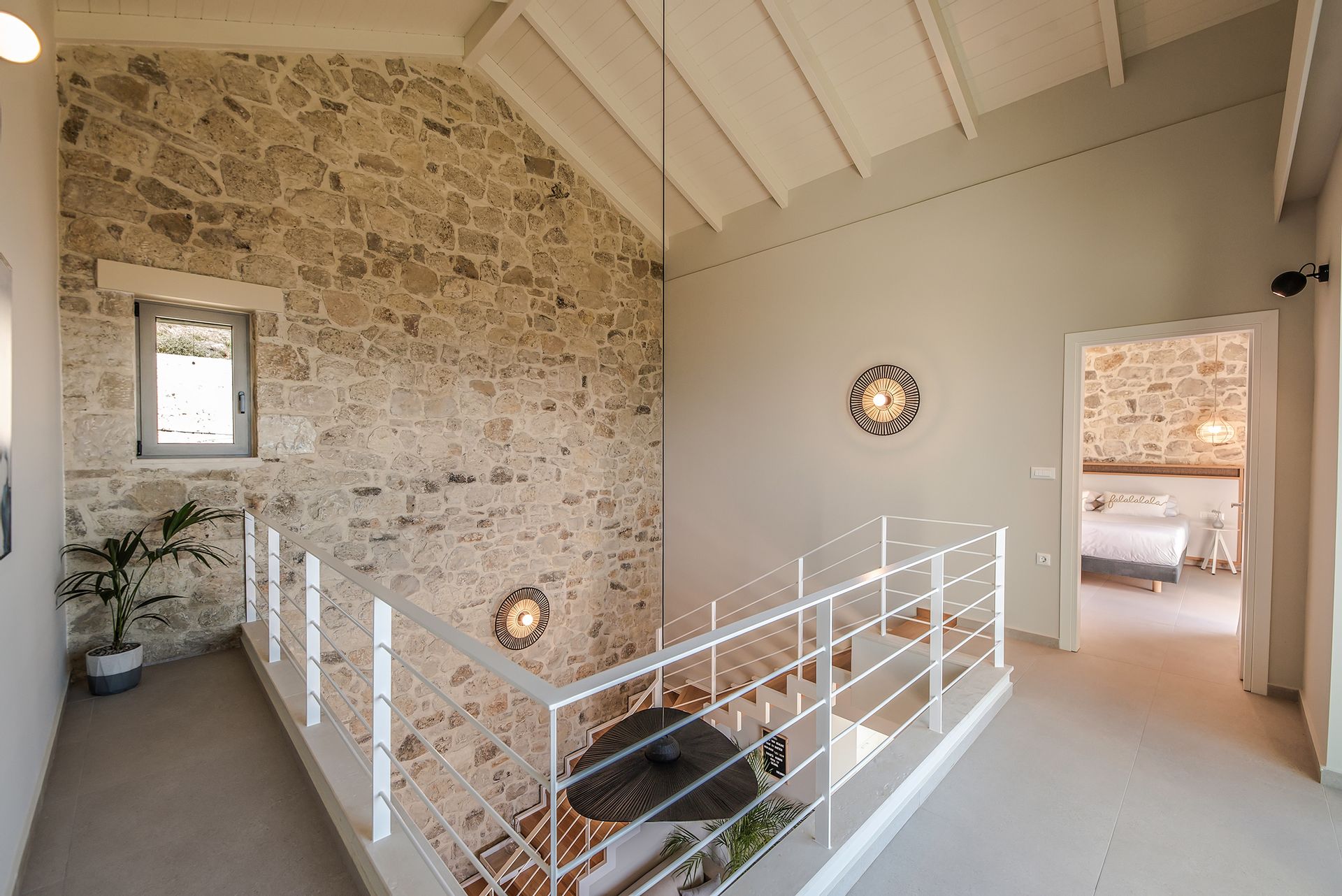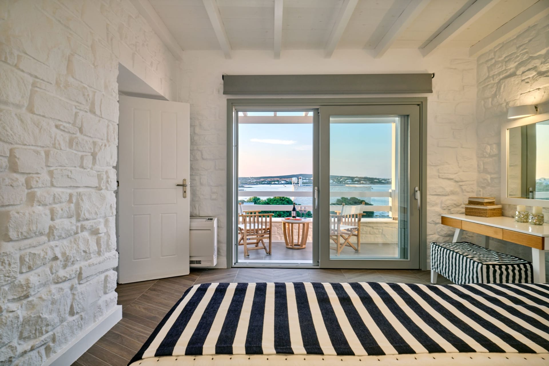 Villa Agave offers an elegant blend of comfort and luxury, featuring 4 bedrooms and 4 en-suite bathrooms, accommodating up to 8 guests with ease. The villa spans three thoughtfully designed levels: the ground floor, pool level, and top floor. The ground level boasts an open-plan living and dining area, a fully equipped kitchen, a staff room, and a generously sized guest room for added privacy. On the pool level, you'll find a cozy double bedroom with an en-suite bathroom, complemented by a spacious living area with a charming fireplace. The top floor is home to the luxurious Master Bedroom, which includes a private living area, an en-suite bathroom, and a secluded balcony offering breathtaking views of the bay and Naxos Island—a serene haven for relaxation and admiration of the stunning surroundings.