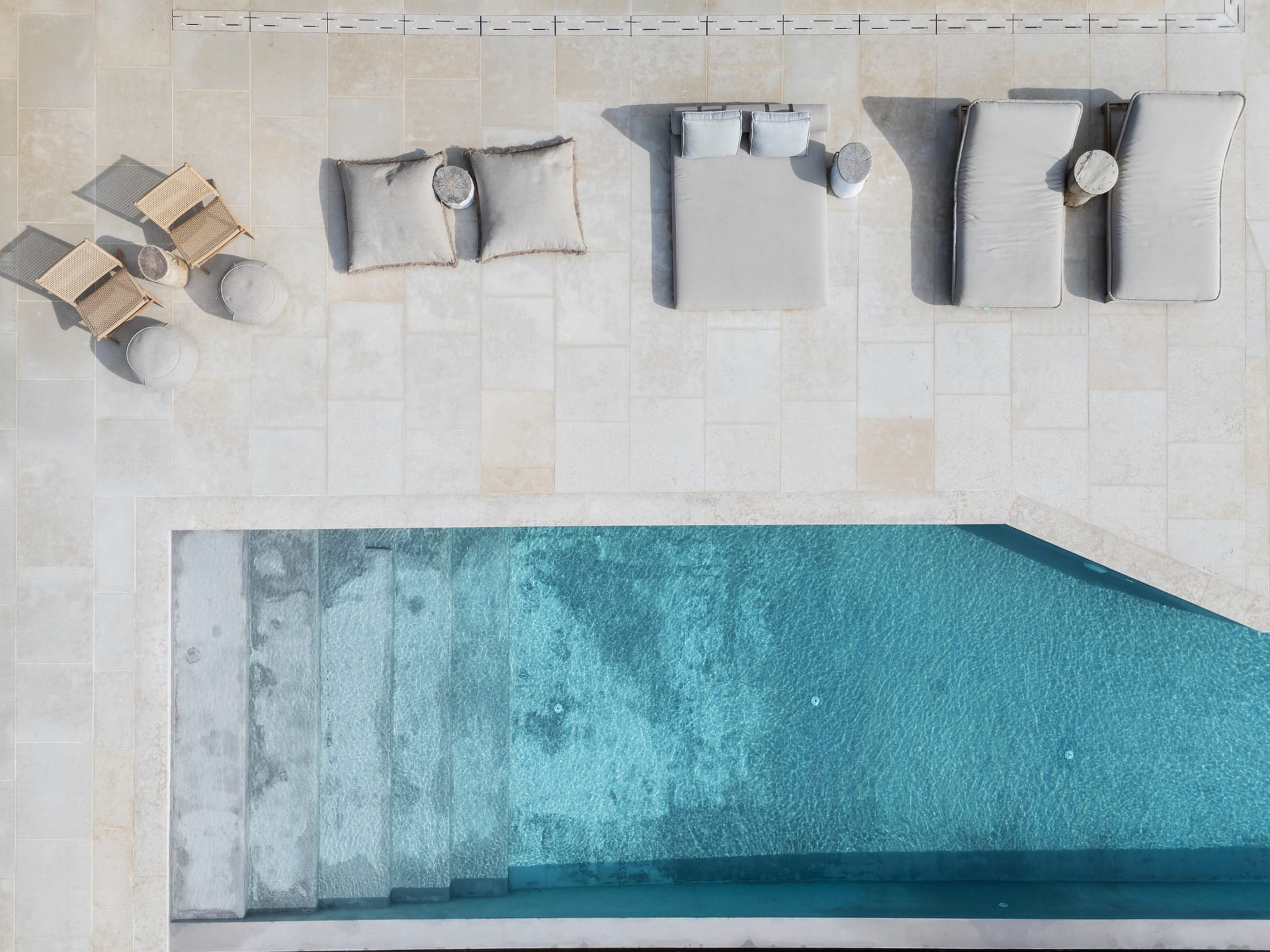 The villa’s captivating exterior offers a spacious pool area with comfortable lounge spots and an al fresco dining space beneath a shaded pergola—perfect for relaxing and enjoying the unique ambiance of Sea Whisper Villa.