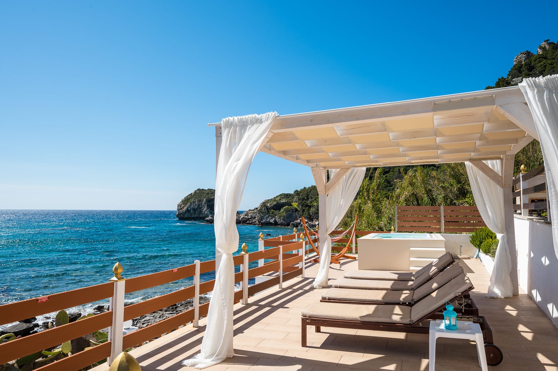 A plunge pool completes this tranquil environment, where green meets the endless blue of the sea.