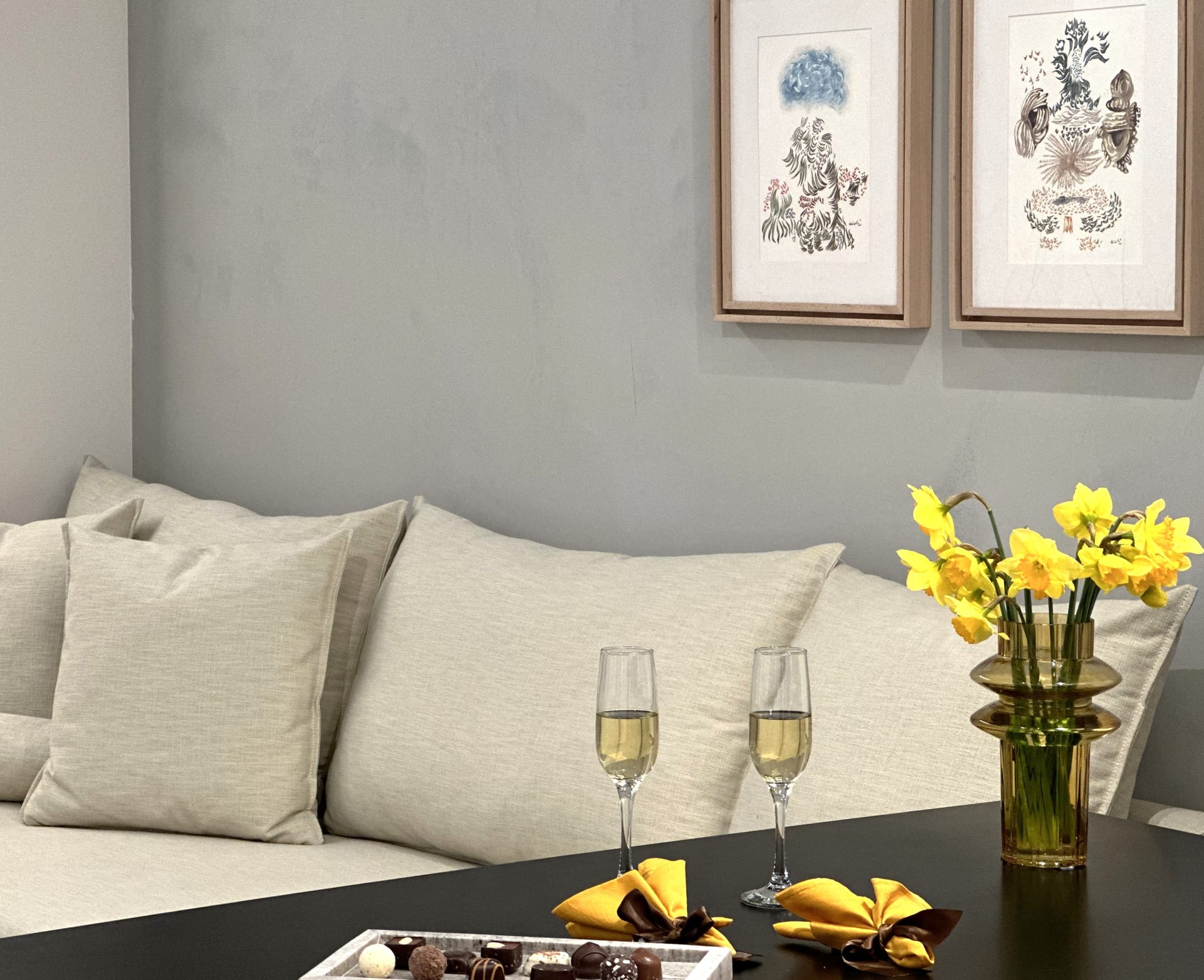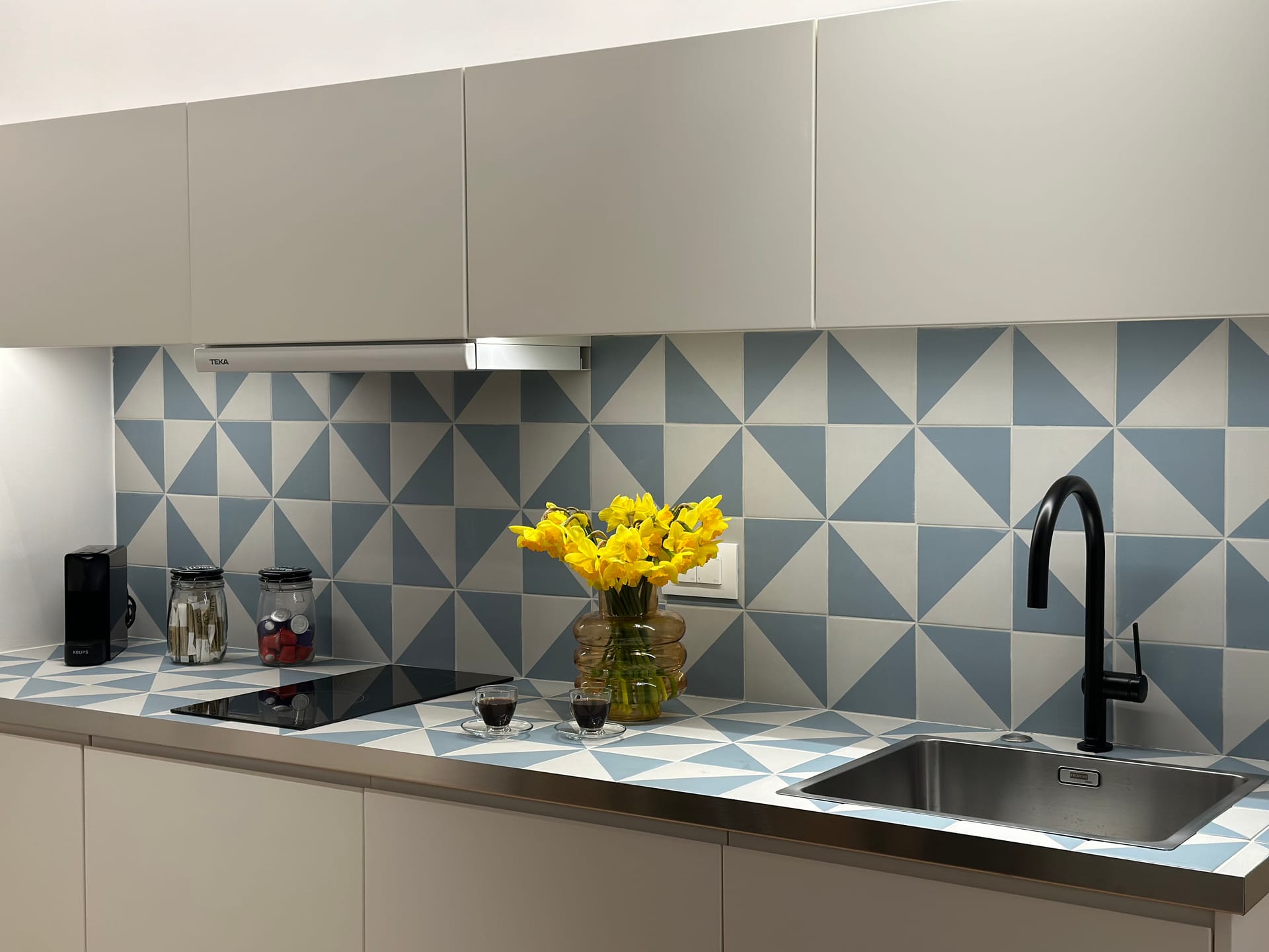 Modern glam meets old-world architecture in this beautiful apartment in the heart of Athens! Enjoy this light-filled, contemporary flat with lovely furnishings and well-appointed spaces just minutes from some of the city’s most significant cultural sites. Handsome architectural design details create an urban loft experience that is simply divine! Light and luxury meld beautifully throughout this unit to create a desirable space with a fabulous terrace and views. Relax and regroup as you enjoy your holiday and explore our extraordinary city with so much to offer! The apartment’s main space is an open, flowing floorplan that includes a well-stocked modern kitchen, dining area, and living area. Step through the two large patio doors to access a lovely terrace with pretty views You will appreciate the well-equipped, modern kitchen if you like to cook on holidays. (Of course, you can always head out to a local taverna! Athens is filled with world-class dining, tavernas, and cafes.) The kitchen’s stainless steel appliances are modern and make cooking a breeze. They include a stove, oven, fridge, and items such as plates, cutlery, bowls, chopsticks, plates, cups, coffeemaker and more.