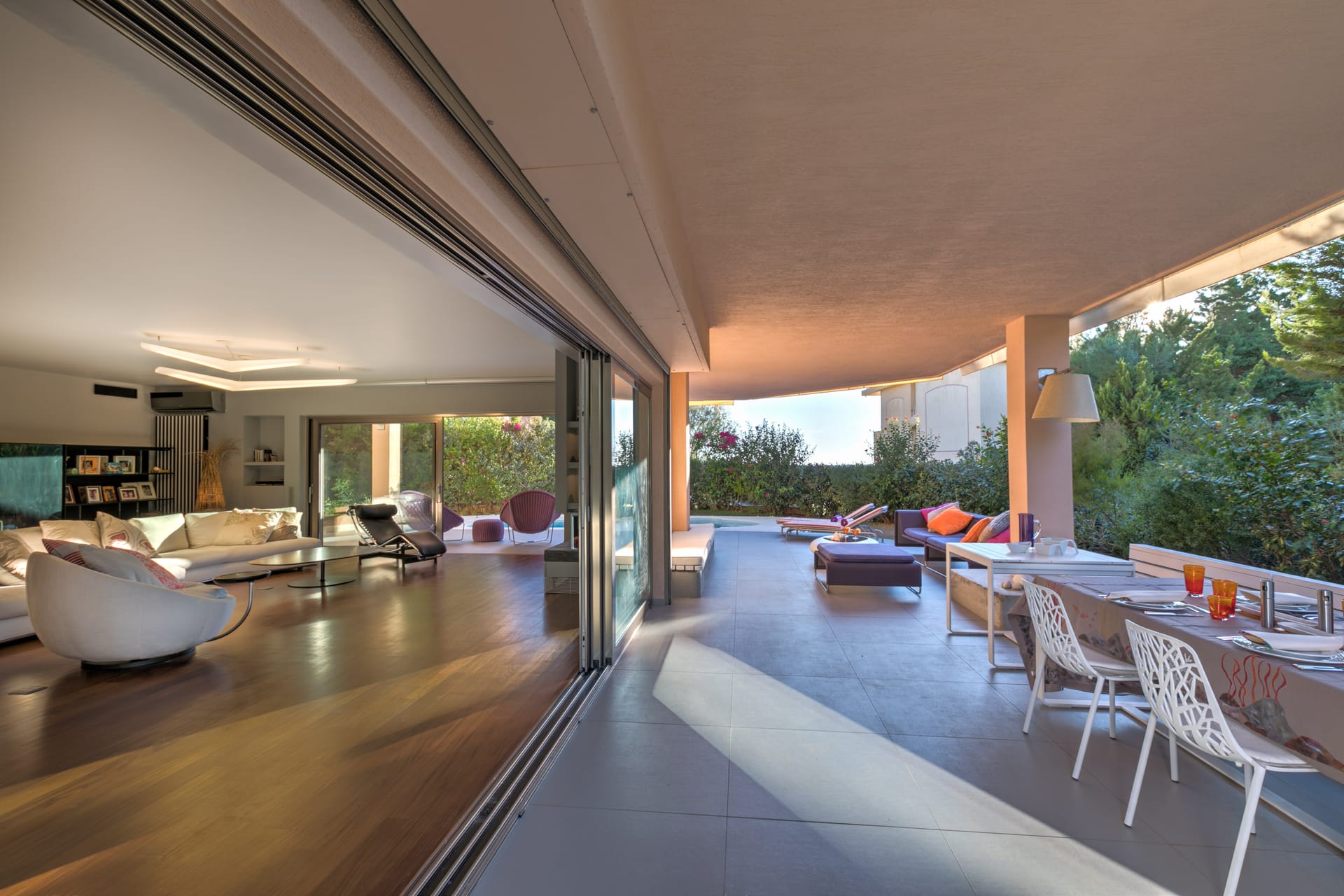 The terrace is where you’ll be lounging mostly during the day. Here, a glittering plunge pool offers private garden views, while plenty of loungers and a choice of al fresco dining areas ensure you make the most of the Greek sunshine. Meanwhile, large sliding floor-to-ceiling doors beautifully connect the wrap-around verandas and the terrace to the indoor living area of the villa.