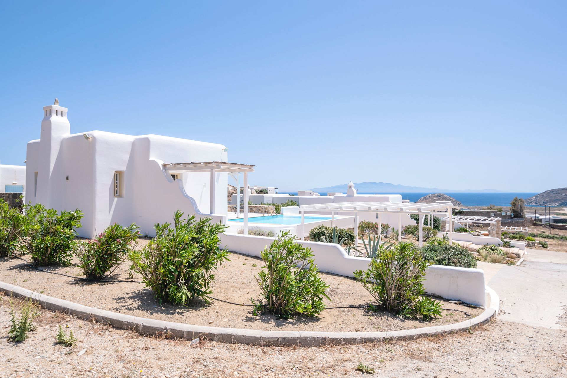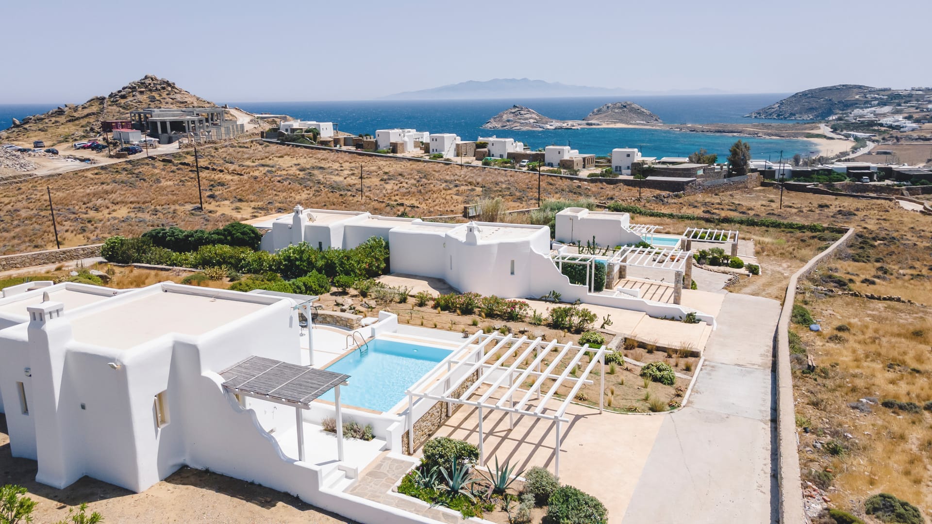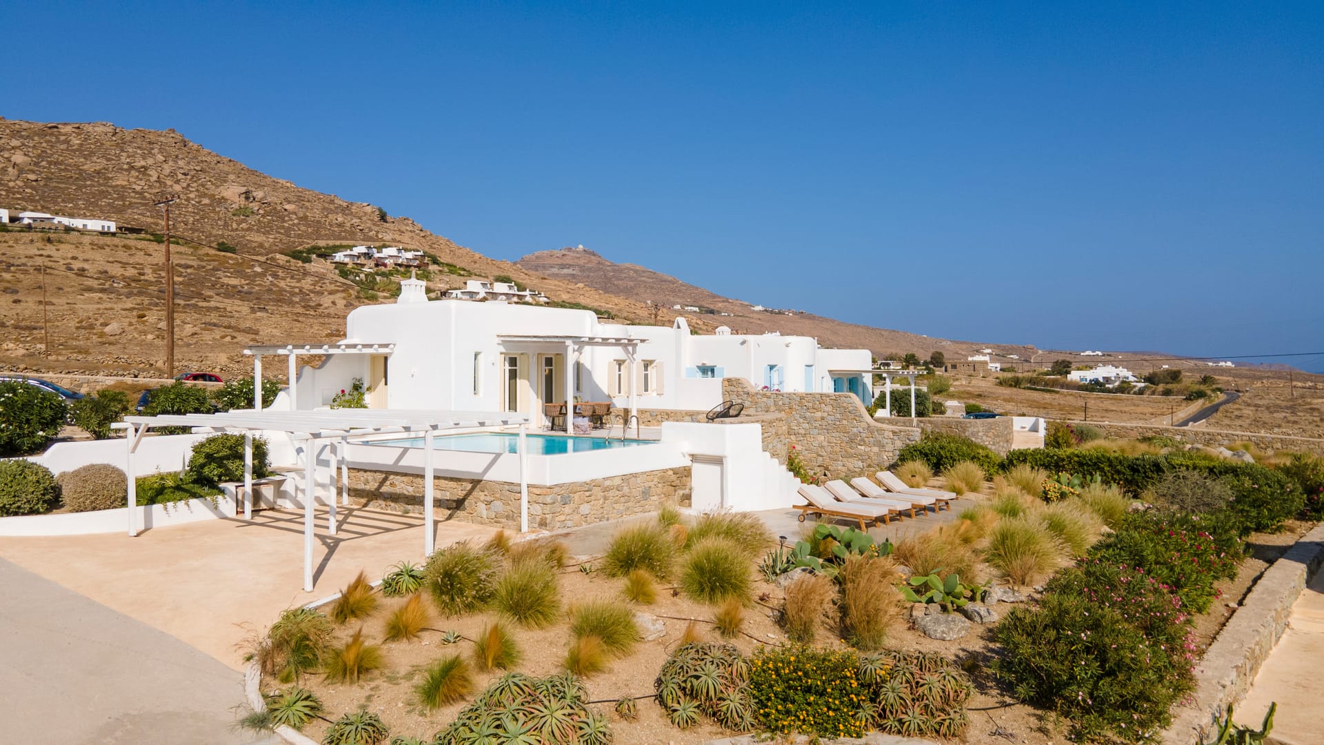 Our Villa is a 107sqm modern Mykonian house with private pool, incorporating 3 master-bedrooms with en-suite bathrooms, kitchen-living room and a large patio and bohemian style garden.
