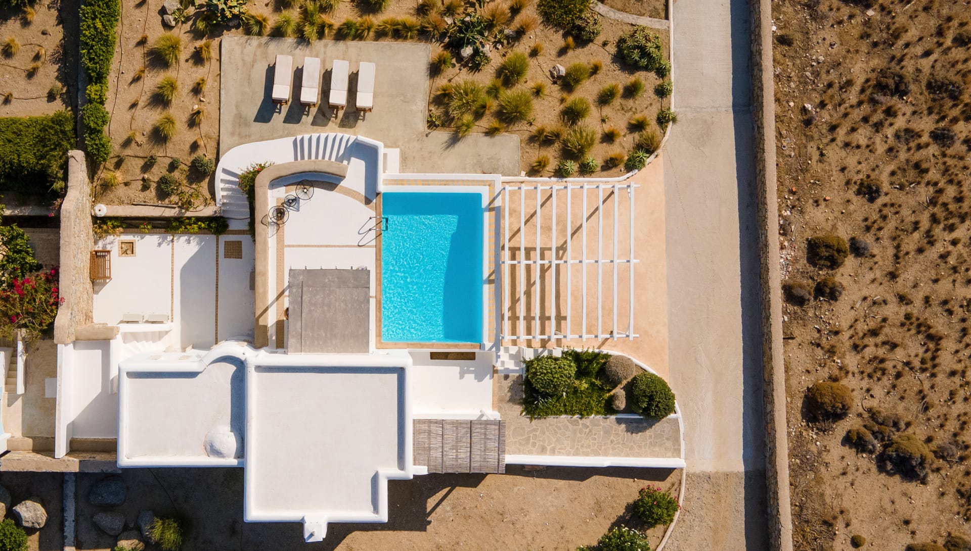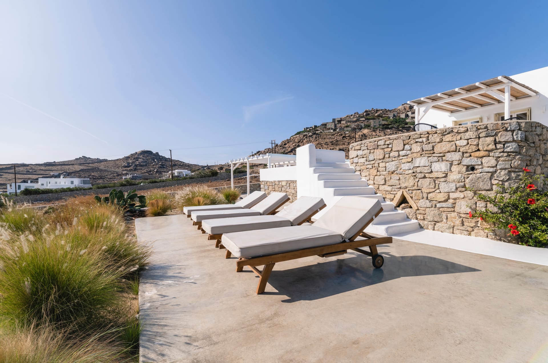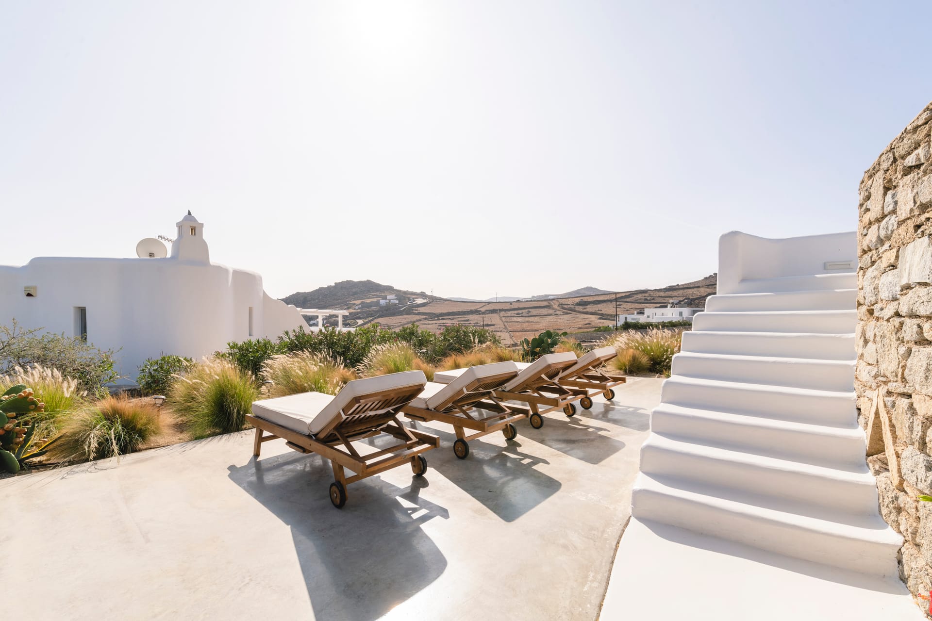 Our Villa is a 107sqm modern Mykonian house with private pool, incorporating 3 master-bedrooms with en-suite bathrooms, kitchen-living room and a large patio and bohemian style garden.