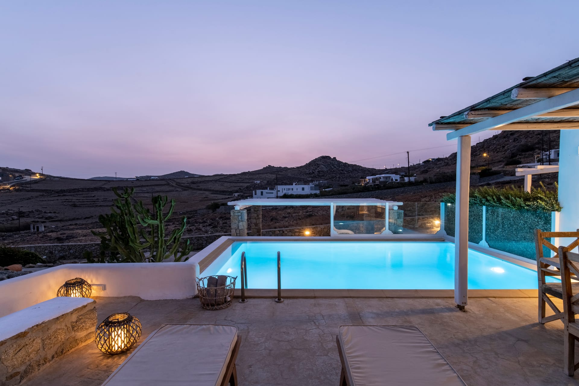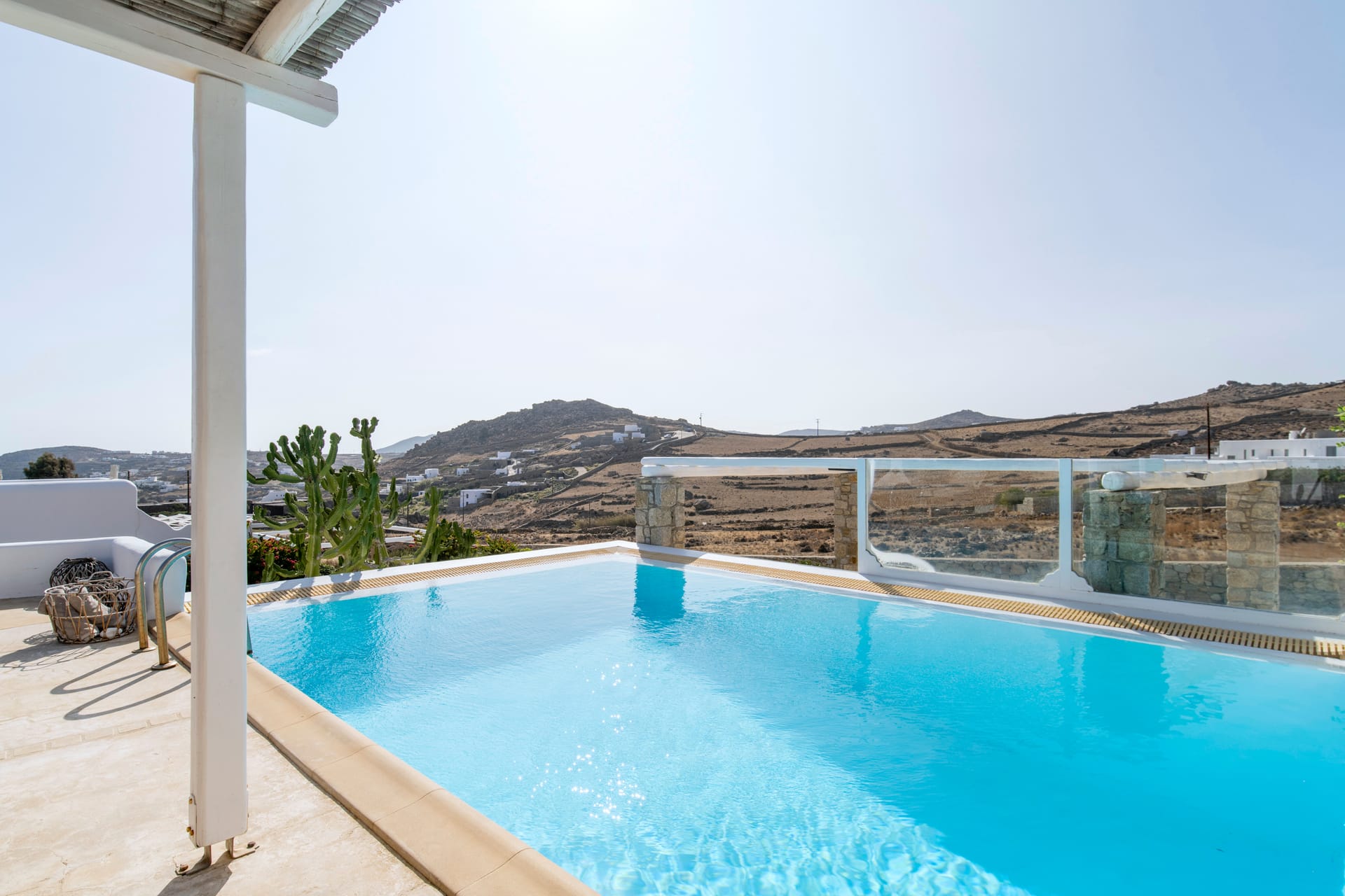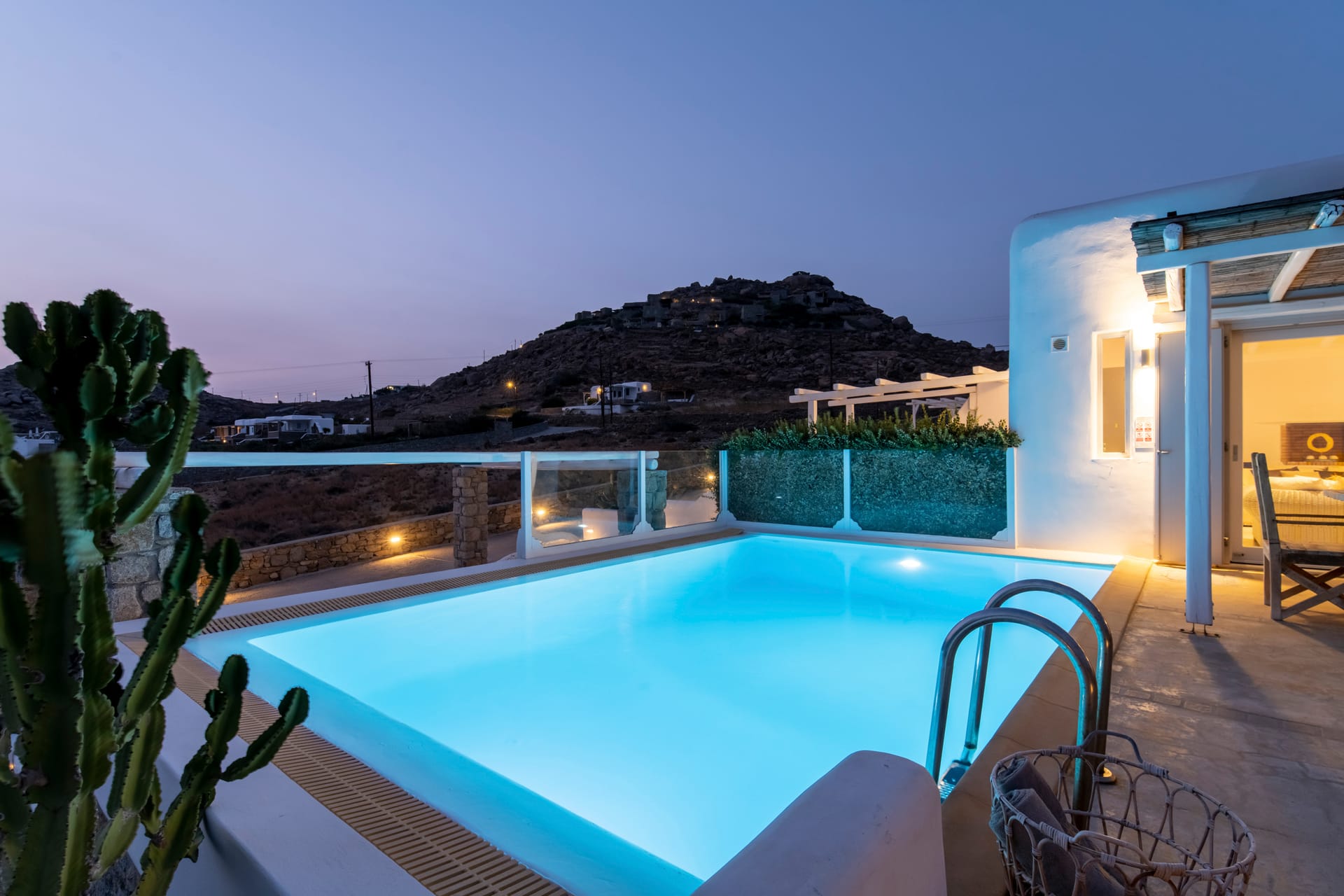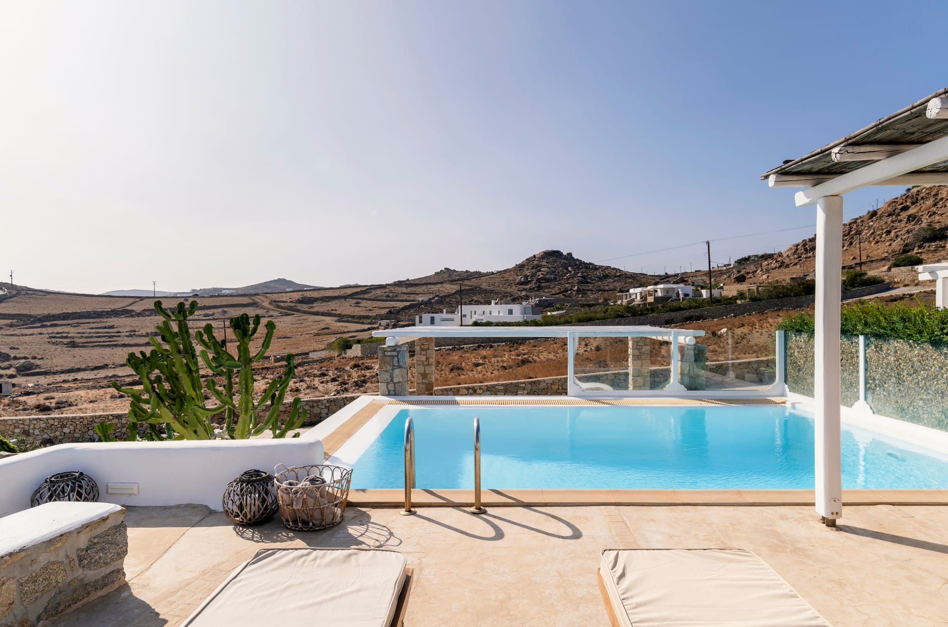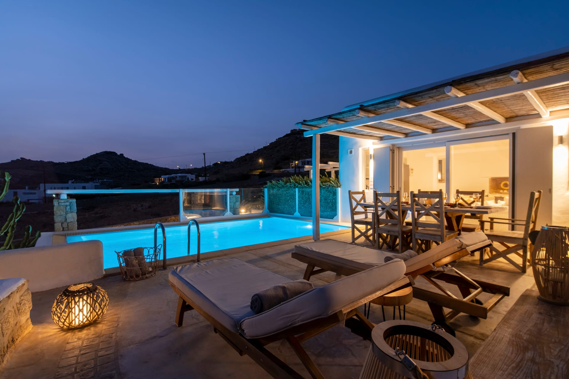 Our Villa is a 105sqm modern Mykonian house with private pool, incorporating 3 master-bedrooms with en-suite bathrooms, kitchen-living room and a large patio.