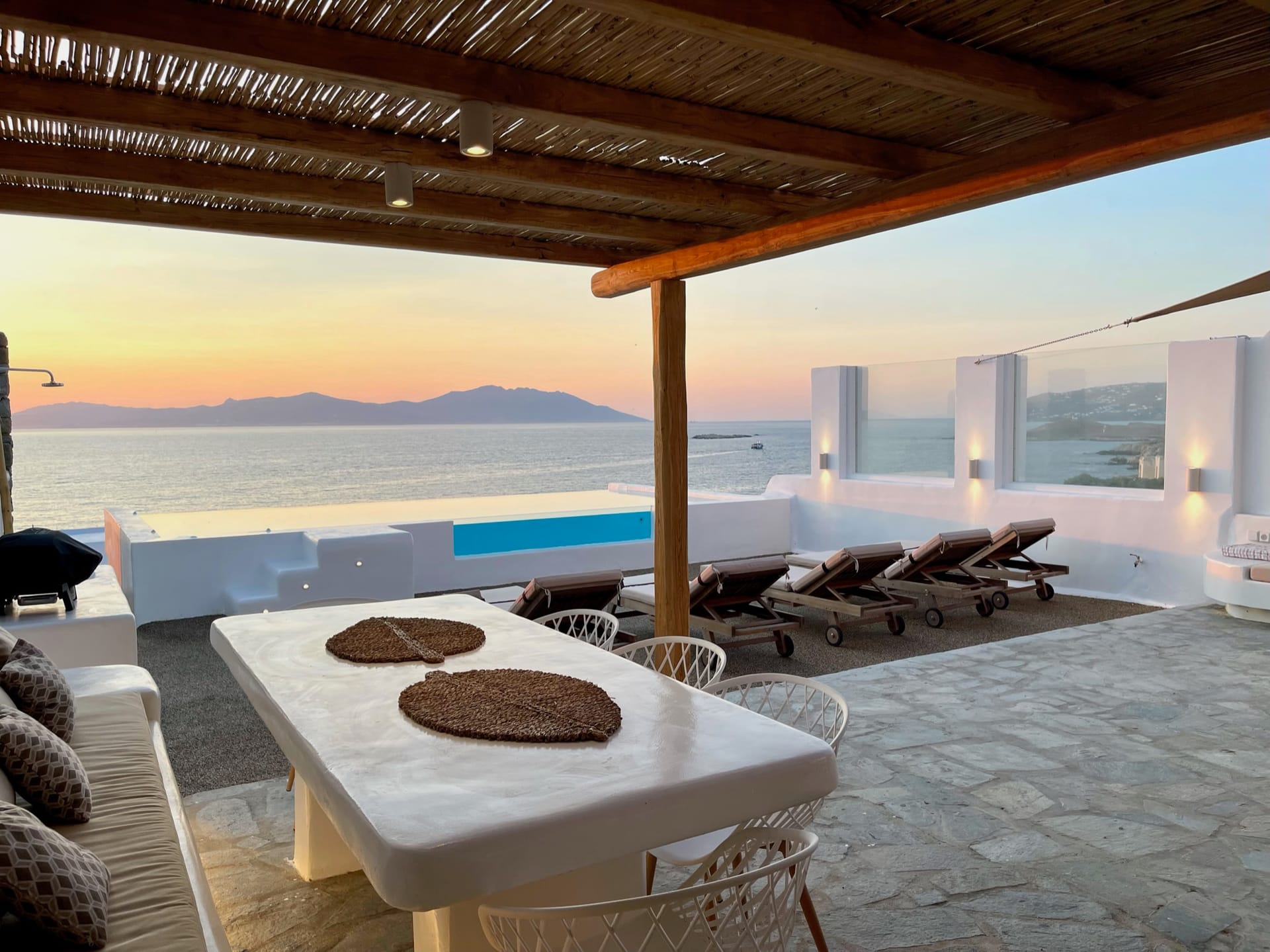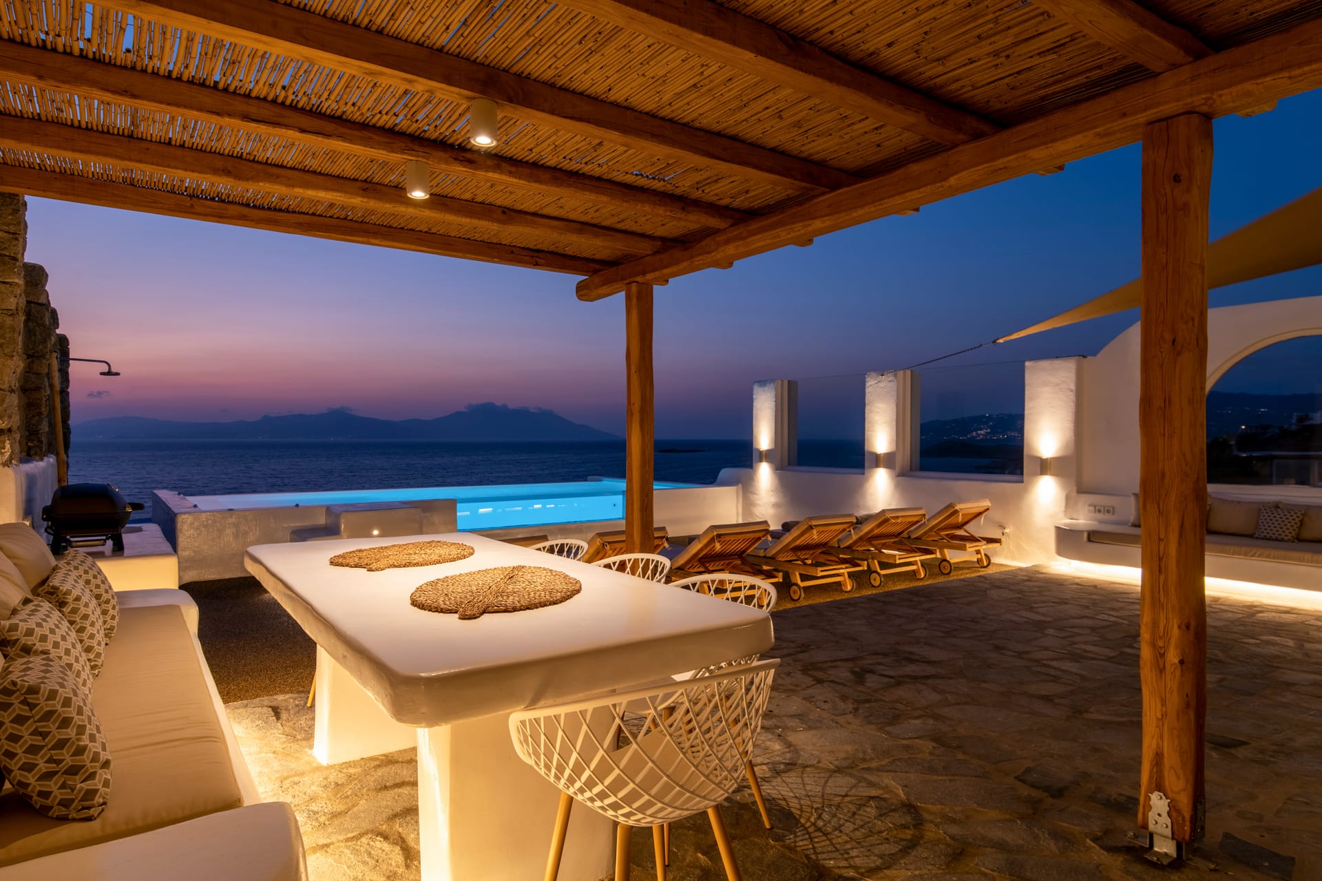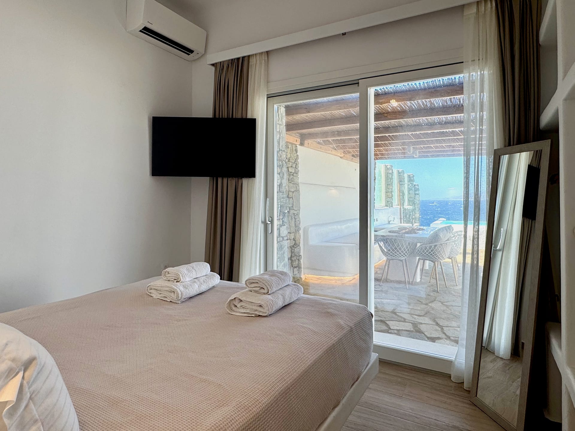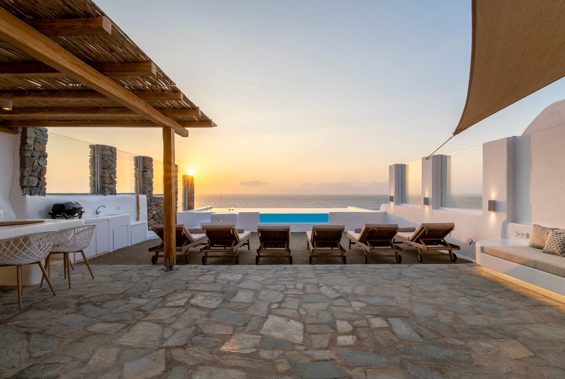 All bedrooms have direct access to the outdoor patio garden (80sqm), providing an ideal space to chill during the day and night, while enjoying the most amazing Sea & Sunset view in Mykonos.