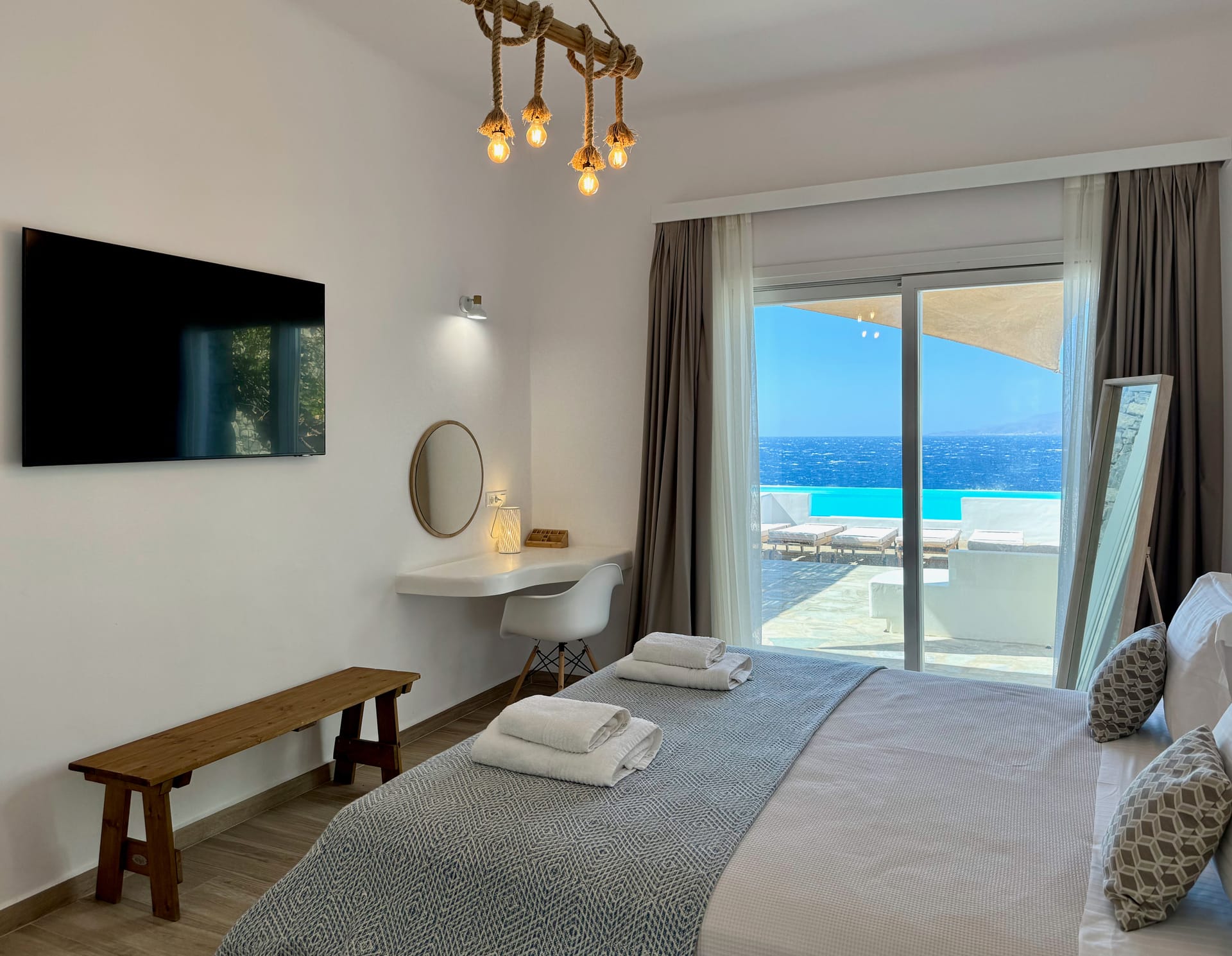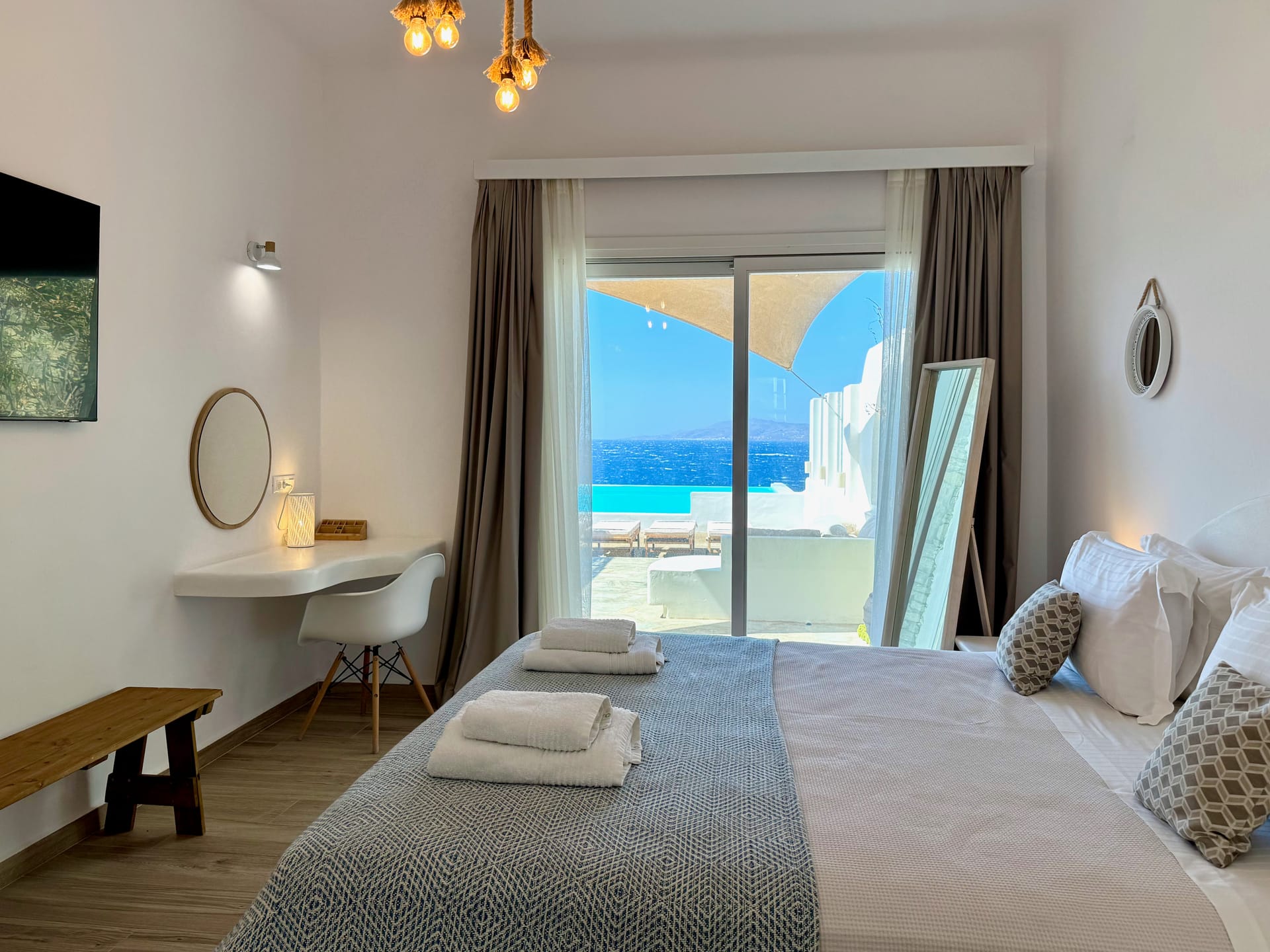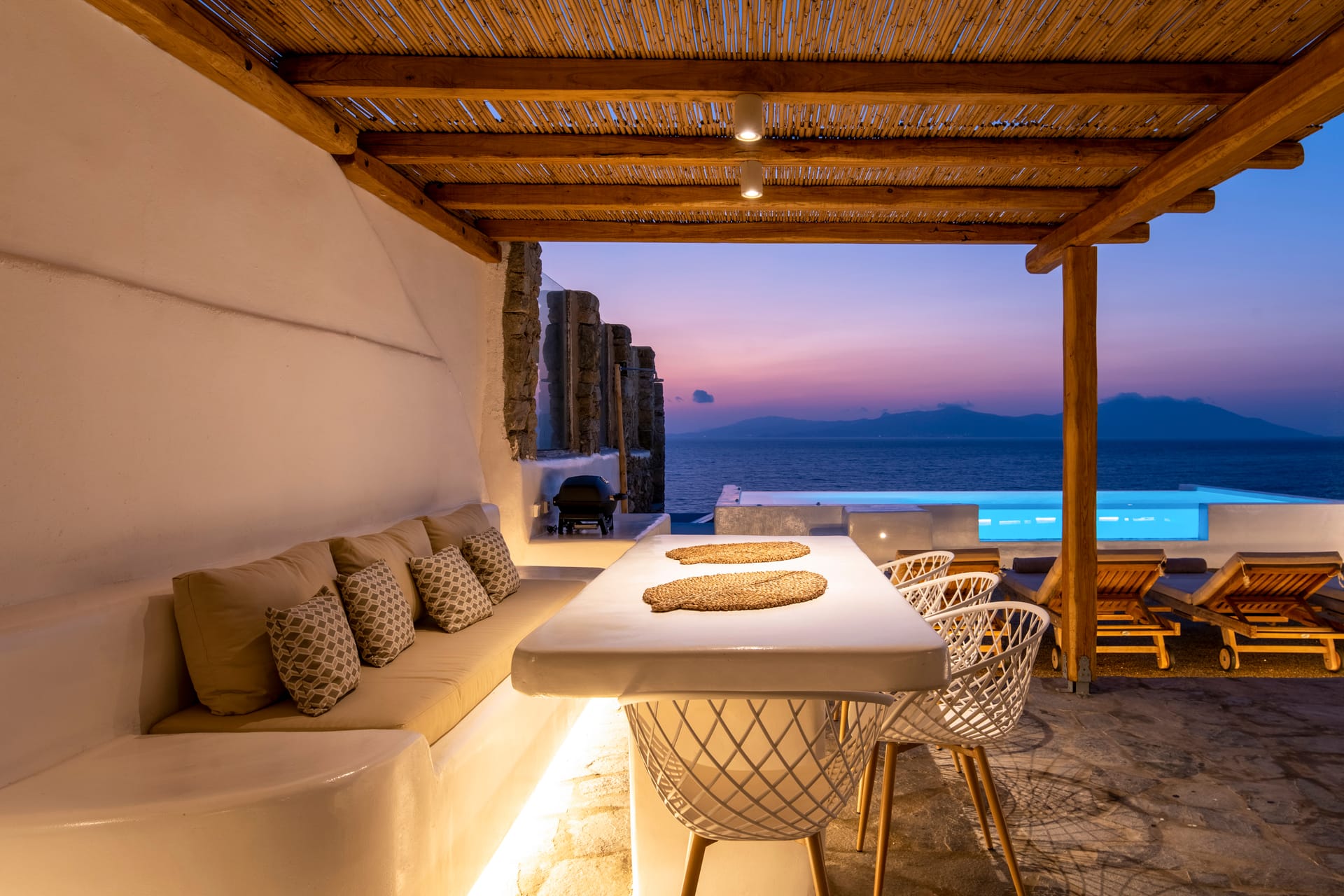 All bedrooms have direct access to the outdoor patio garden (80sqm), providing an ideal space to chill during the day and night, while enjoying the most amazing Sea & Sunset view in Mykonos.