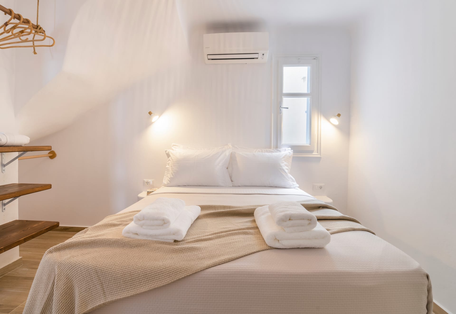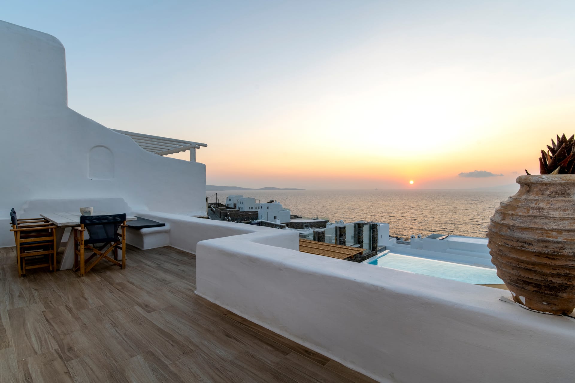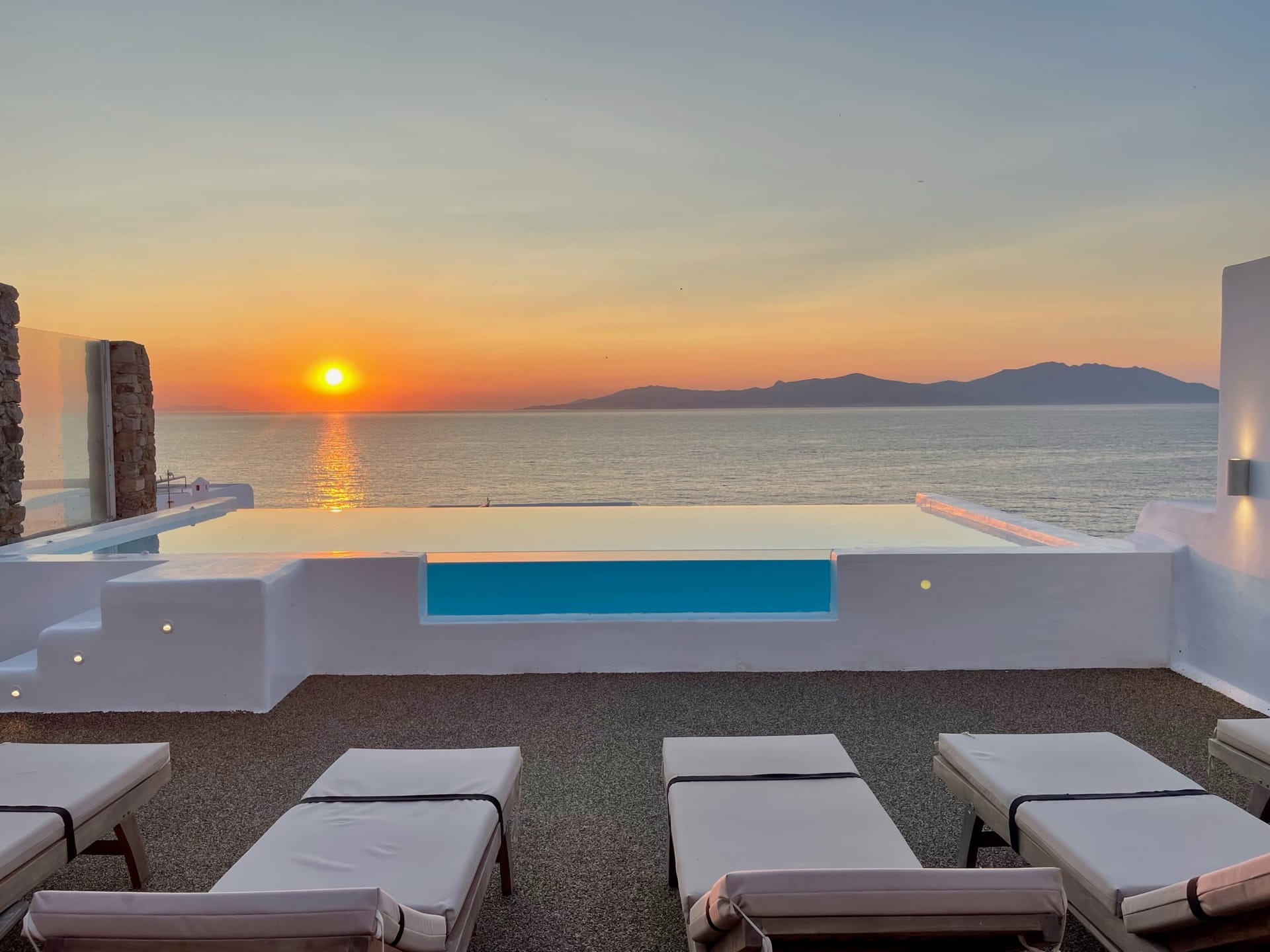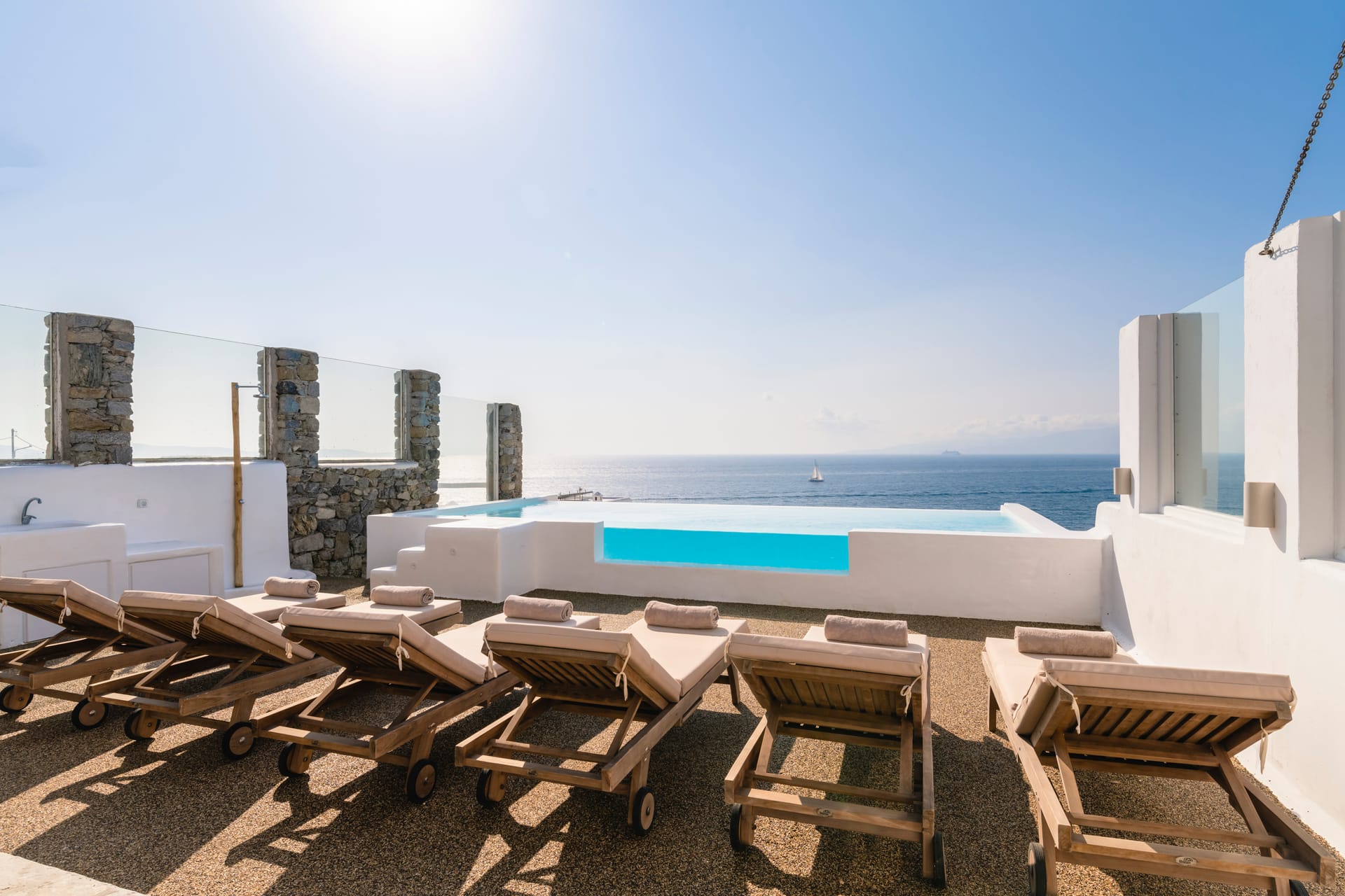 All bedrooms have direct access to the outdoor patio garden (80sqm), providing an ideal space to chill during the day and night, while enjoying the most amazing Sea & Sunset view in Mykonos.
