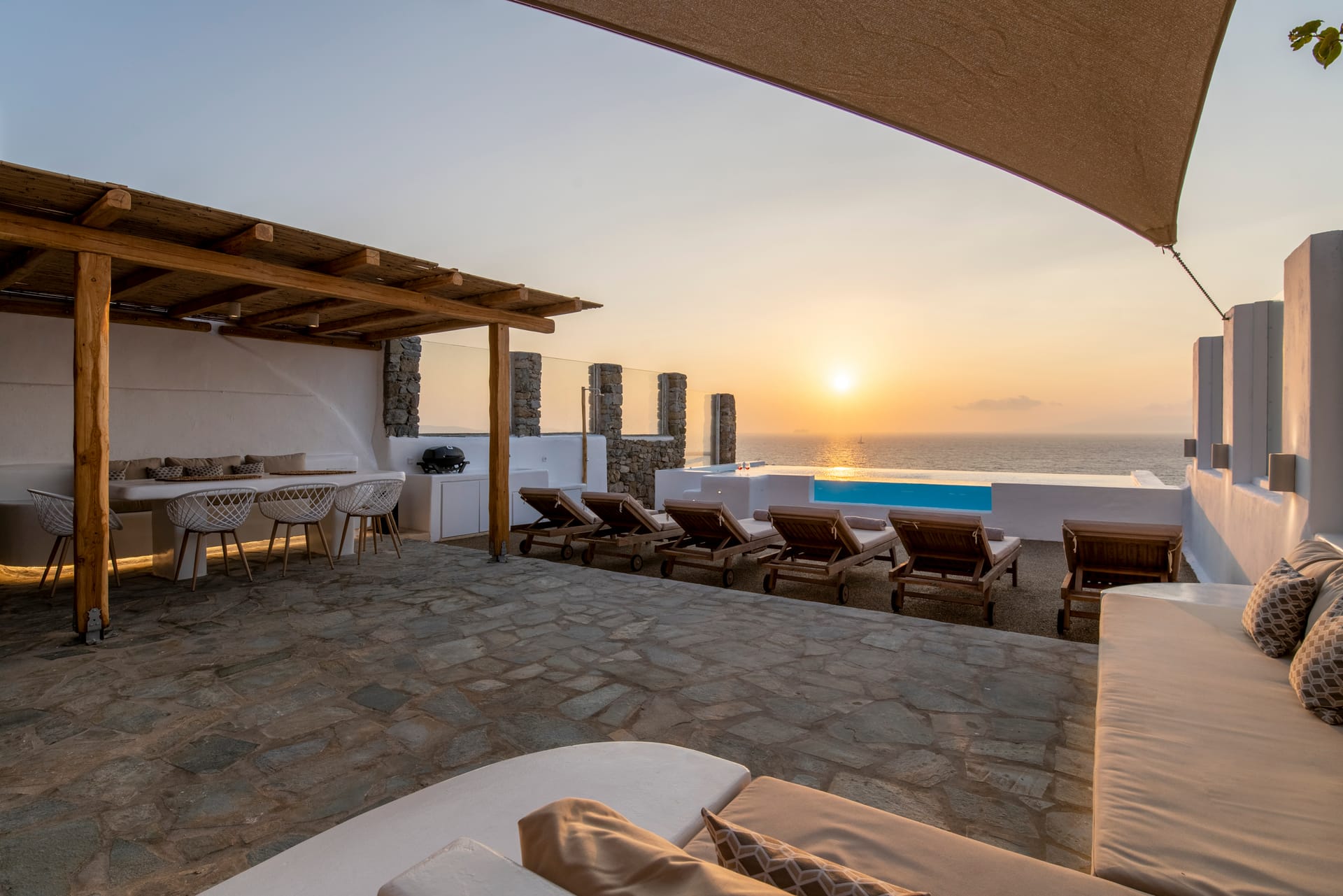 Our Villa is a 150sqm modern Cycladic house incorporating 4 bedrooms with en-suite bathrooms, fully equipped kitchen, living room, spacious balcony and outdoor lounge patio (80 sqm) with private swimming pool with an amazing Sea & Sunset view.
