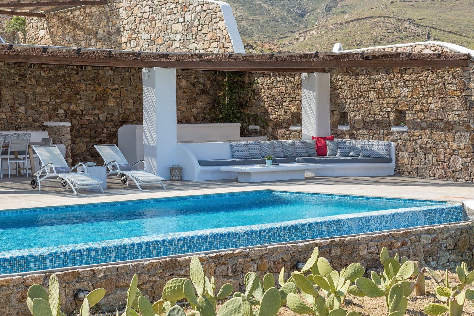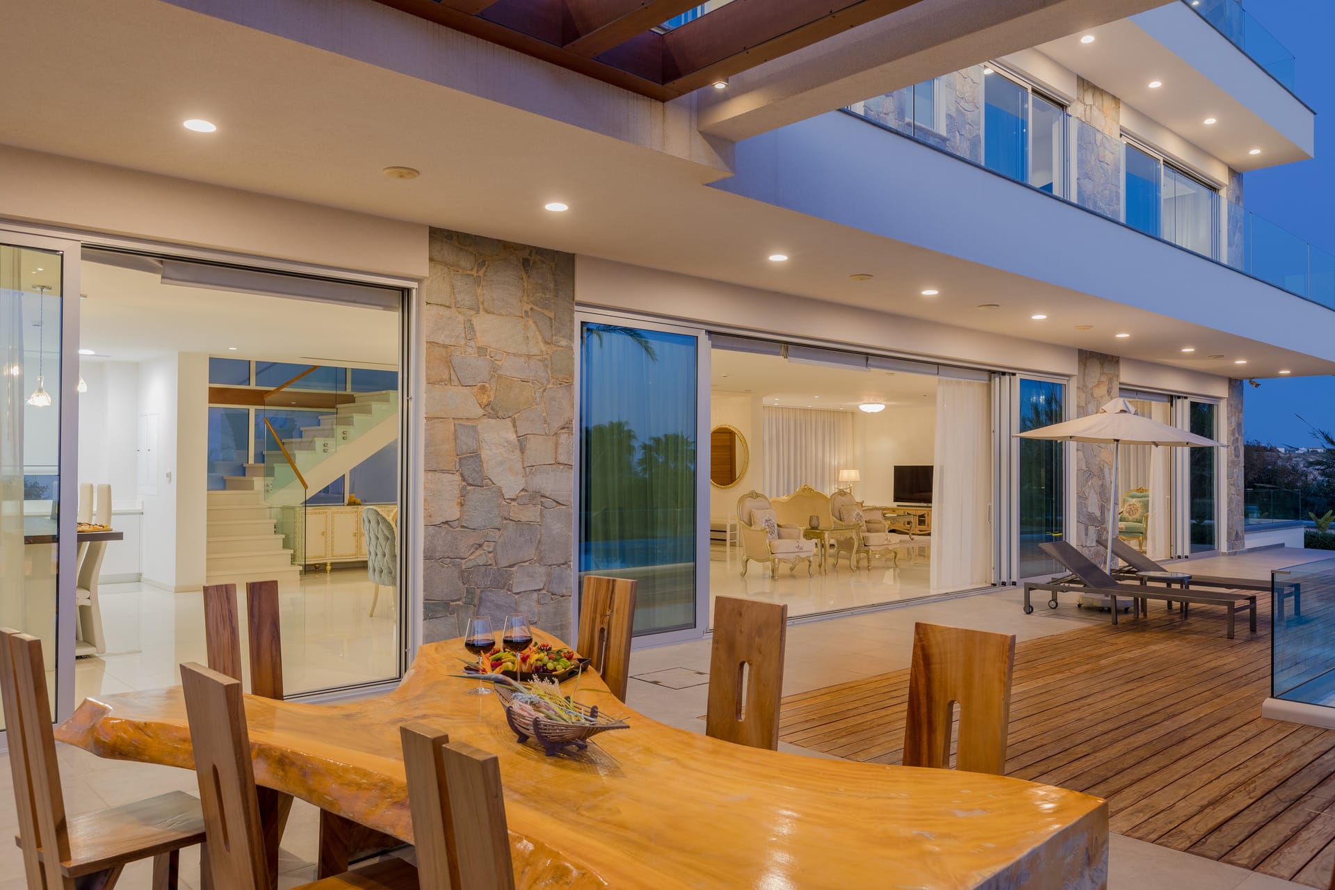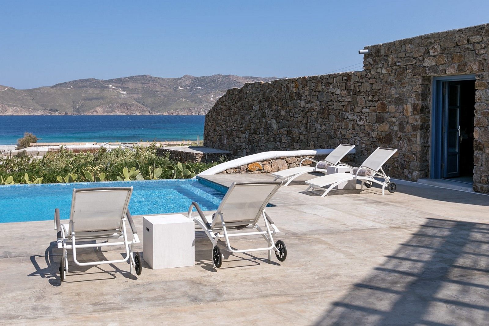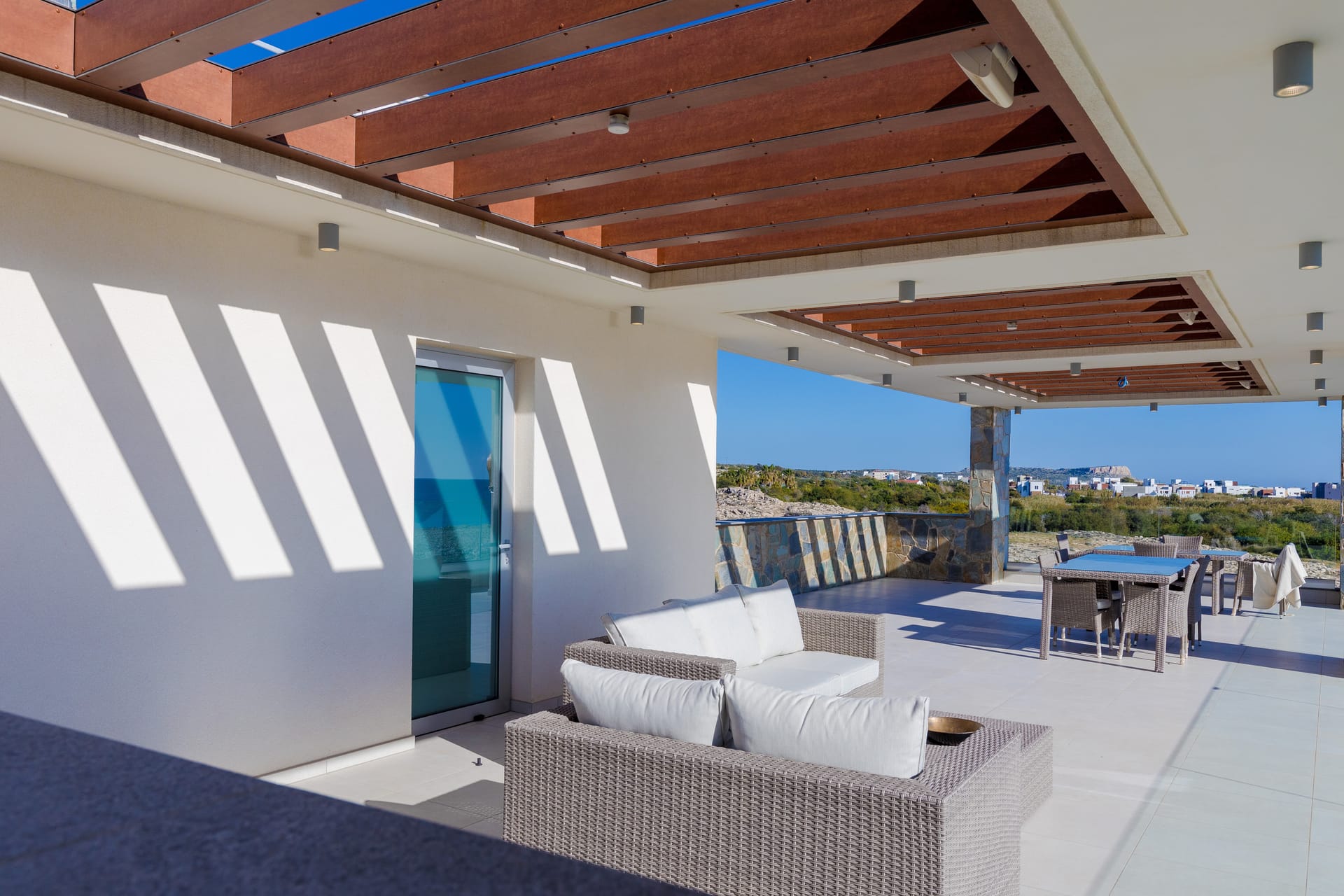 Commanding the front-row sea-facing position, this 5-bedroom modern villa guarantees you an uninterrupted 180-degrees view of the Mediterranean. A path just outside the villa will lead you directly to a sandy section of the beach.