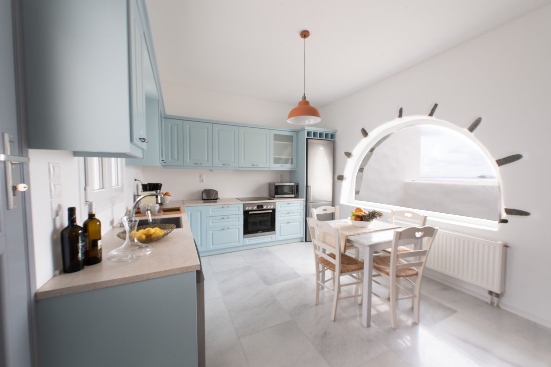 Fully-equipped kitchen with all the tools of a proper home including stove, well-sized refrigerator, mini cellar, all sorts of cooking utensils and appliances, coffee and juice machines and more. Spacious modern design with a large kitchen countertop to ensure easy and efficient cooking sessions, either alone or with friends