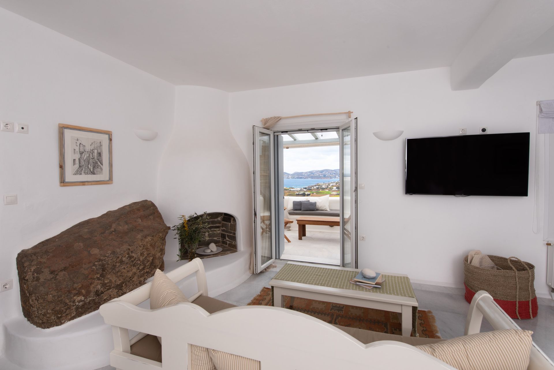 Entrance level: large living room area with open fireplace and dining room with Naxos White Marble floor. Smart TV with Netflix, YouTube and other streaming websites and large balcony with amazing sea view.