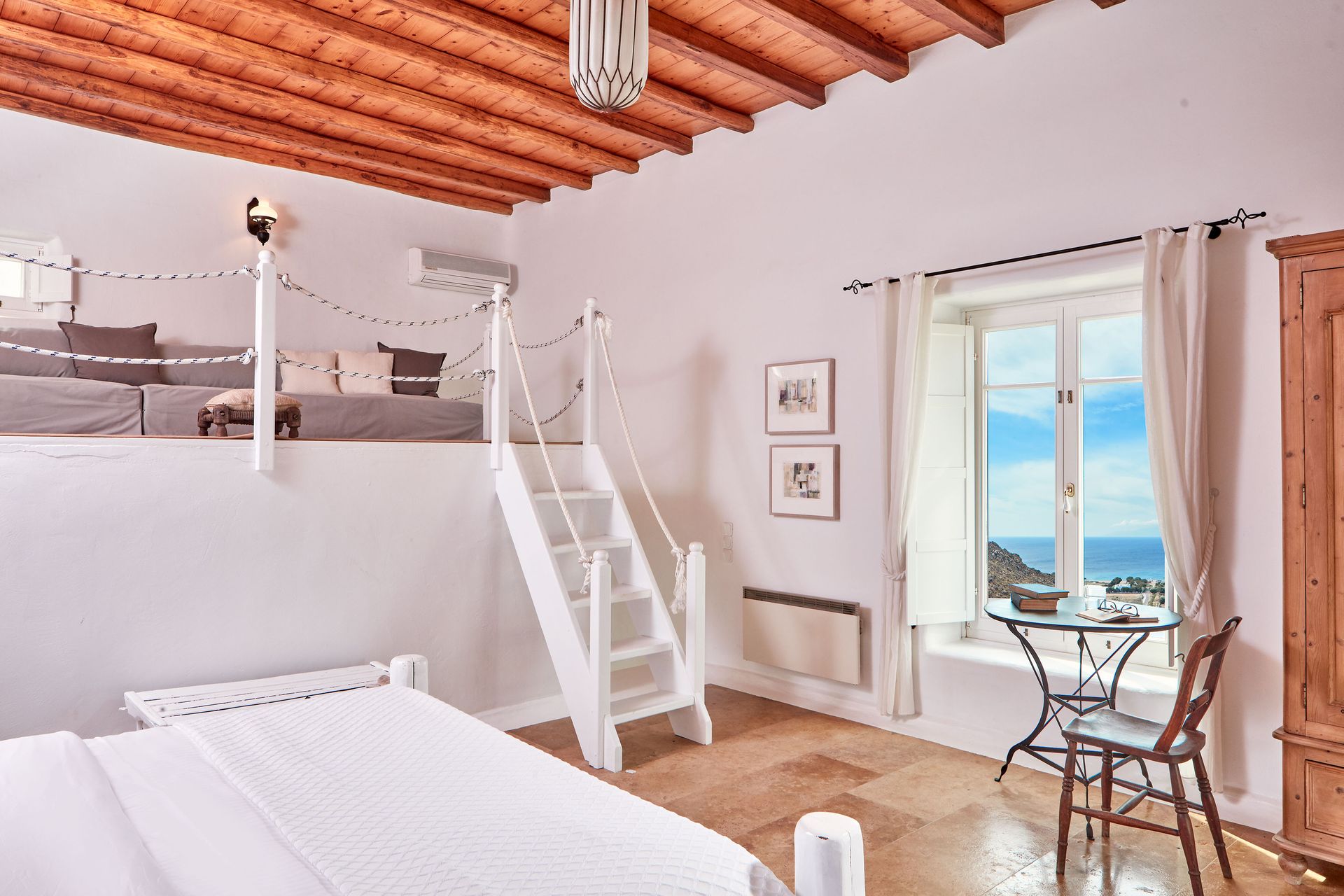 Villa Del Mar is spread out in 600 sqm and consists of 4 main houses comprise a gated private villa; The main villa, a pool house, and 2 guest houses. Entering the main villa; a large bright living room with fireplace is combined with an open plan classic elegant wooden dining room. Next, to it, a comfortable fully equipped kitchen is located. The same floor features the master bedroom with ensuite bathroom & dressing area and the second bedroom with ensuite bathroom. The upper level, or attic, features an independent Guesthouse suite with bedroom ensuite bathroom, a convenient kitchenette, comfy sitting room and provides access to a private roof terrace. Adjacent to the infinity pool is the Pool Guest House, which is spread out across two levels and has breathtaking views of the cliff, beach and Naxos Island. The ground floor features the main bedroom with ensuite bathroom, a living room, and open plan kitchen. The lower level has a separate guest bedroom with ensuite bathroom, an independent entrance and a private courtyard. The second Guest house contains a double bedroom with bathroom, a living room with dine area and kitchen.