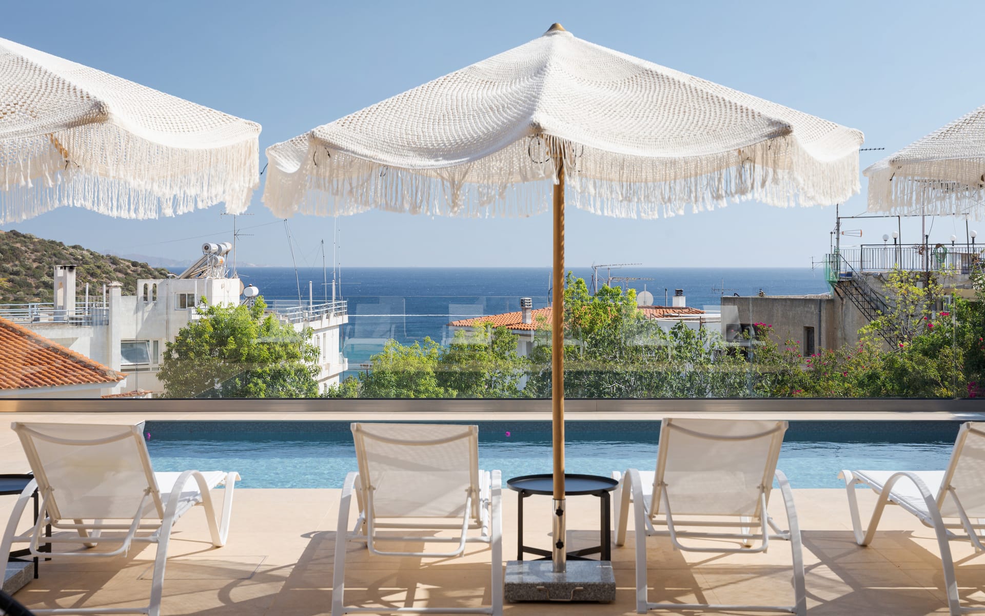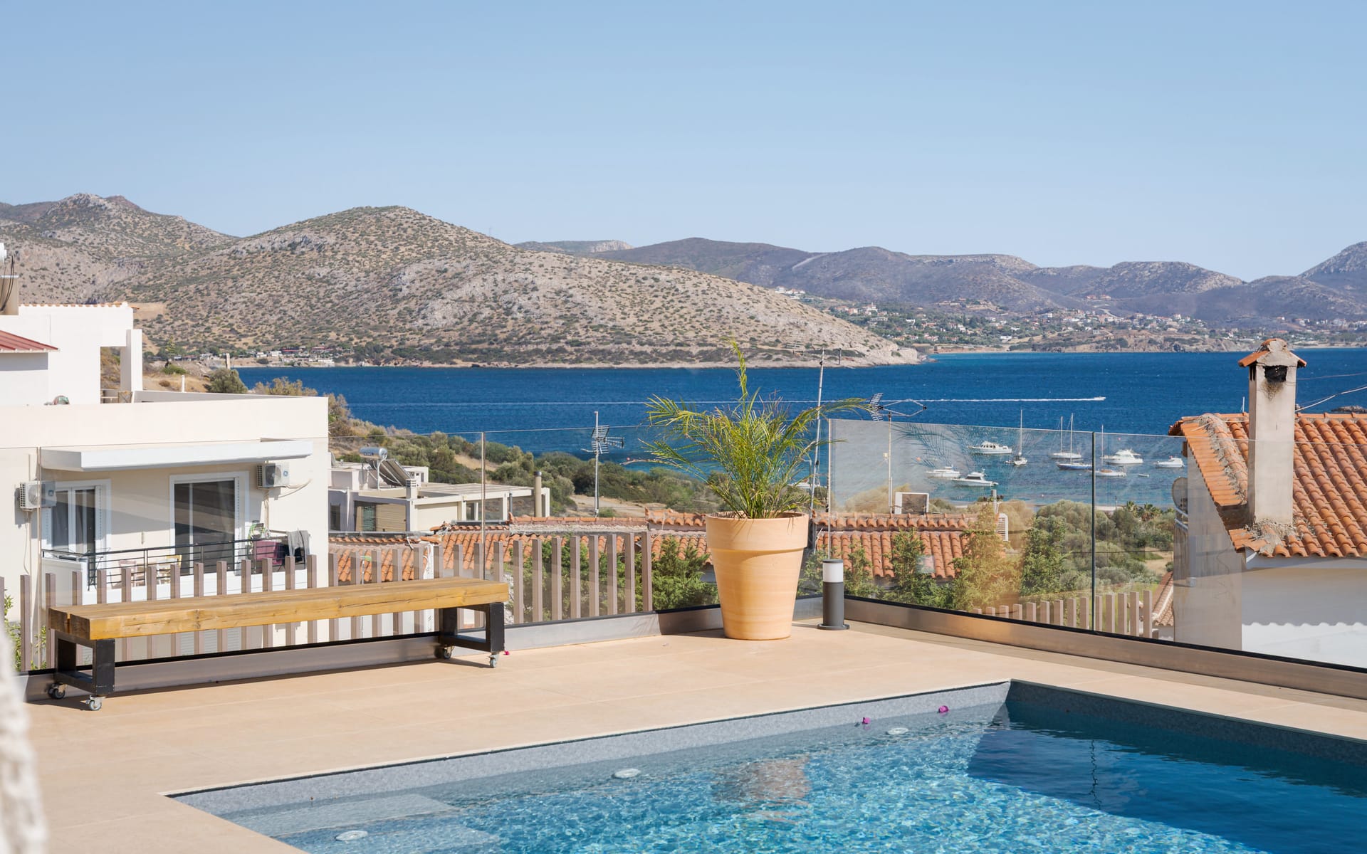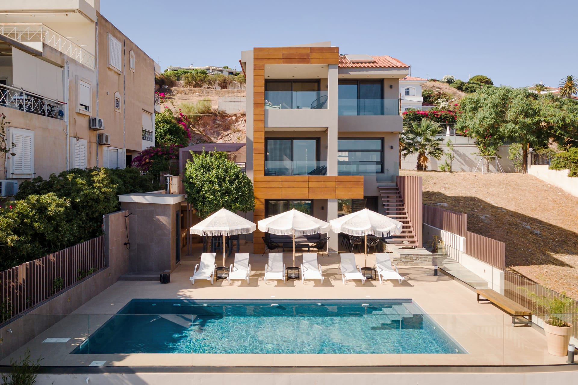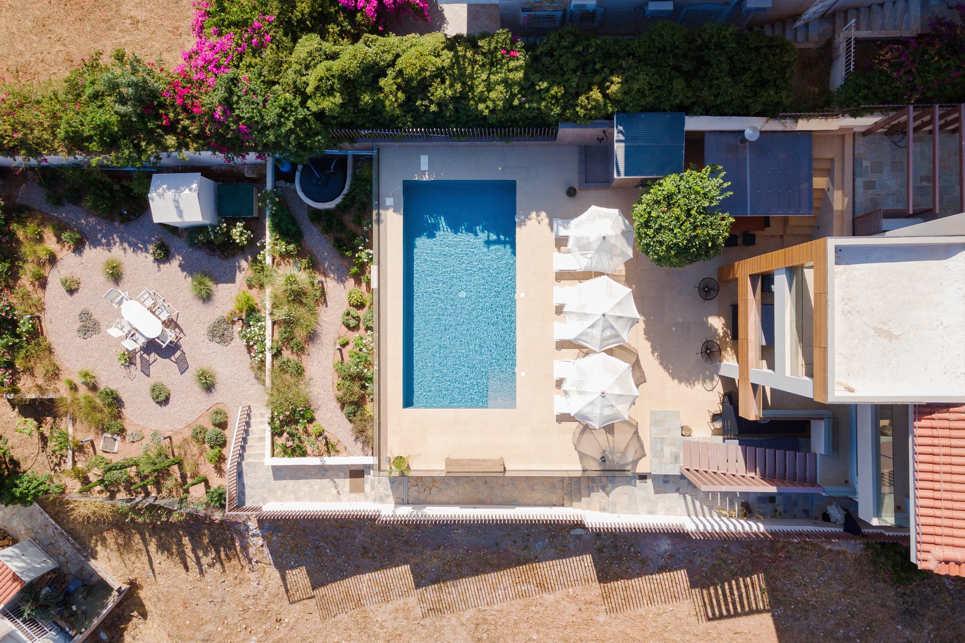 The villa is formed in 3 levels, the lower level consists of a living room, 3 bedrooms, 3 bathrooms, and has direct access to the garden. On the ground floor (pool level) there is a fully equipped with modern appliances open plan kitchen, dining area, guests’ WC, living room and outdoor, pergola covered dining area. The master bedroom is located on the upper level, with amazing sea view and access to an outdoor sitting area. Villa ‘’Mar Azul’’ also has 1 independent guest room and 1 guest house on the lower level, both having direct access to the garden.