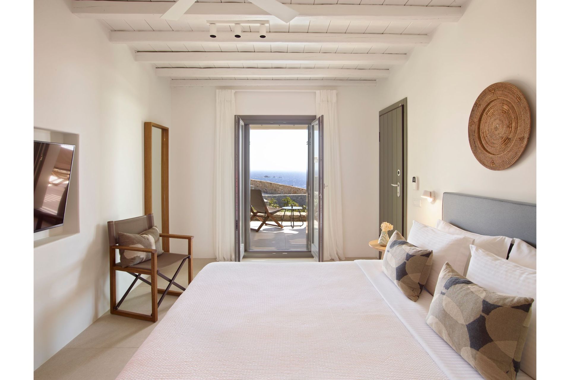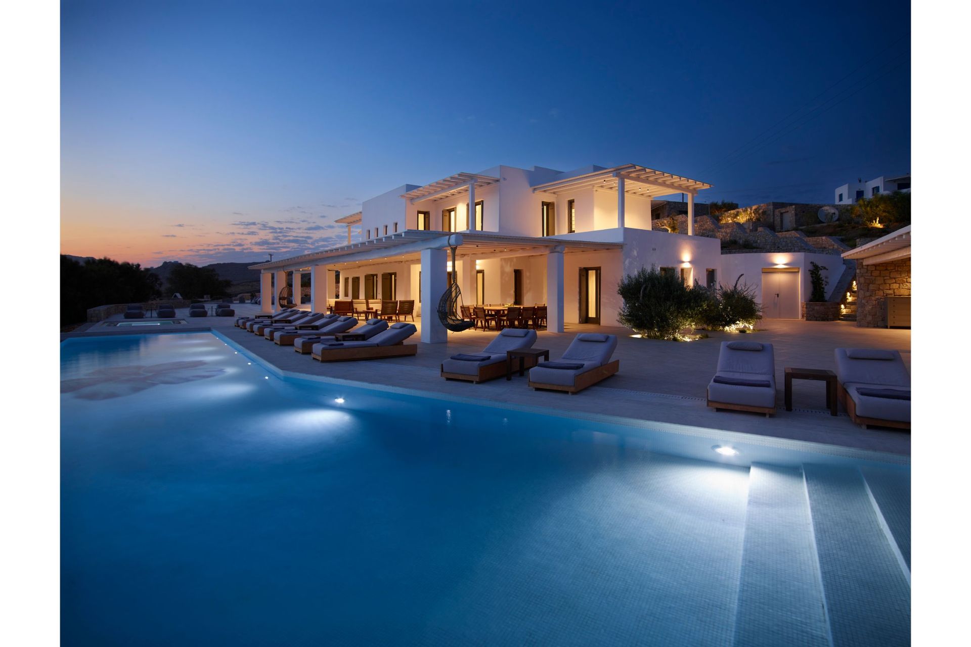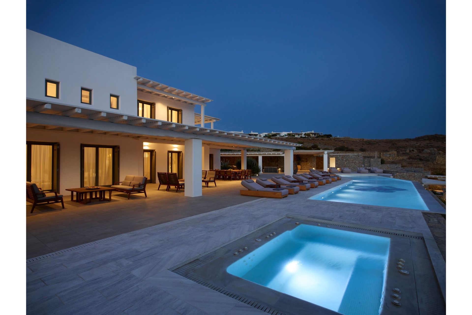 The architecture is traditional, whitewashed Mykonian infused with contemporary comforts and modern design. Villa Vitae is spread in three levels. The entrance level features 4 double bedrooms with en suite bathrooms and access to balconies, a guest ensuite bedroom with private entrance and access to the pool area, a very large open plan living room and dining area, a fully equipped state of the art kitchen and a safety room equipped with cameras alarms and more. The upper level offers 4 master ensuite bedrooms with sea & pool view and a guest room with its own bathroom, private entrance and access to the pool area. The lower level offers 6 guest houses with independent entrance, kitchenette and sea view & 2 more twin ensuite bedrooms suitable for personnel. This level also features a playroom equipped with a projector, a massage room with a professional massage table, a Hammam & a Cold room.
