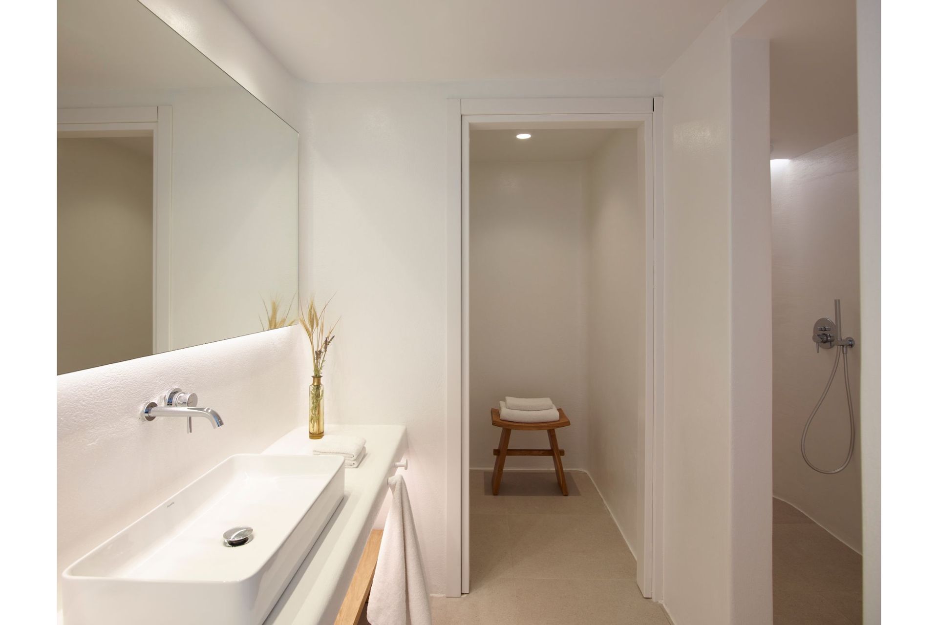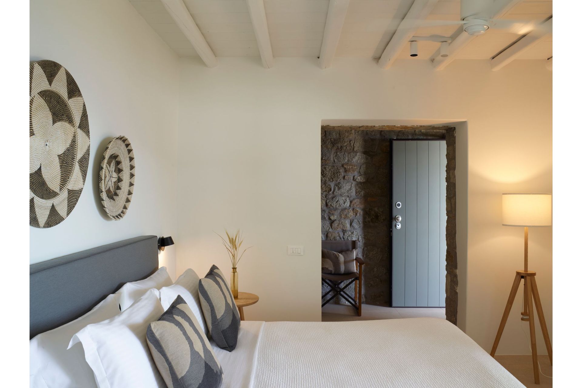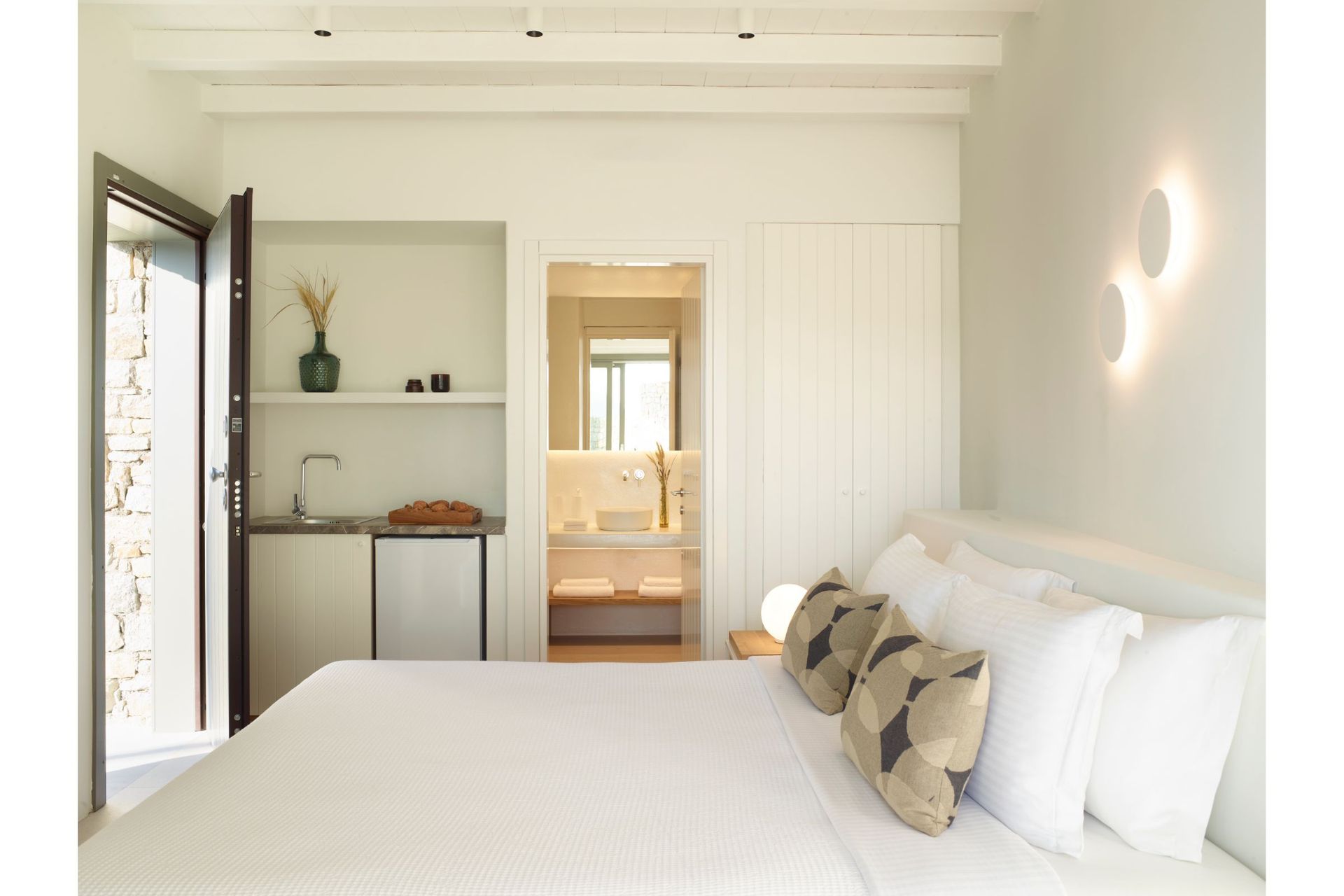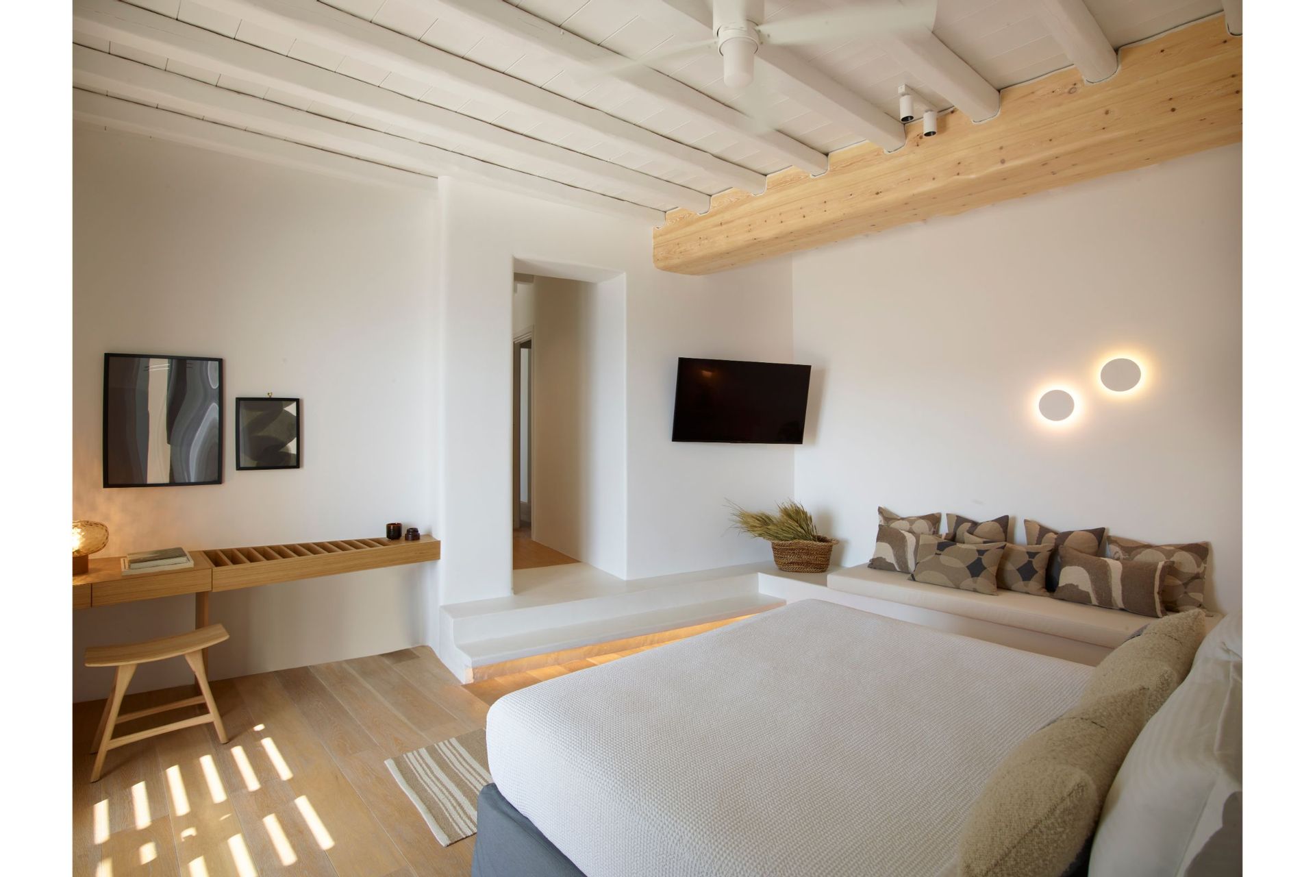 The architecture is traditional, whitewashed Mykonian infused with contemporary comforts and modern design. Villa Vitae is spread in three levels. The entrance level features 4 double bedrooms with en suite bathrooms and access to balconies, a guest ensuite bedroom with private entrance and access to the pool area, a very large open plan living room and dining area, a fully equipped state of the art kitchen and a safety room equipped with cameras alarms and more. The upper level offers 4 master ensuite bedrooms with sea & pool view and a guest room with its own bathroom, private entrance and access to the pool area. The lower level offers 6 guest houses with independent entrance, kitchenette and sea view & 2 more twin ensuite bedrooms suitable for personnel. This level also features a playroom equipped with a projector, a massage room with a professional massage table, a Hammam & a Cold room.