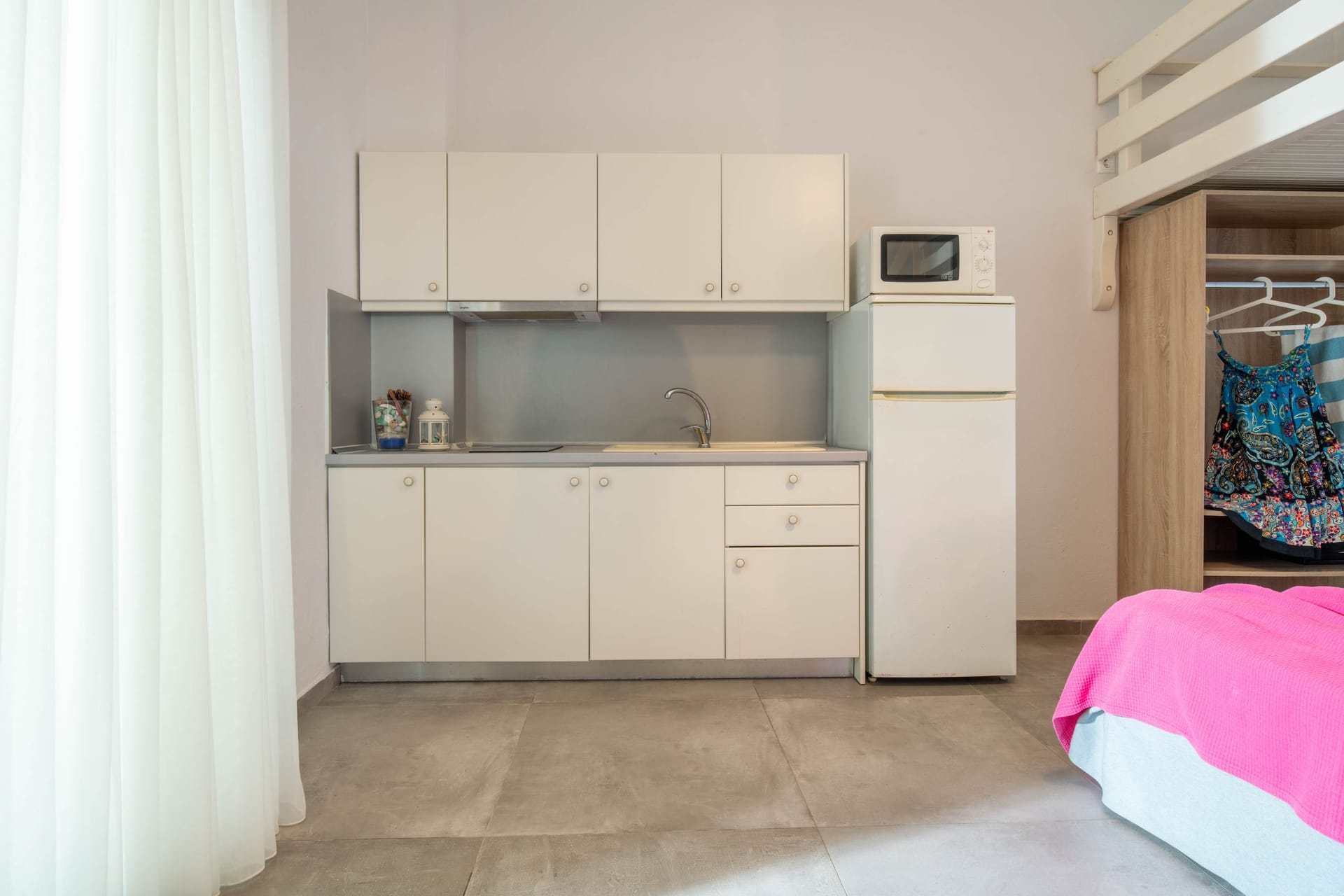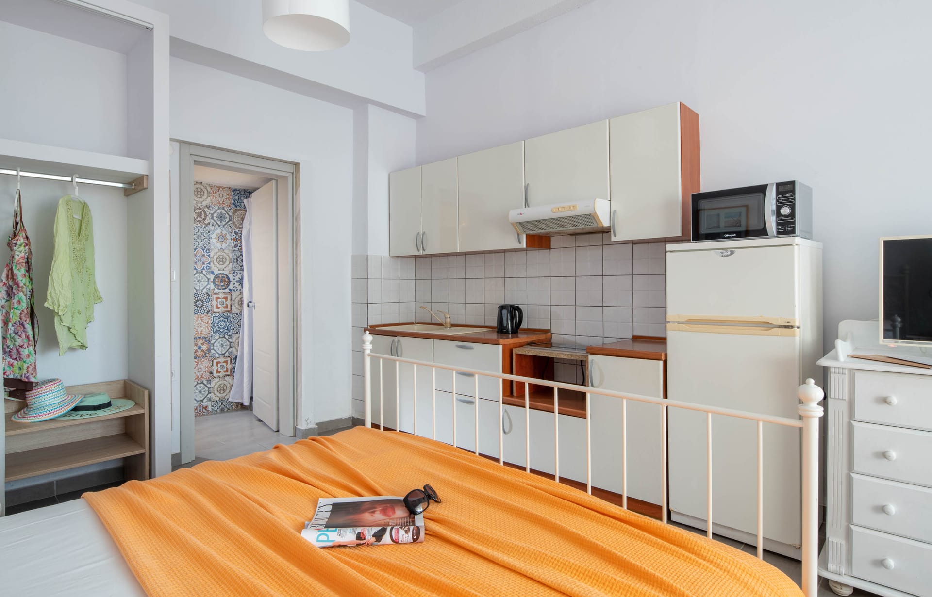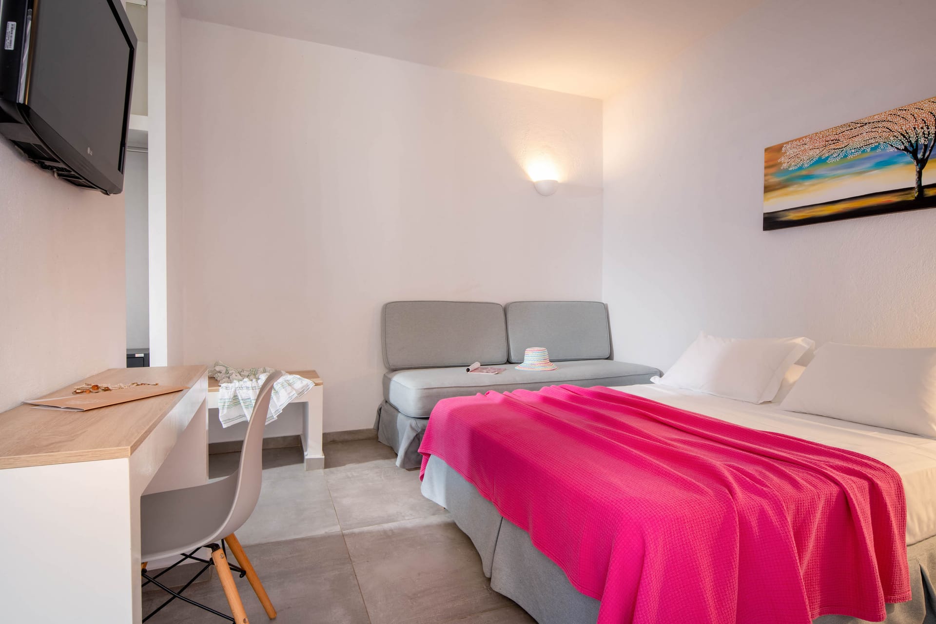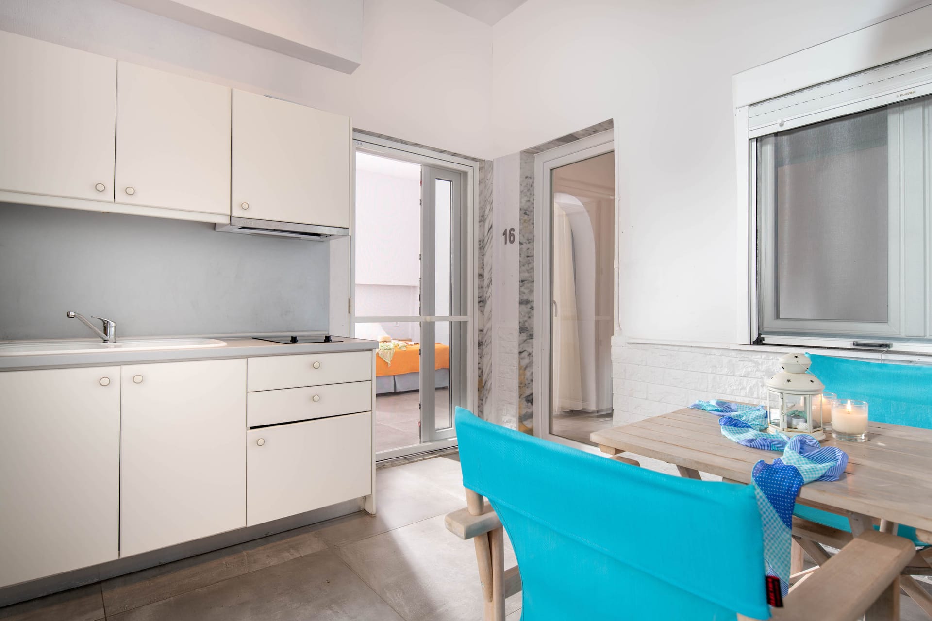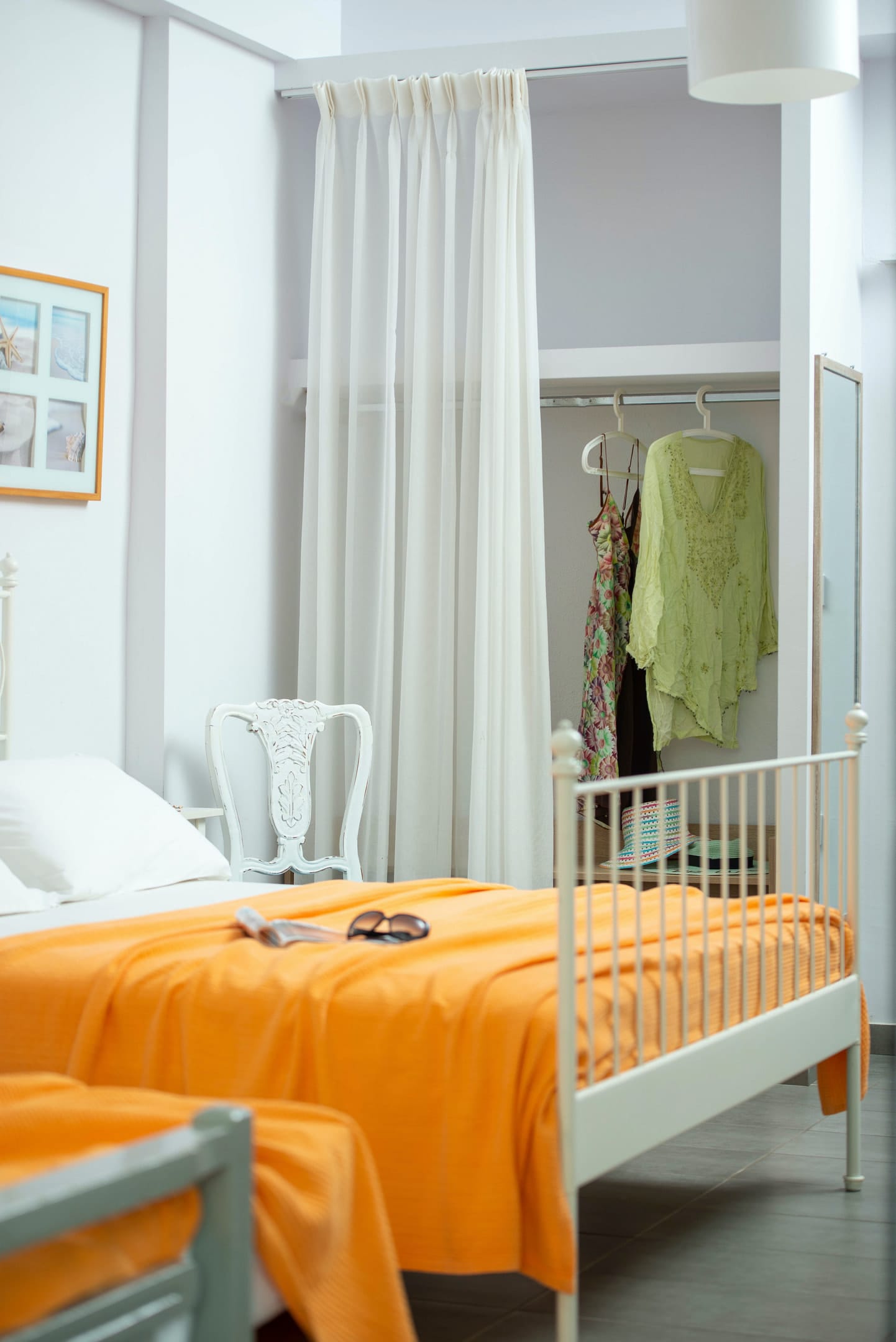 Family rooms with a surface of 21-22 m² have 1 double bed and 2 single-ones, featuring a fully equipped kitchen. They are located on the 1st or 2nd floor and can host 2 adults or a family (2 adults and 2 children). The family room has a big wardrobe, bathroom with shower, and private balcony with tents and sea or street view.