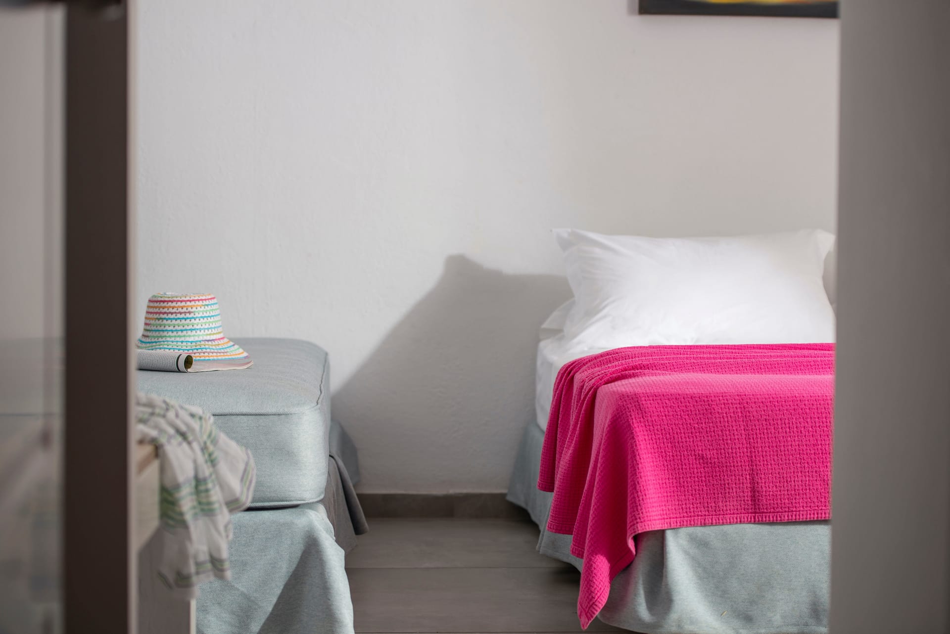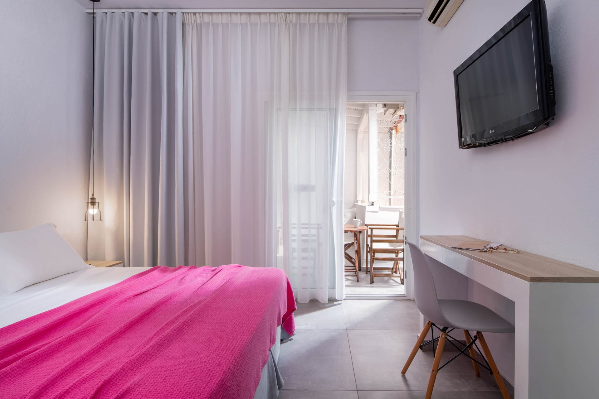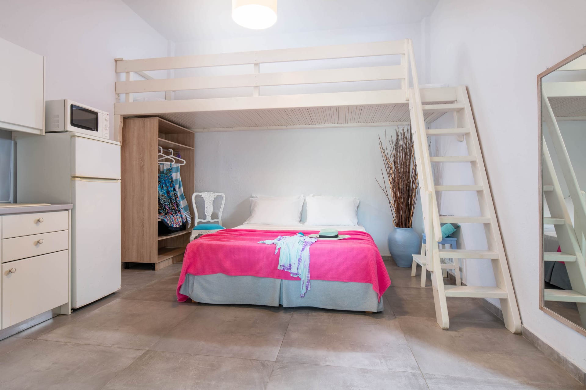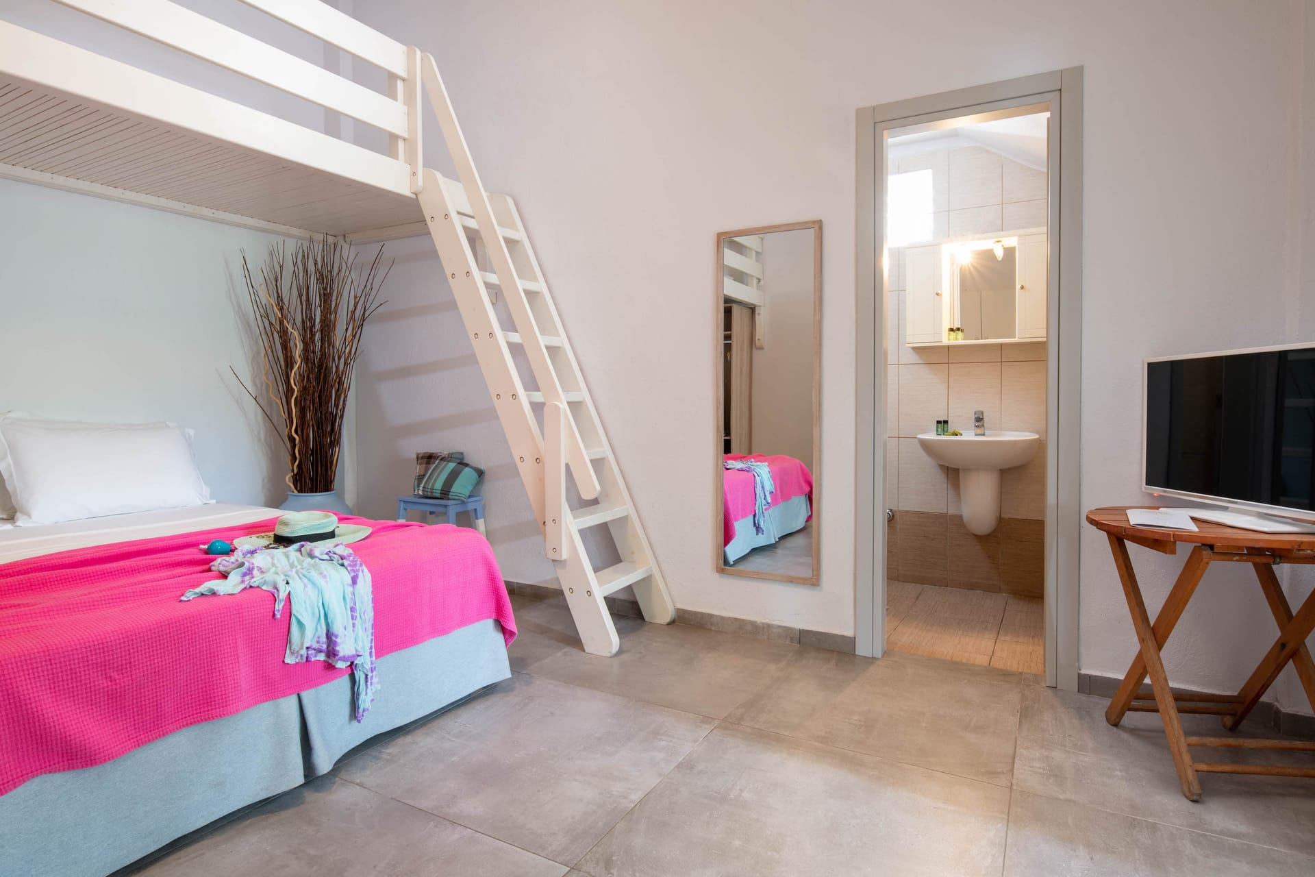 Family rooms with a surface of 21-22 m² have 1 double bed and 2 single-ones, featuring a fully equipped kitchen. They are located on the 1st or 2nd floor and can host 2 adults or a family (2 adults and 2 children). The family room has a big wardrobe, bathroom with shower, and private balcony with tents and sea or street view.