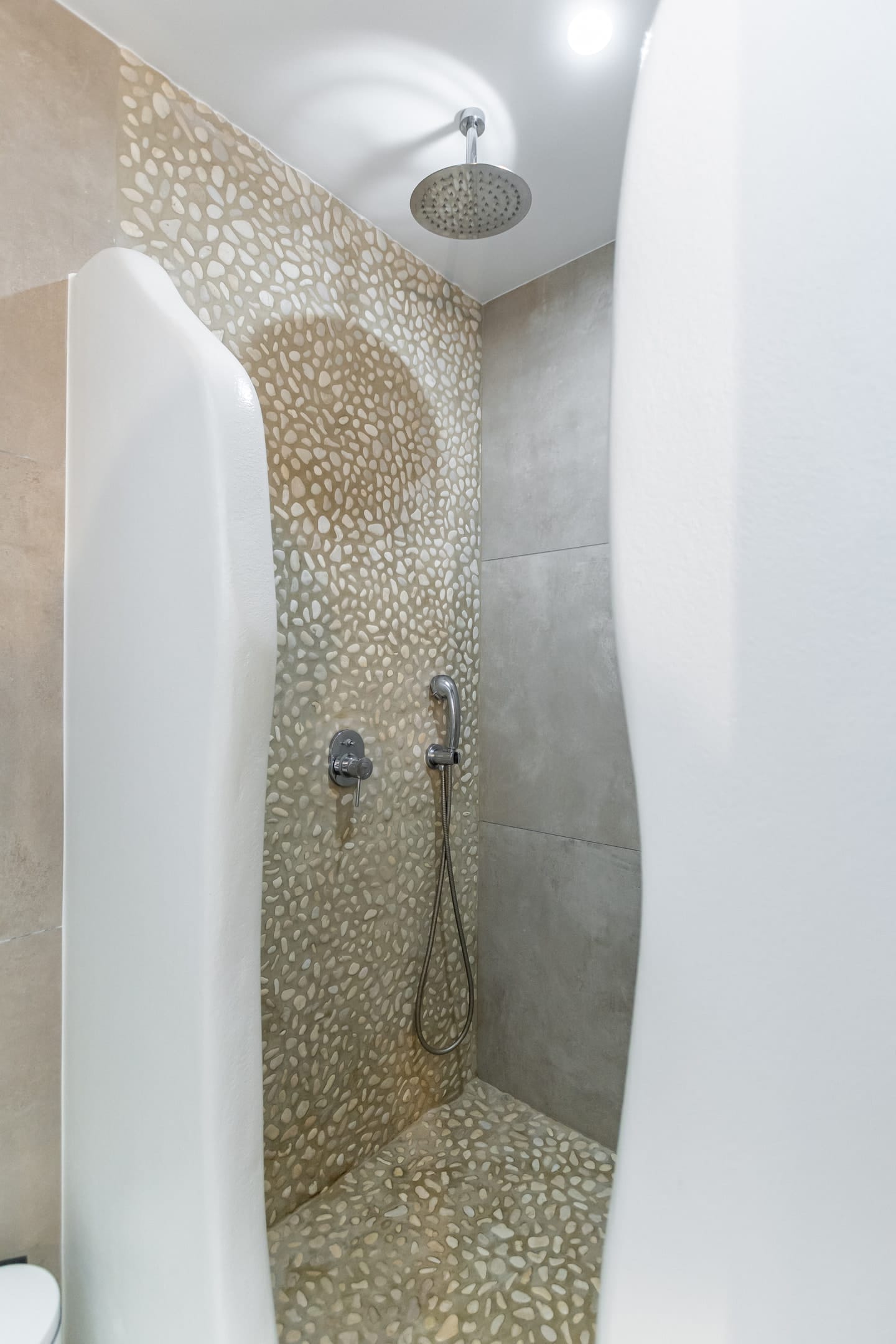 Guests can unwind on the private terrace with its panoramic sea views, enjoying moments of peace and connection with the Aegean landscape. The suite also includes a stylish bathroom with a walk-in shower, as well as practical amenities.