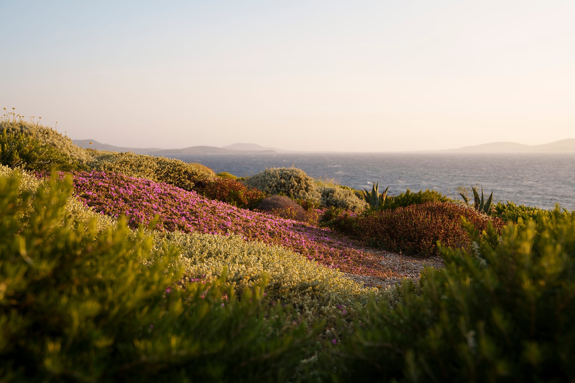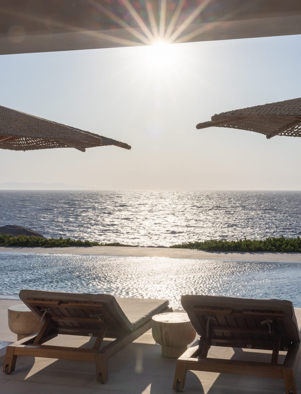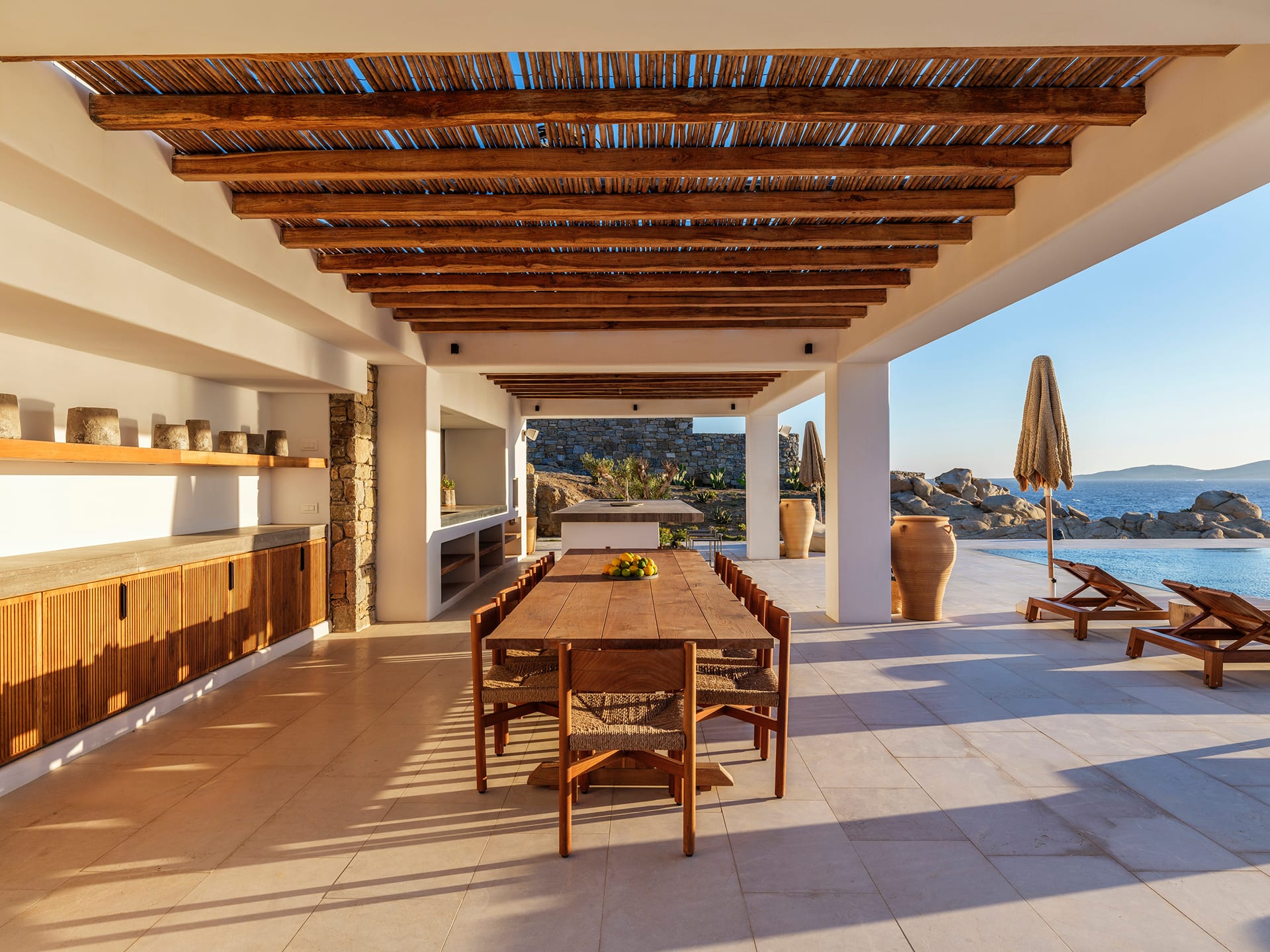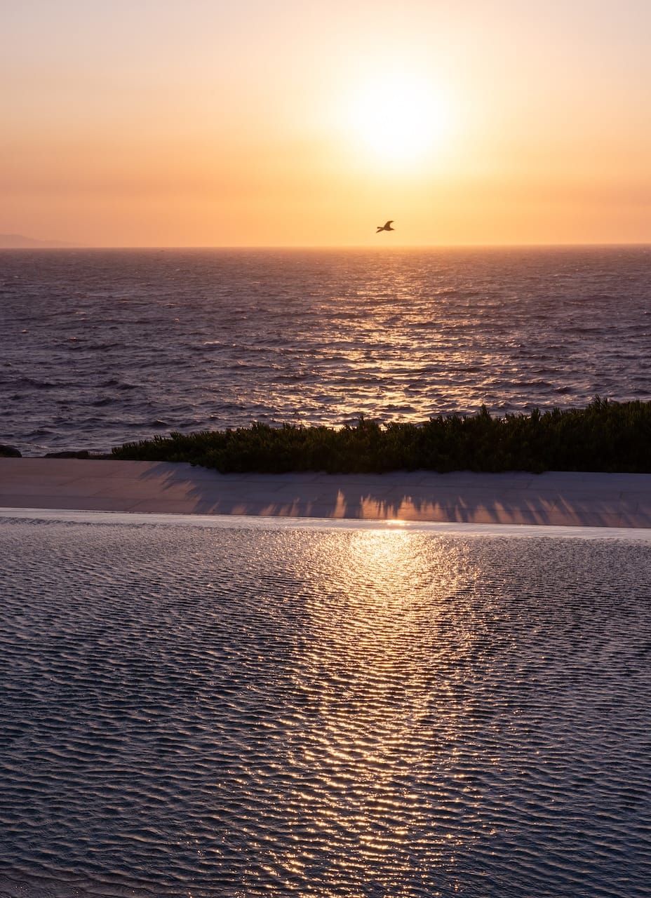 As the sun sets, the villa transforms into a sanctuary of color and calm, perfect for poolside lounging or alfresco dining while taking in breathtaking Aegean views.