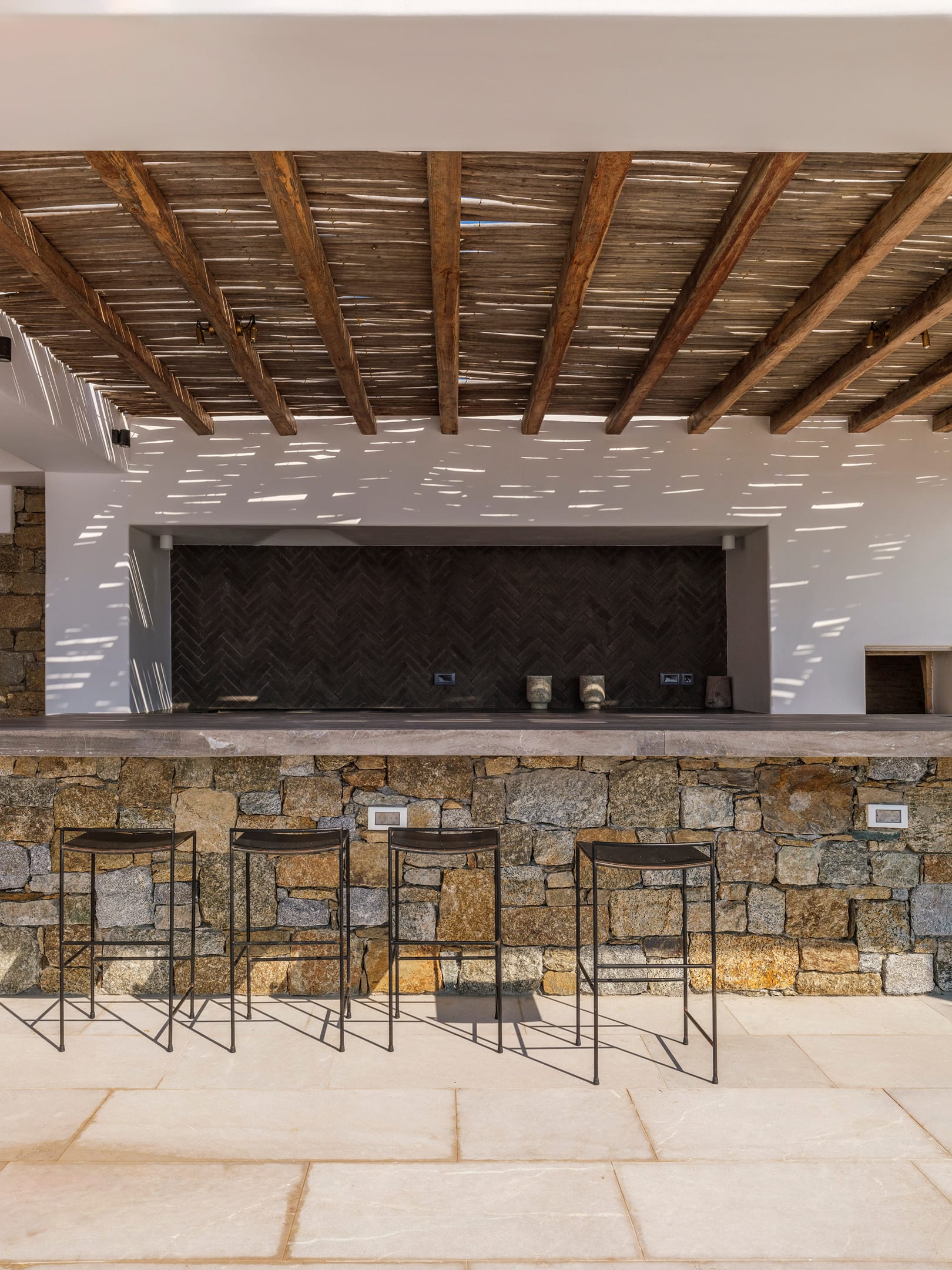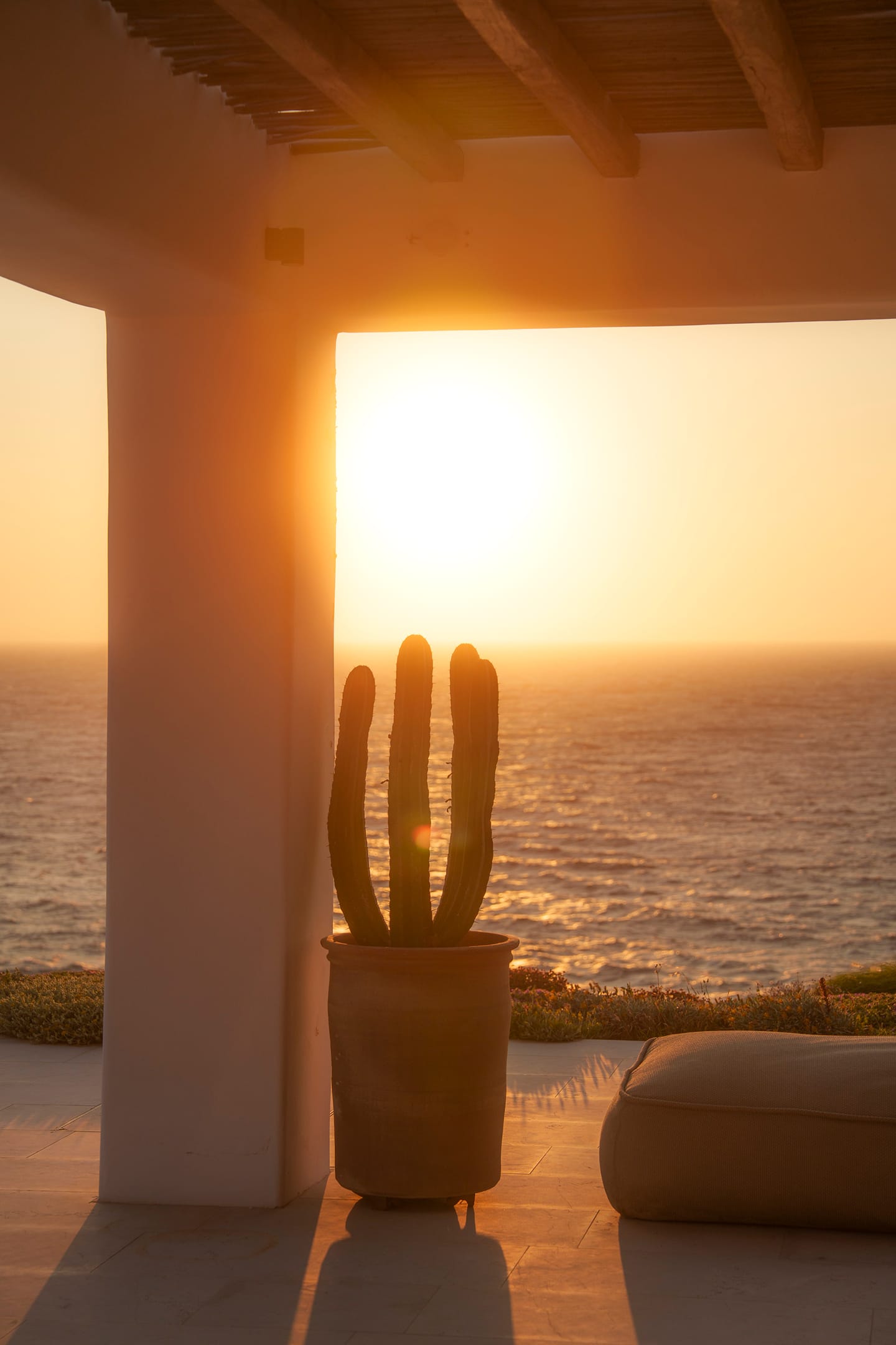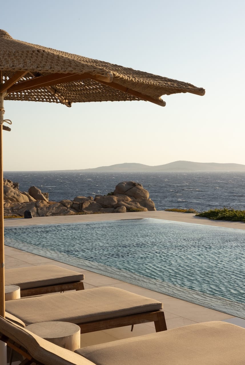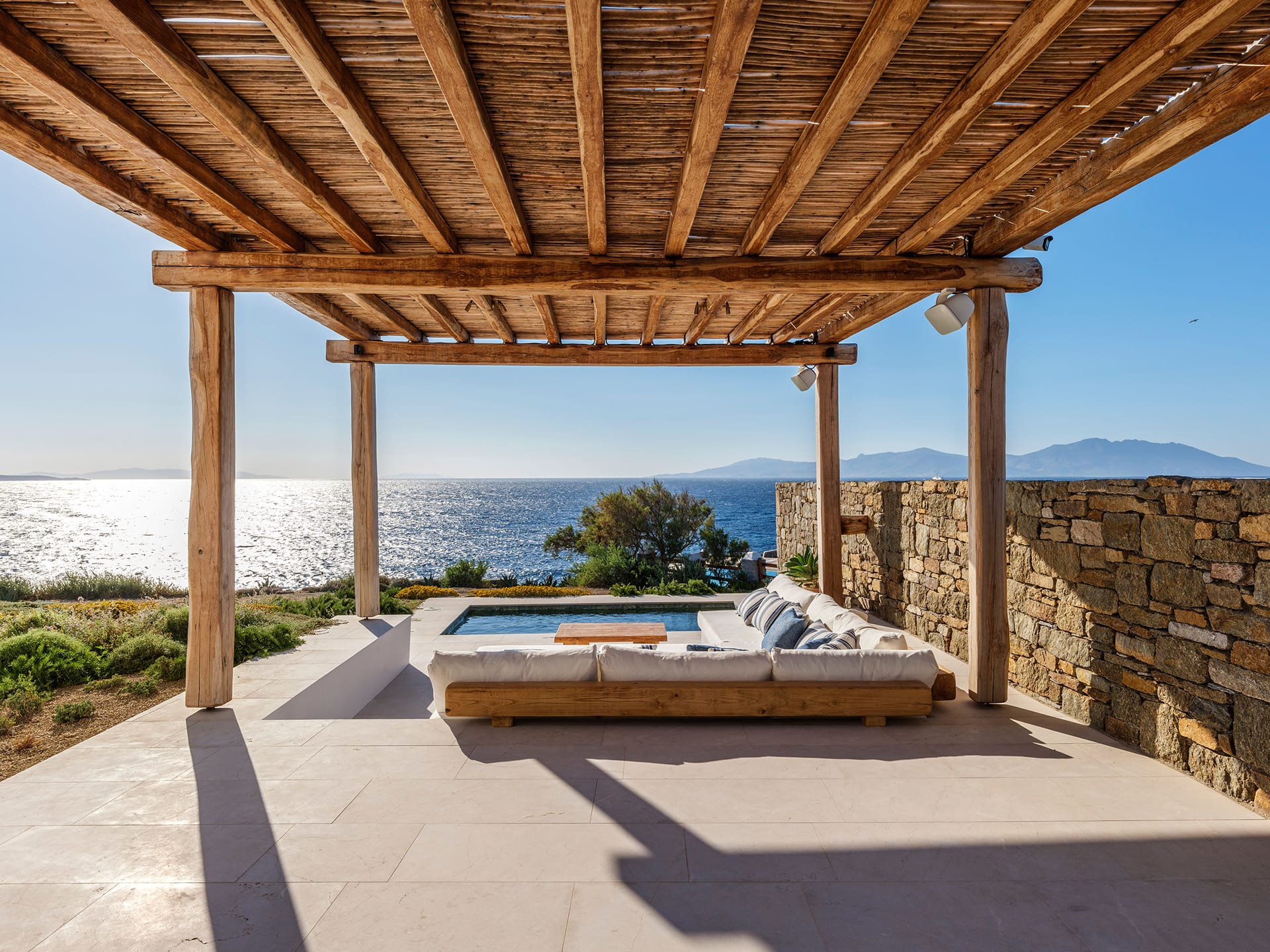 Perched on a southwest-facing cliff in Kanalia, Villa Amarosa is a 2023 architectural gem designed by K Studio, offering panoramic views of Delos, Renia, and Tinos. With its own small private beach and a stunning heated marble pool, the villa delivers exceptional exclusivity and comfort.