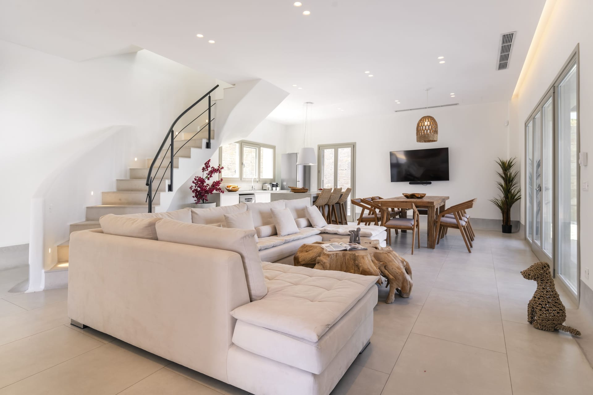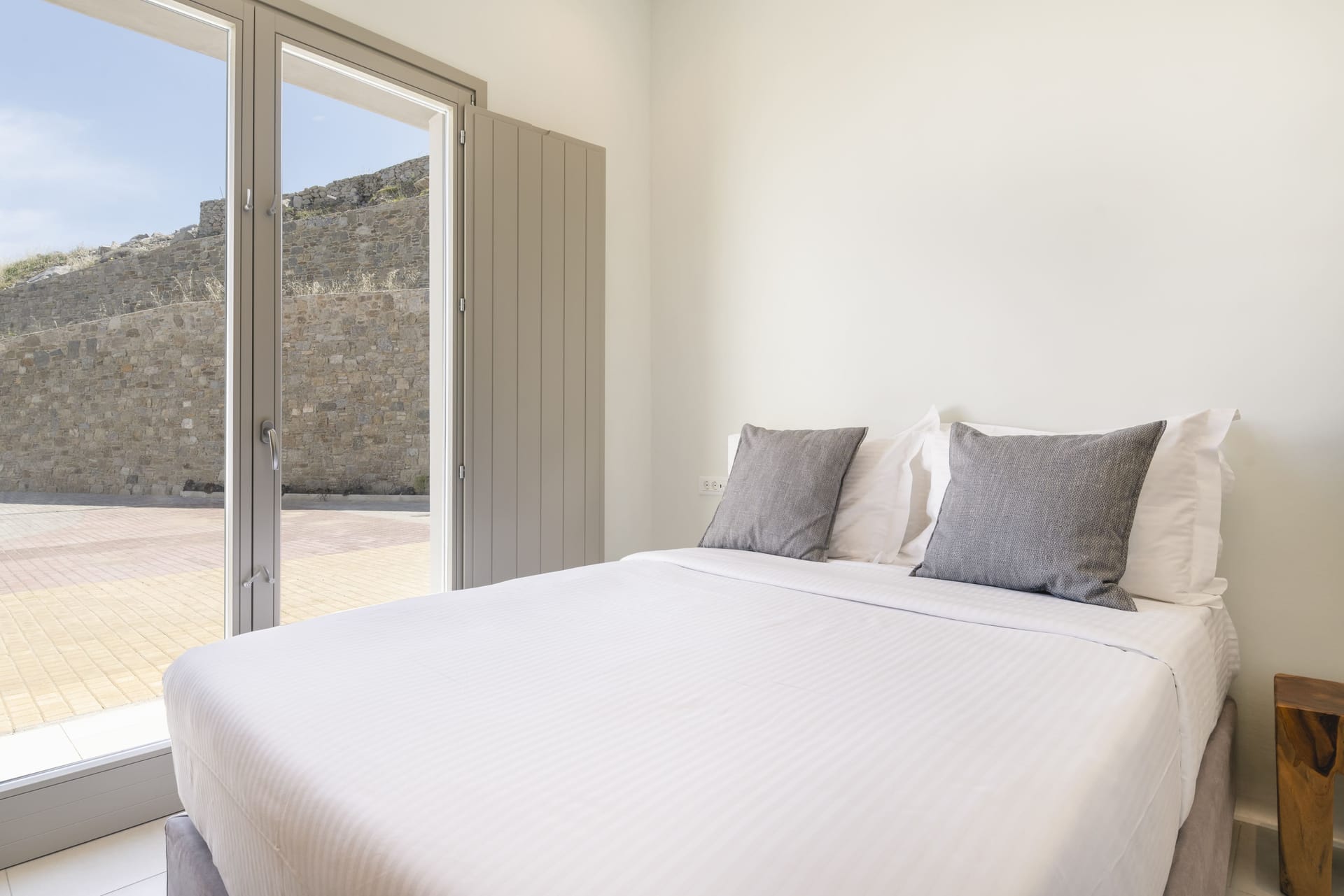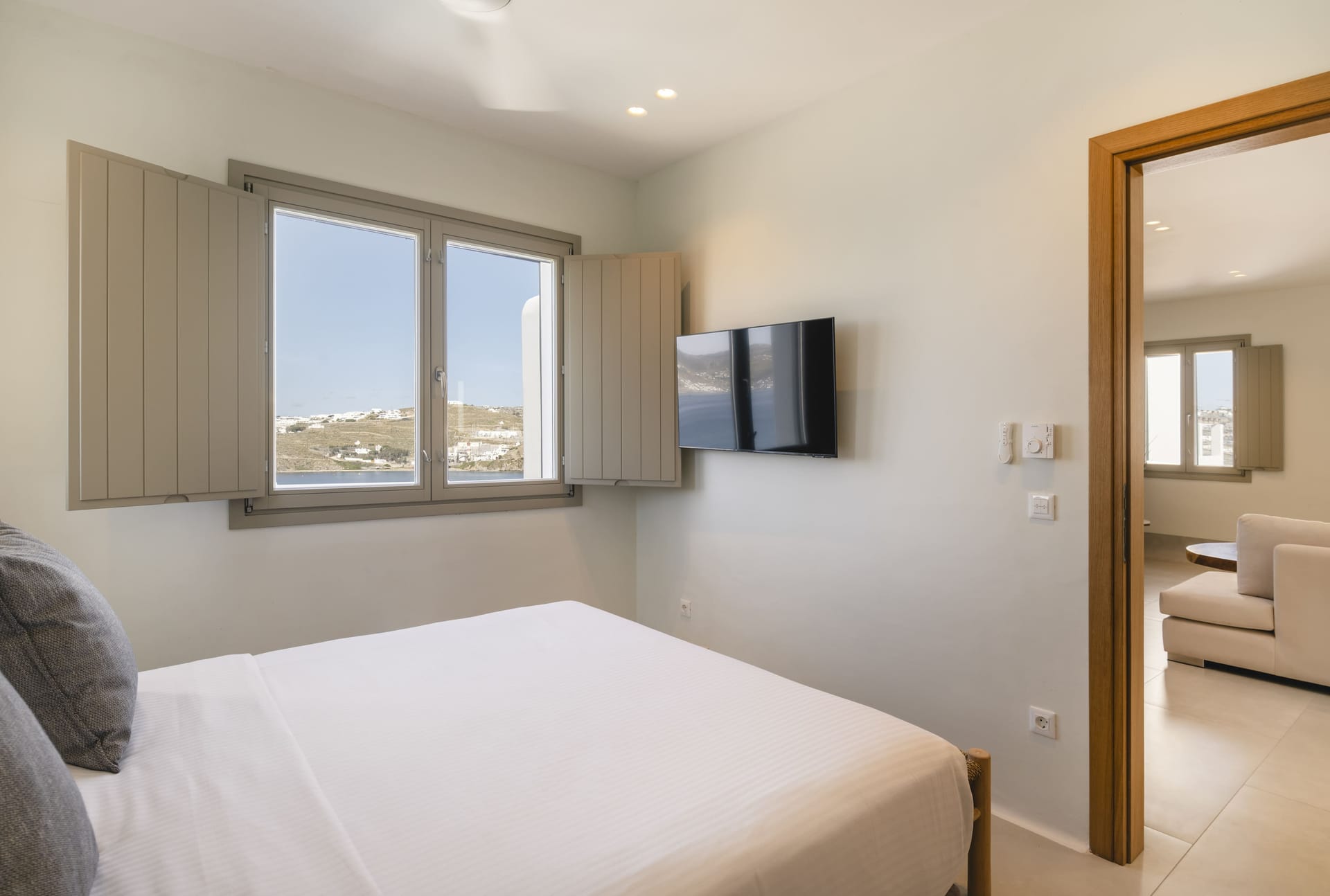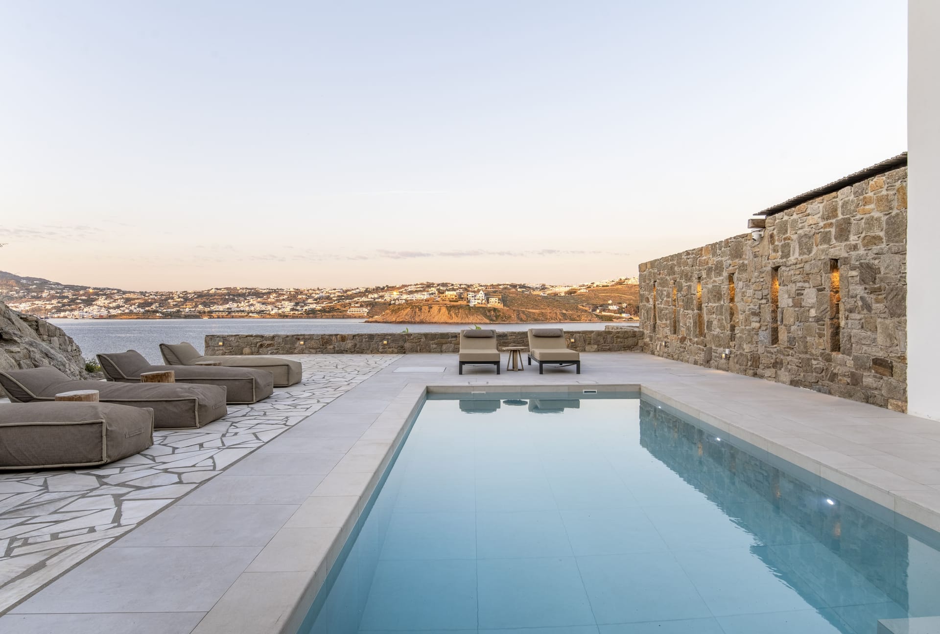 Designed in a modern Mykonian style, Villa Myko Three showcases clean lines and natural colors. Large windows and doors let in plenty of light and connect the indoor and outdoor spaces, offering breathtaking views of the Aegean Sea.