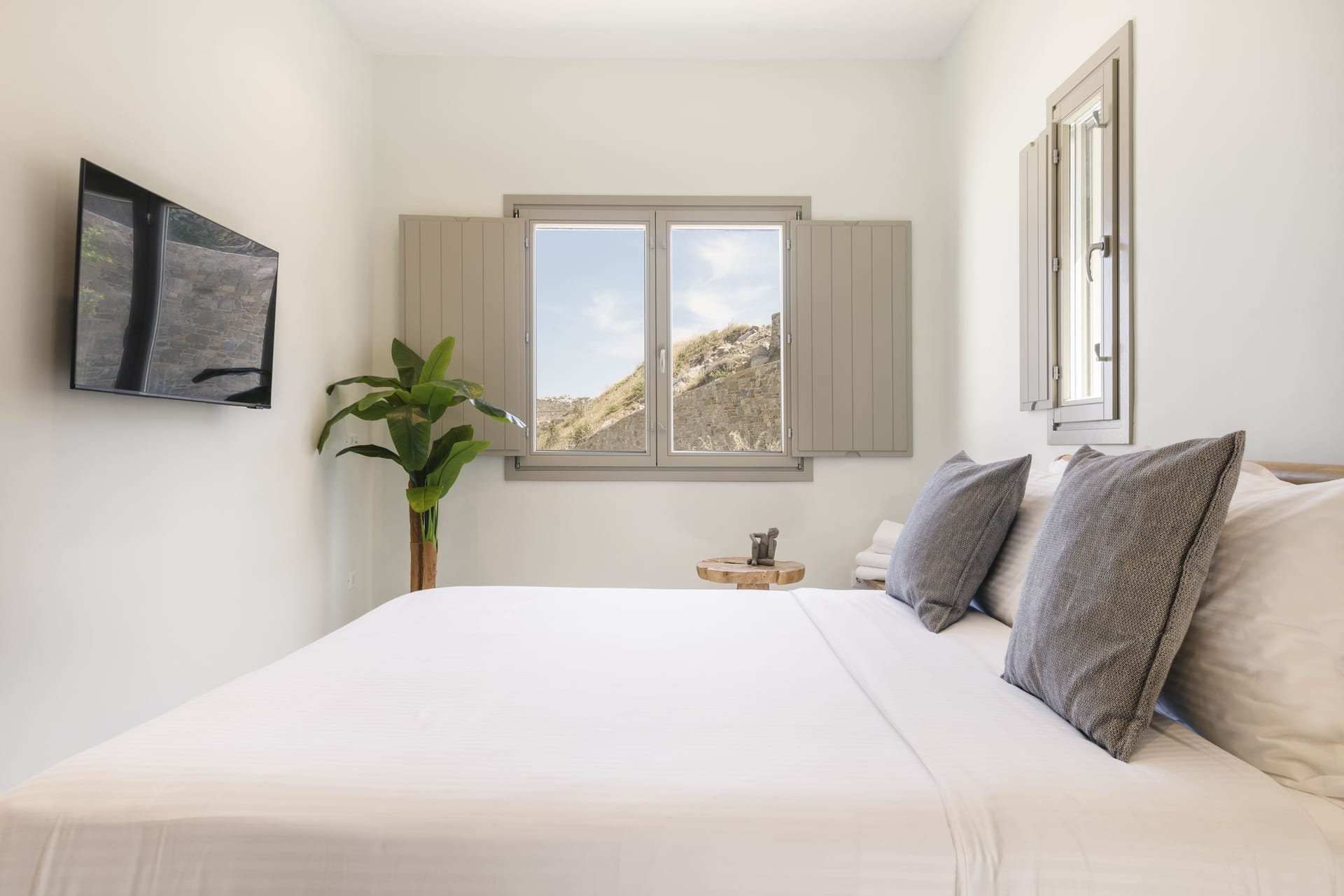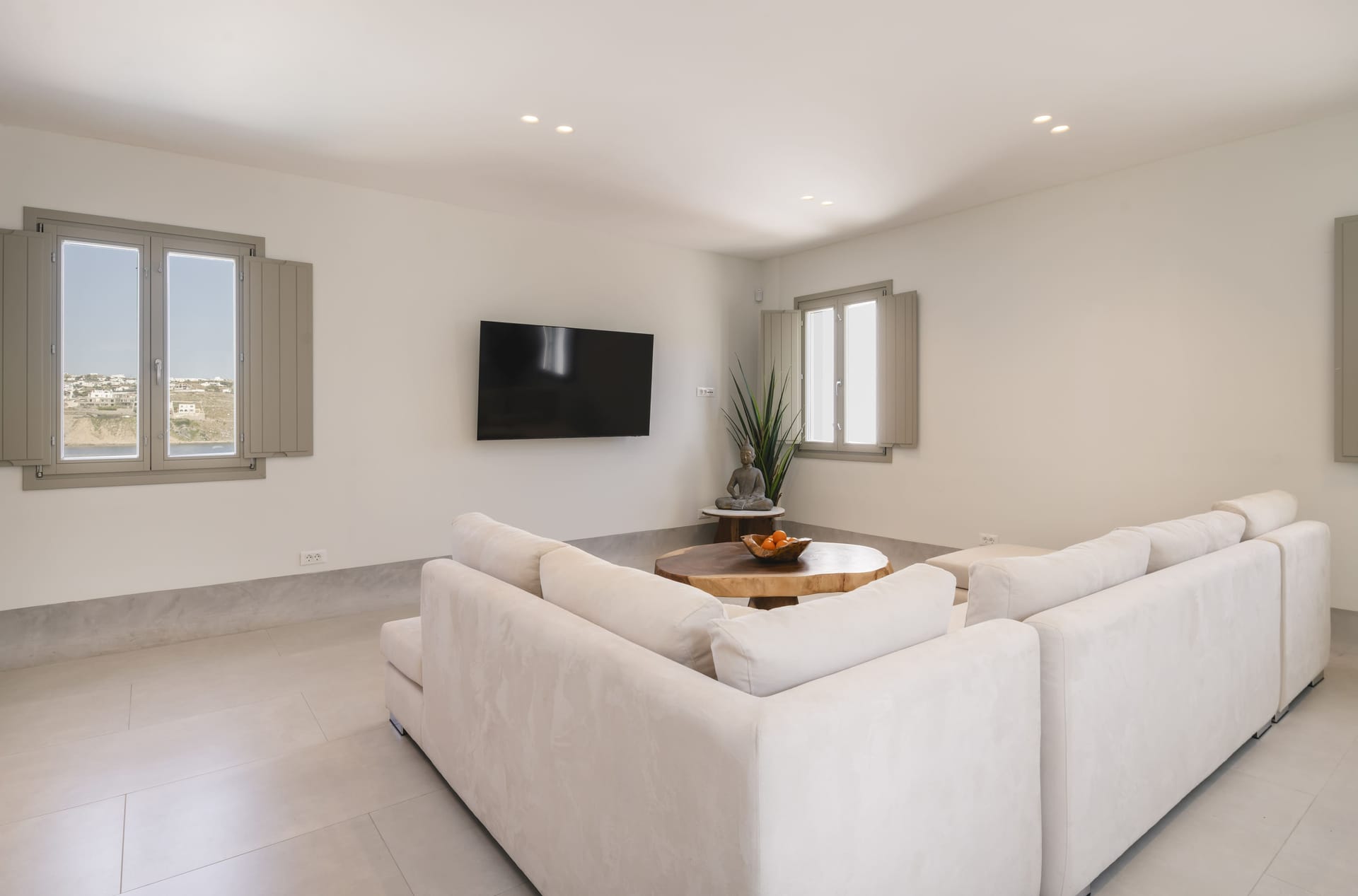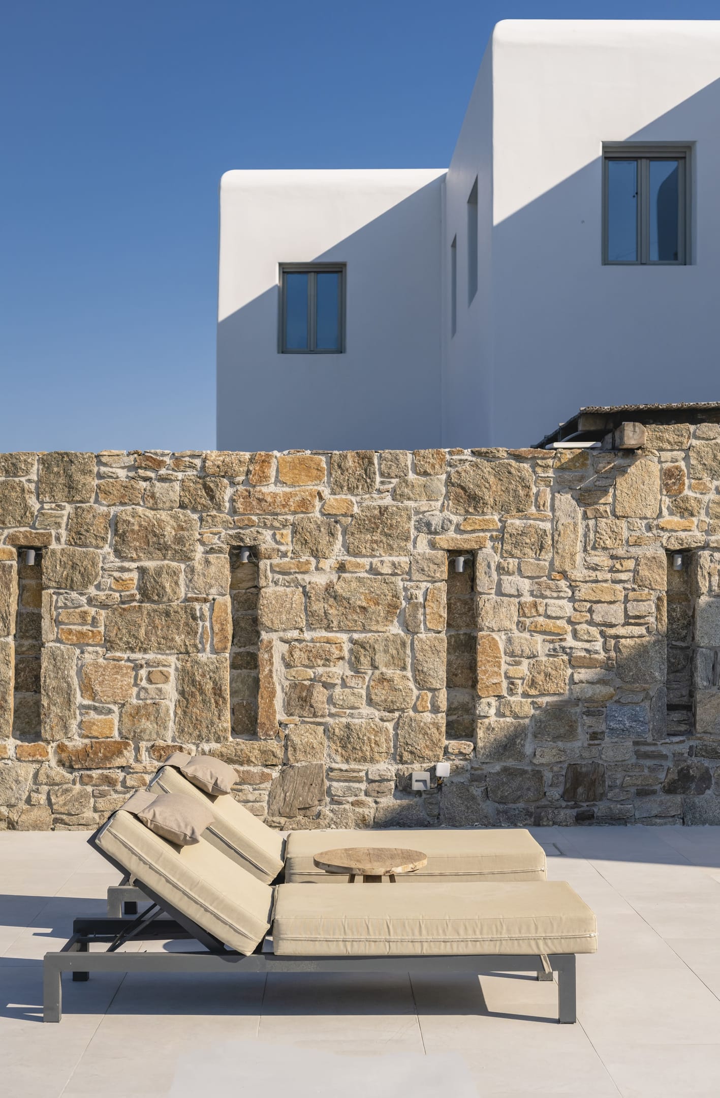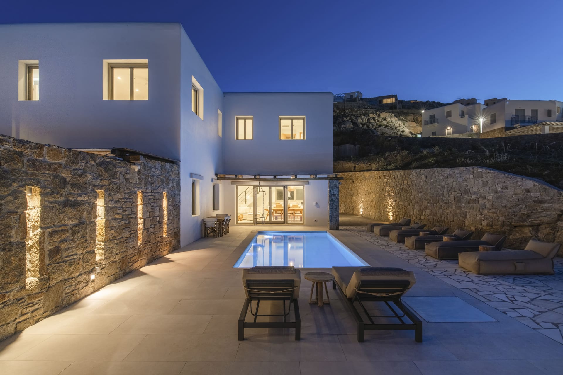 Designed in a modern Mykonian style, Villa Myko Three showcases clean lines and natural colors. Large windows and doors let in plenty of light and connect the indoor and outdoor spaces, offering breathtaking views of the Aegean Sea.