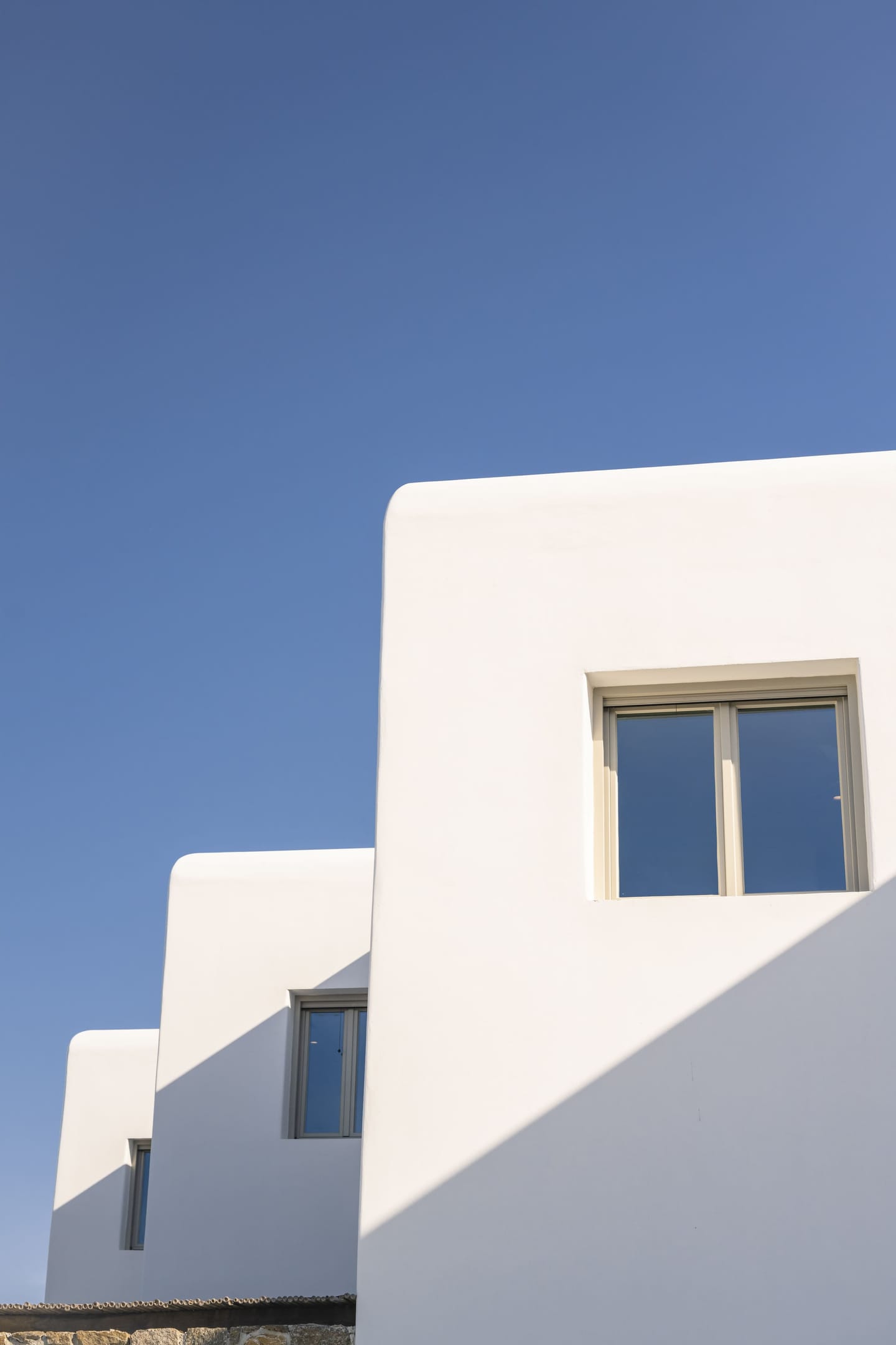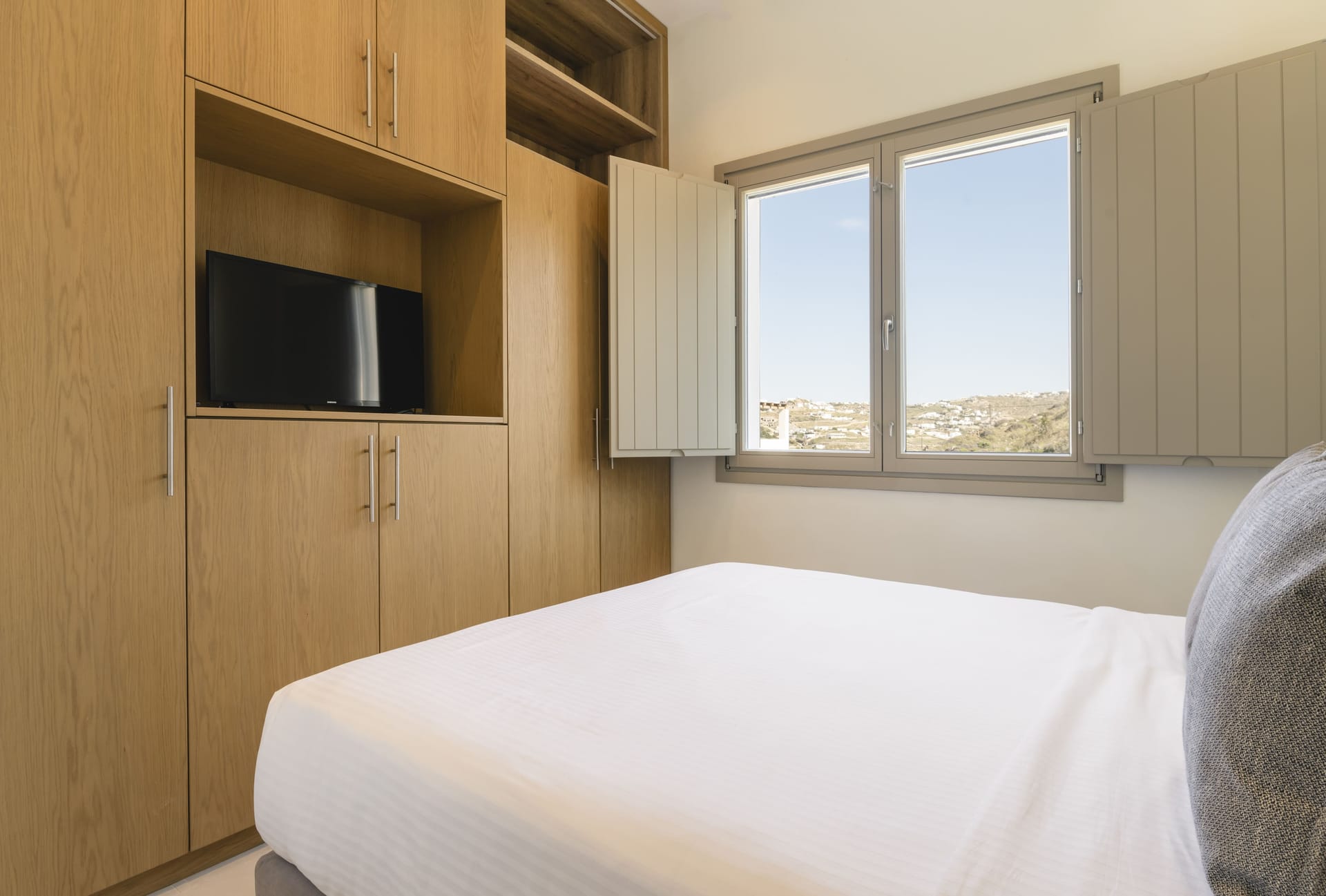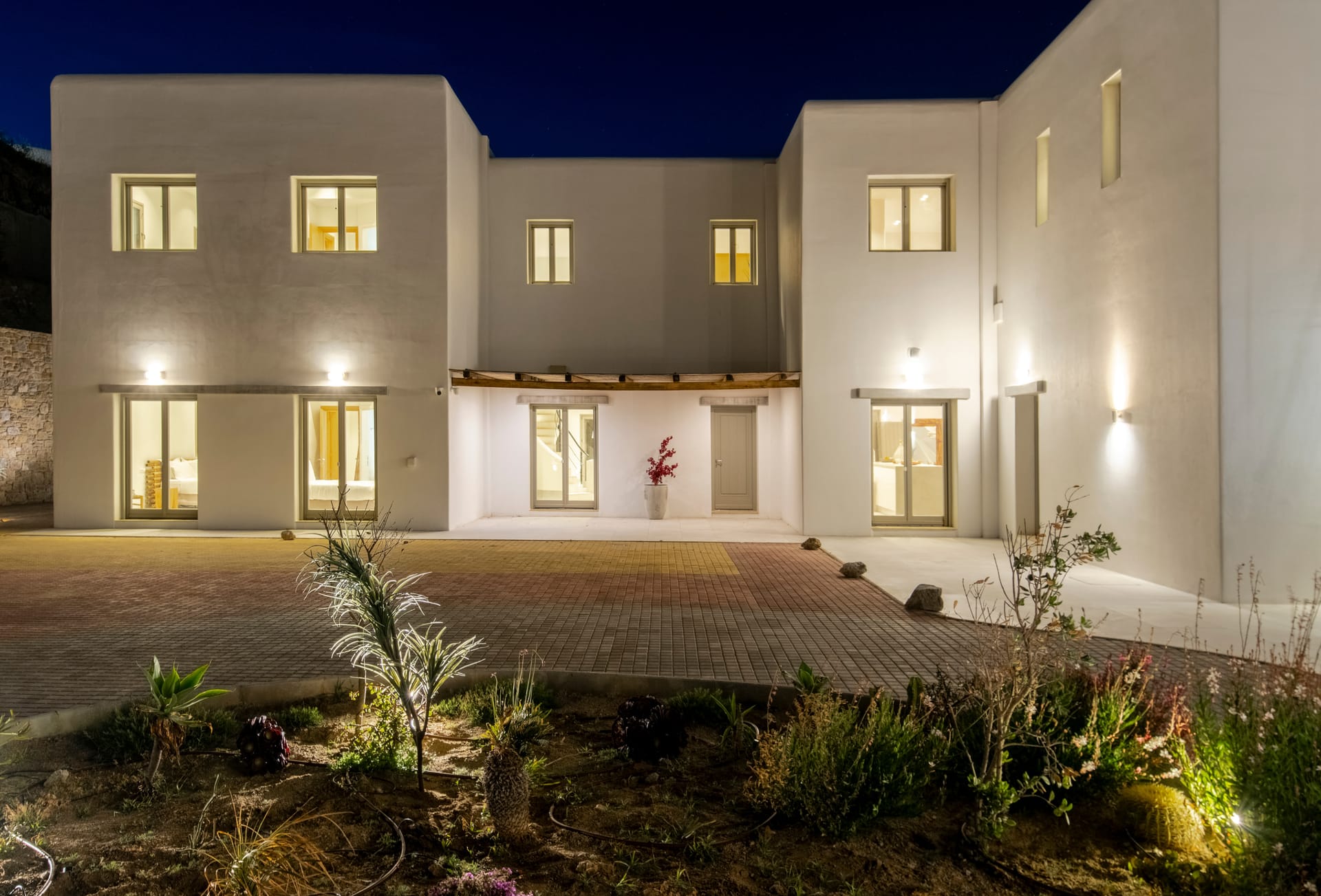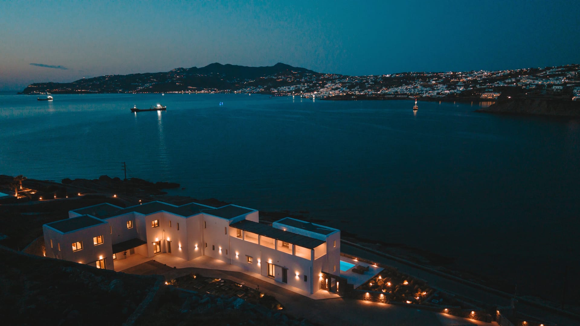 Designed in a modern Mykonian style, Villa Myko Three showcases clean lines and natural colors. Large windows and doors let in plenty of light and connect the indoor and outdoor spaces, offering breathtaking views of the Aegean Sea.