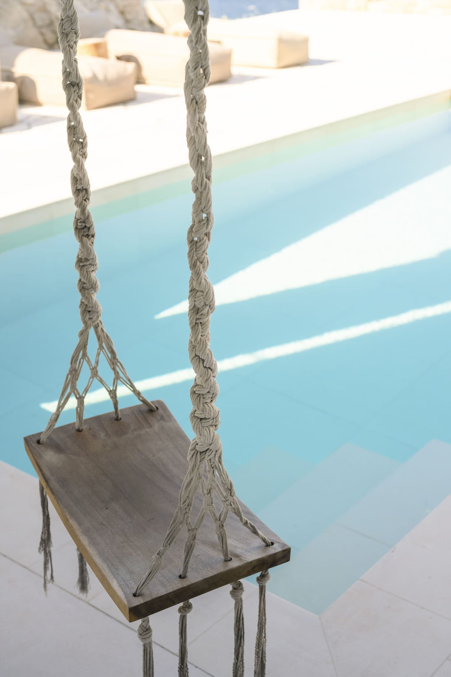 The private pool area is a peaceful spot to swim or relax, surrounded by sun loungers and shaded areas. The villa also includes a fully equipped kitchen, comfortable living spaces, and ample room for dining or spending time with family and friends.