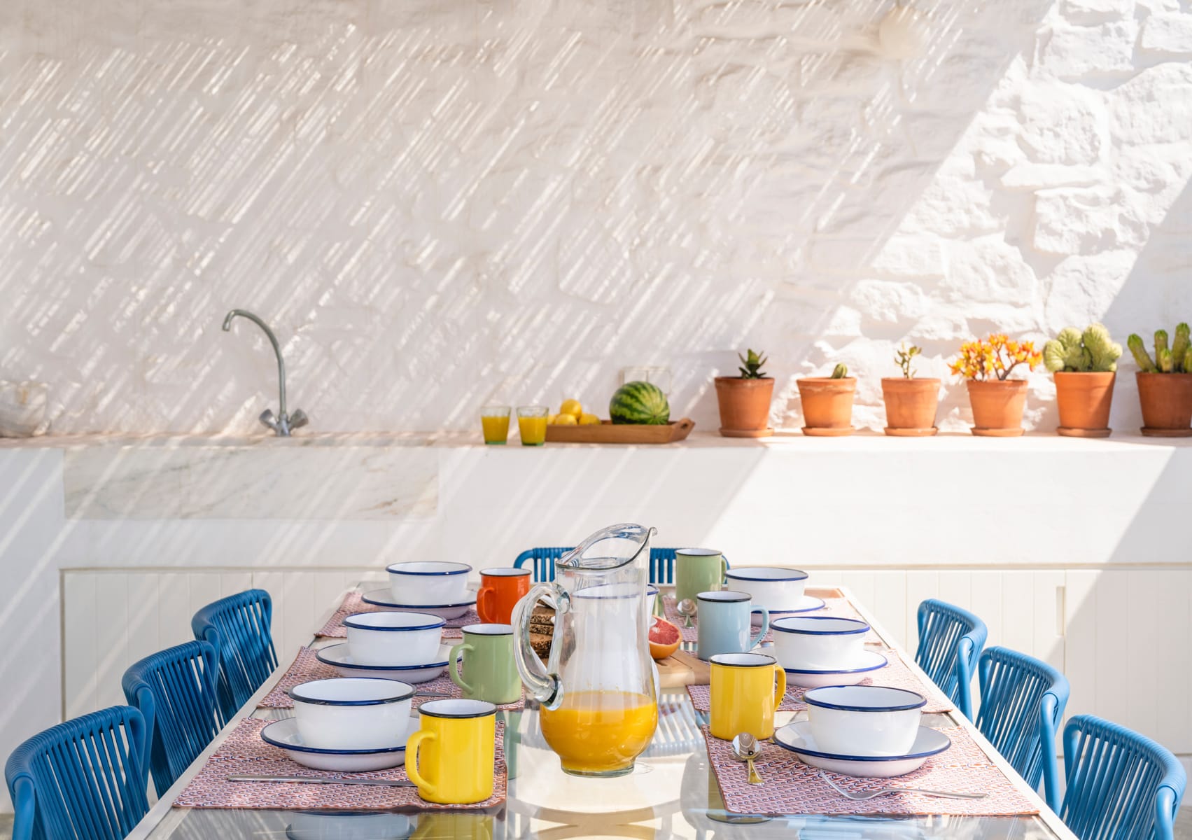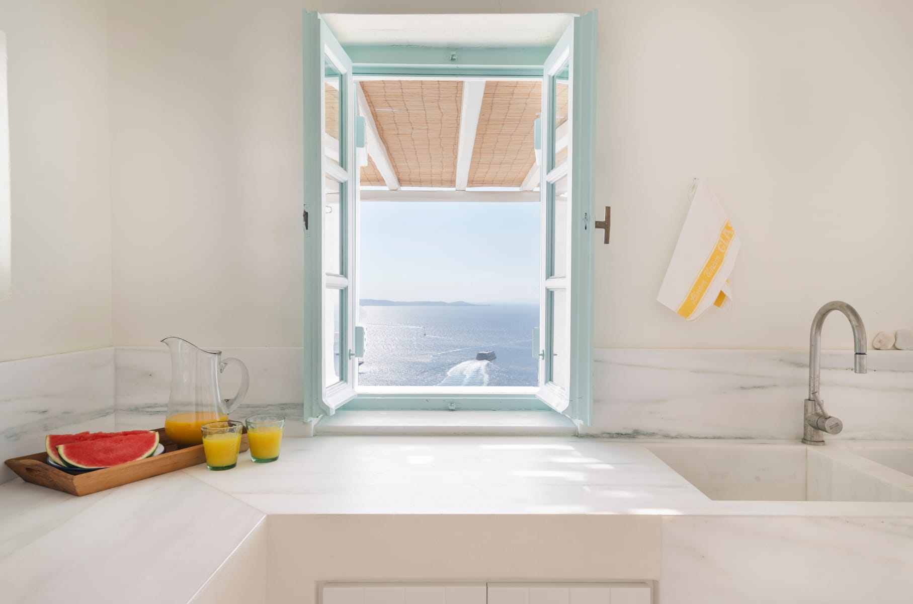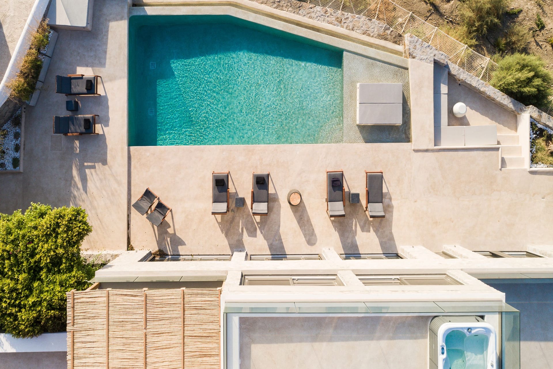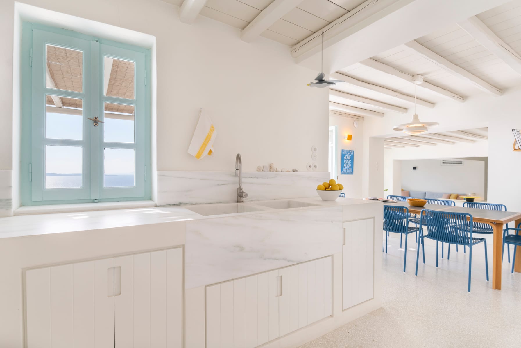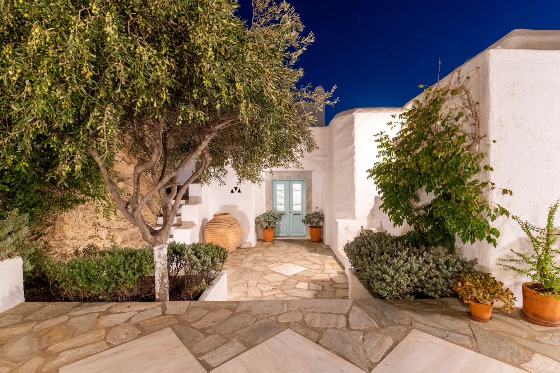 The villa’s cool interiors feature pristine terrazzo floors throughout, rustic wood-carved doors, traditional ceramic tiles and superior local marble for the bathrooms and kitchen. Outside, a variety of terraces, balconies and niches distributed around the property allow for increased privacy even among a large group of guests.